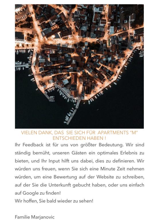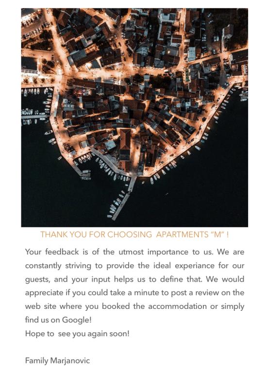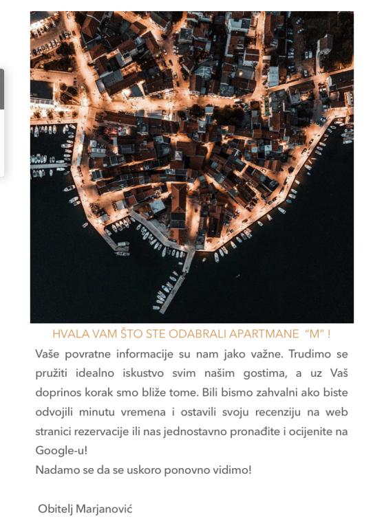 Inlusief wel Toeristenbelasting. Boekingsbevestigingsdocument bij reserveringGeachte gasten, wij willen u erop wijzen dat wij in deze ongebruikelijke situatie die ons heeft betrapt, alle door de deskundige staf voorgeschreven maatregelen hebben genomen. Wij zijn er zeker van dat u zich volgens het advies van het vak heeft voorbereid, zodat uw vakantie onbezorgd kan verlopen. Mocht u toch nog verhinderd zijn op het afgesproken tijdstip aan te komen, dan gaan wij graag met u akkoord om de reserveringsdatum te wijzigen. Het bedrag van het voorschot dat u heeft betaald, staat op de voucher die u tijdens uw toekomstige verblijf kunt gebruiken. Voor aanvullende afspraken staan wij nog steeds tot uw beschikking. Met de wens dat alle volgende dagen zo goed mogelijk voor ons verlopen, heten wij u van harte welkom Appartementen M, Pirovac