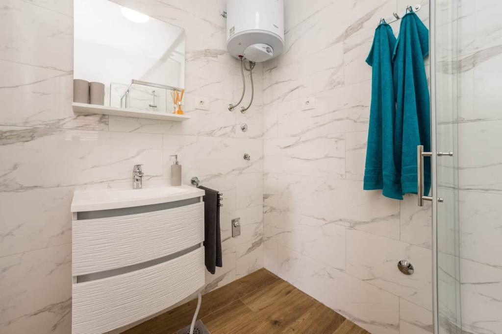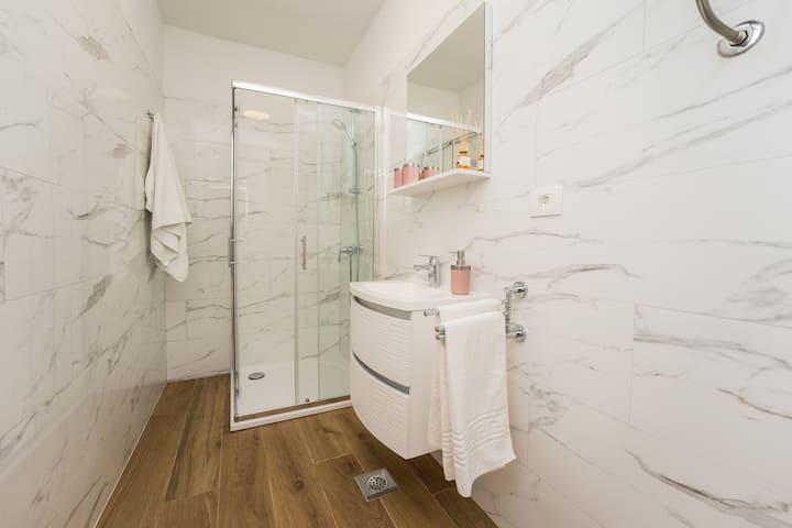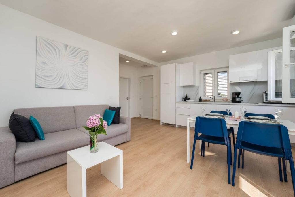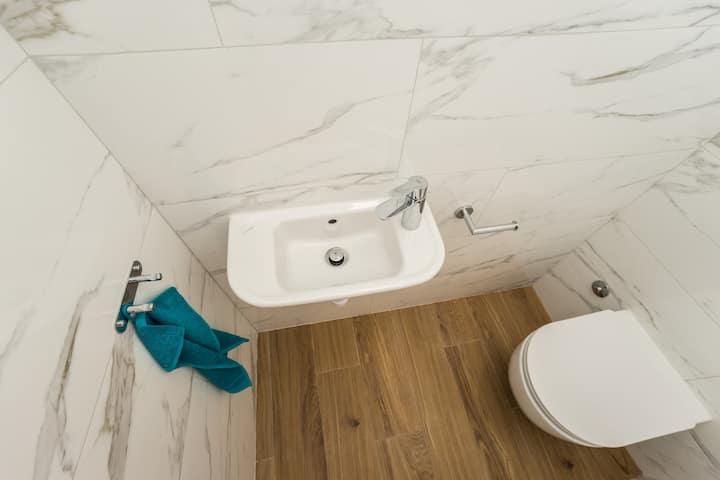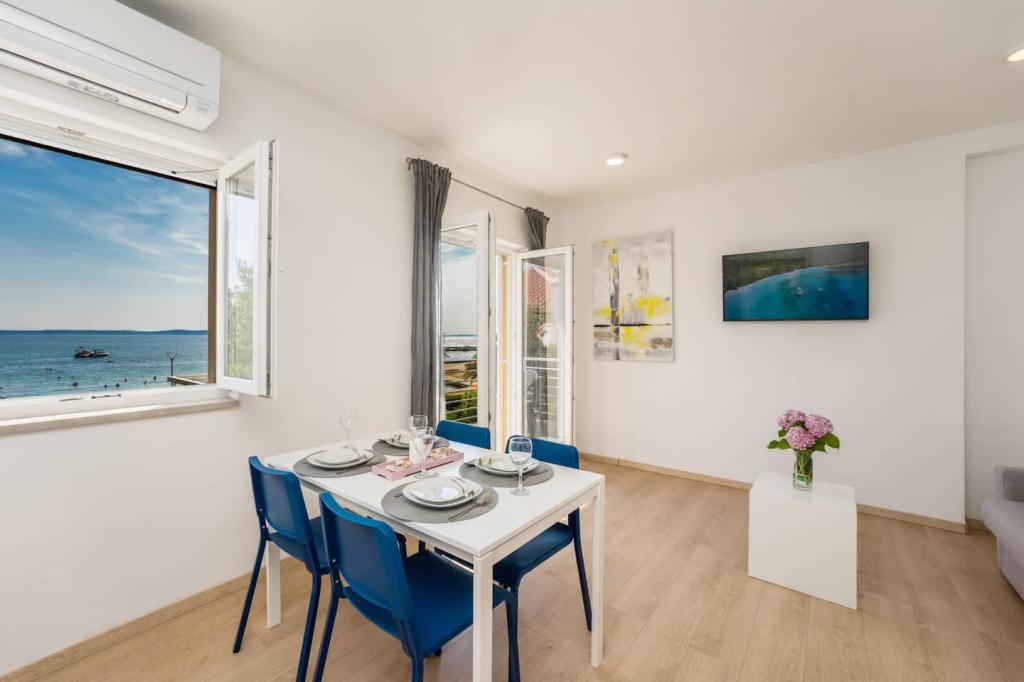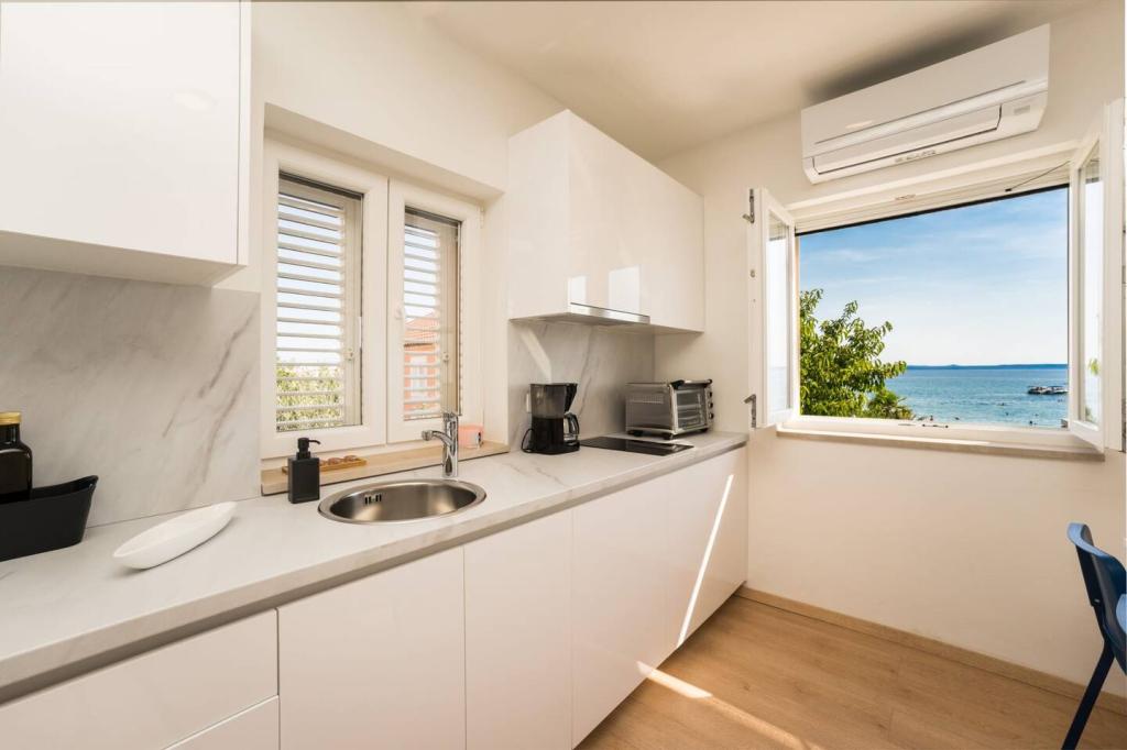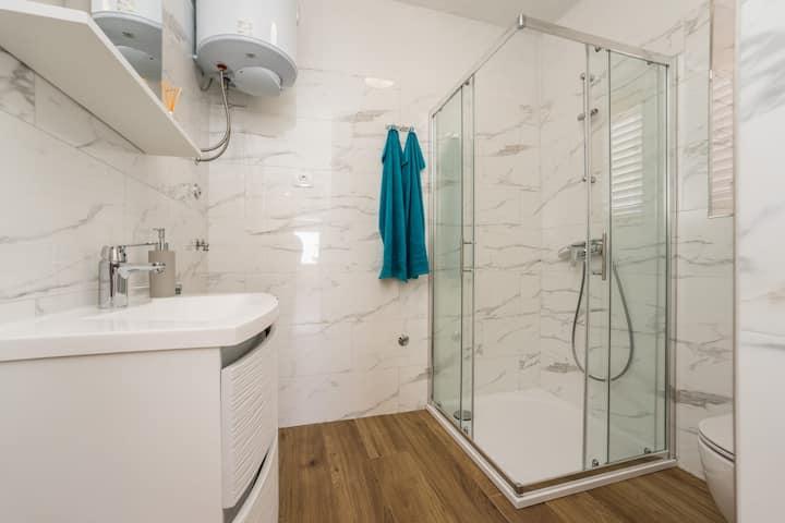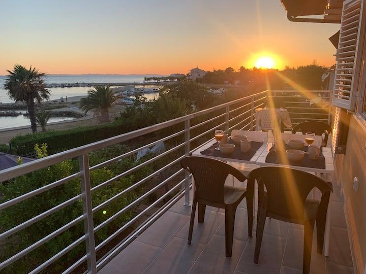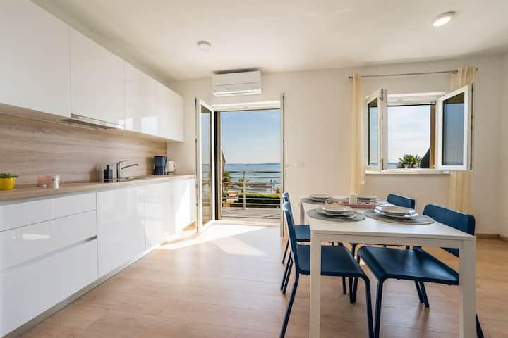 Nieuwe en moderne appartementen in een huis in de directe omgeving van de zee, met een prachtig uitzicht op de zee. Het zandstrand is vlakbij en u kunt voor het huis zwemmen. Er is gratis WiFi beschikbaar, er zijn airconditioners in 2 kamers en er is parkeergelegenheid achter of voor het huis. Er zijn winkels, cafés en restaurants in de buurt. Elk appartement heeft 1 slaapkamer en een bank in de woonkamer. De woonkamer is verbonden met de keuken. Het heeft een badkamer en een apart toilet. Er is een mooi terras met een buitengewoon uitzicht op de zee en een kleine tafel waar u 's ochtends of' s avonds kunt genieten van een ontbijt bij zonsondergang. Geniet van uw ontspannende vakantie in deze prachtige appartementen.