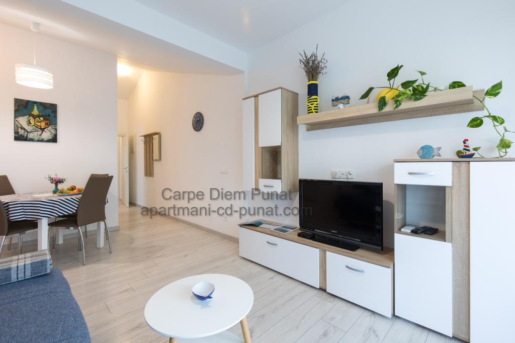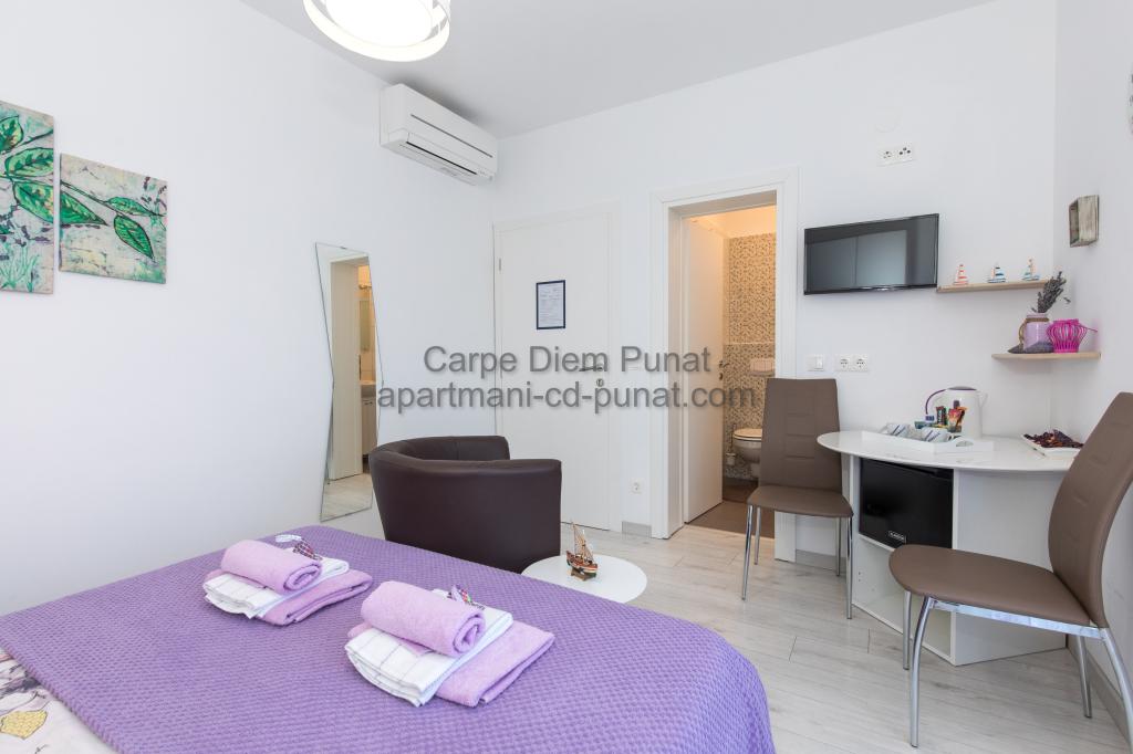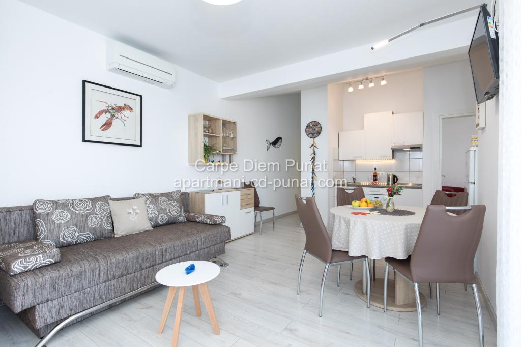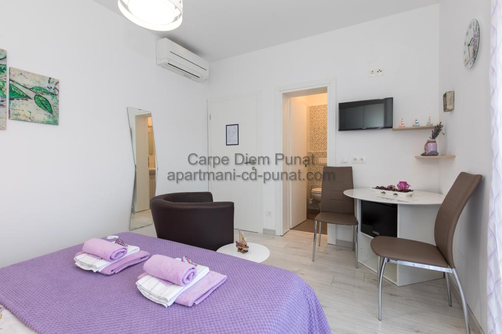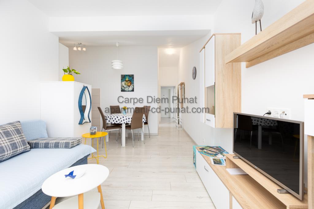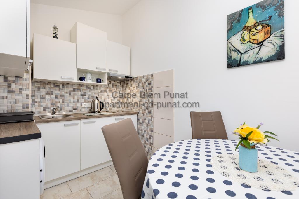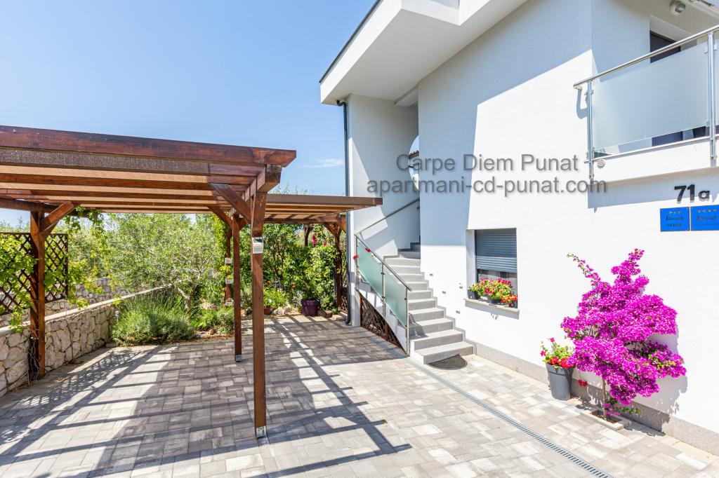 Carpe Diem appartementen zijn gelegen in het dorp Punat dicht bij de prachtige stranden Punat. Wij bieden twee suites en één kamer - de totale maximale capaciteit van 12 personen. De appartementen zijn gelegen op de eerste verdieping van een nieuw huis. Inclusief volledige keukengerei en bestek, koelkast, elektrisch fornuis, magnetron, koffiezetapparaat. Ook zijn de appartementen uitgerust met beddengoed en handdoeken. De prijs is inclusief parkeerplaats, Wi-Fi en airconditioning in alle kamers. Naar het strand heb je 40 meter of 1 minuut afstand. Een ontspannen wandeling van 15 minuten heeft u het centrum van Punat bereiken waar u winkels, apotheek, postkantoor, bank, restaurants, bakkerijen, vis en dergelijke te vinden. In de buurt van het huis is een restaurant lawaai.