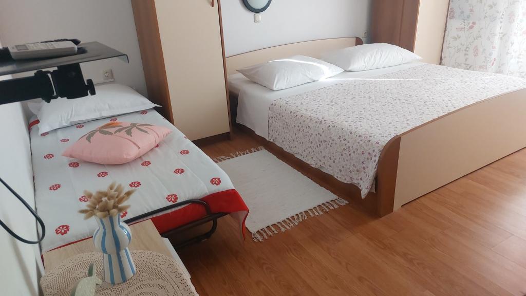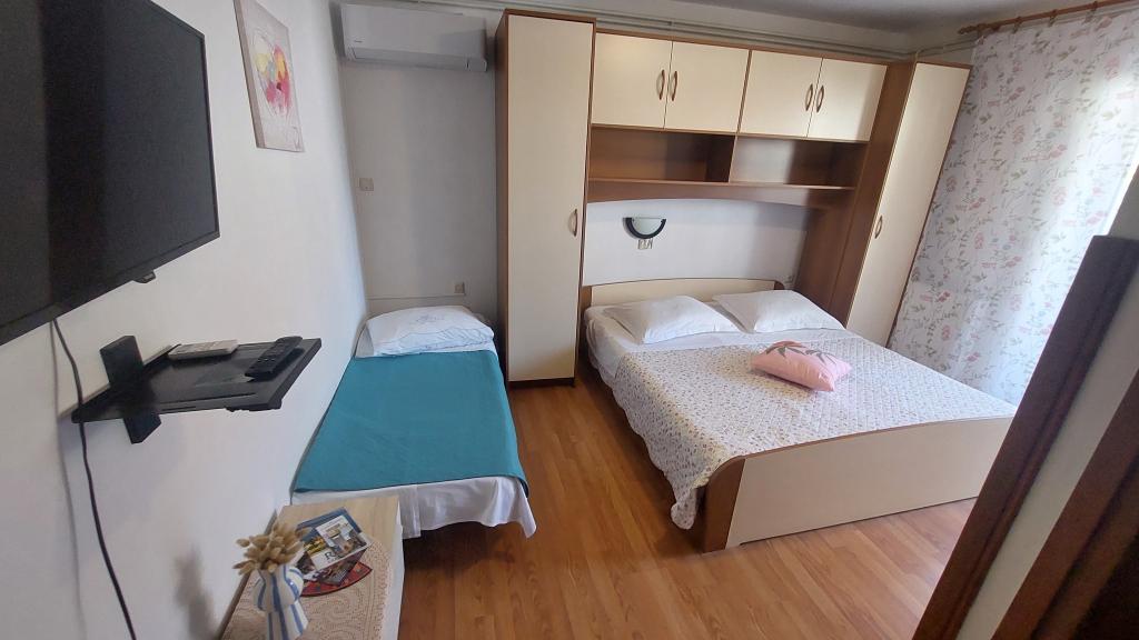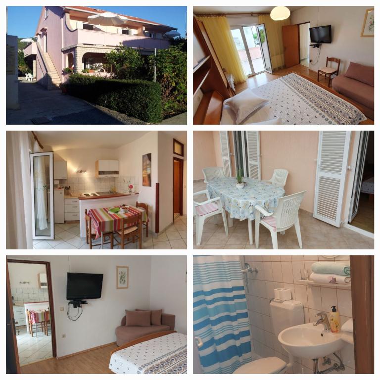 Wij verhuren volledig uitgeruste appartementen met airconditioning (voor 2-5 personen) + SAT/LCD TV, elk met een eigen terras of balkon + parkeerplaats in de tuin en snel internet. Wij bieden ook kamers met airconditioning voor 2-3 personen, elk met een eigen terras, toilet/toilet en de mogelijkheid om gebruik te maken van een volledig uitgeruste keuken, eetkamer (SAT/LCDTV) en een aangenaam buitenterras met tuinmeubilair. Wij zijn gelegen nabij een prachtig zand-kiezelstrand (200-250m) en alle andere voorzieningen die nodig zijn voor een zorgeloze en aangename zomervakantie (winkels, restaurants, pizzeria's, strand- en koffiebars, recreatieve voorzieningen, programma's voor kinderen...) . Vanaf het oude stadscentrum van het eiland Rab met zijn rijke geschiedenis zijn we slechts 20 minuten lopen langs een prachtige promenade langs de zee.