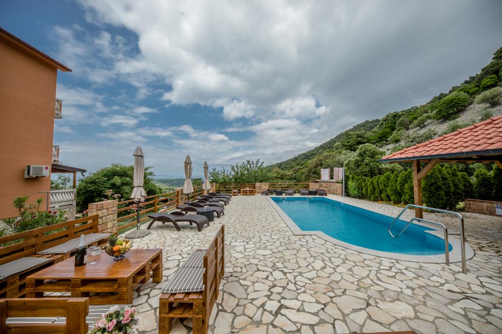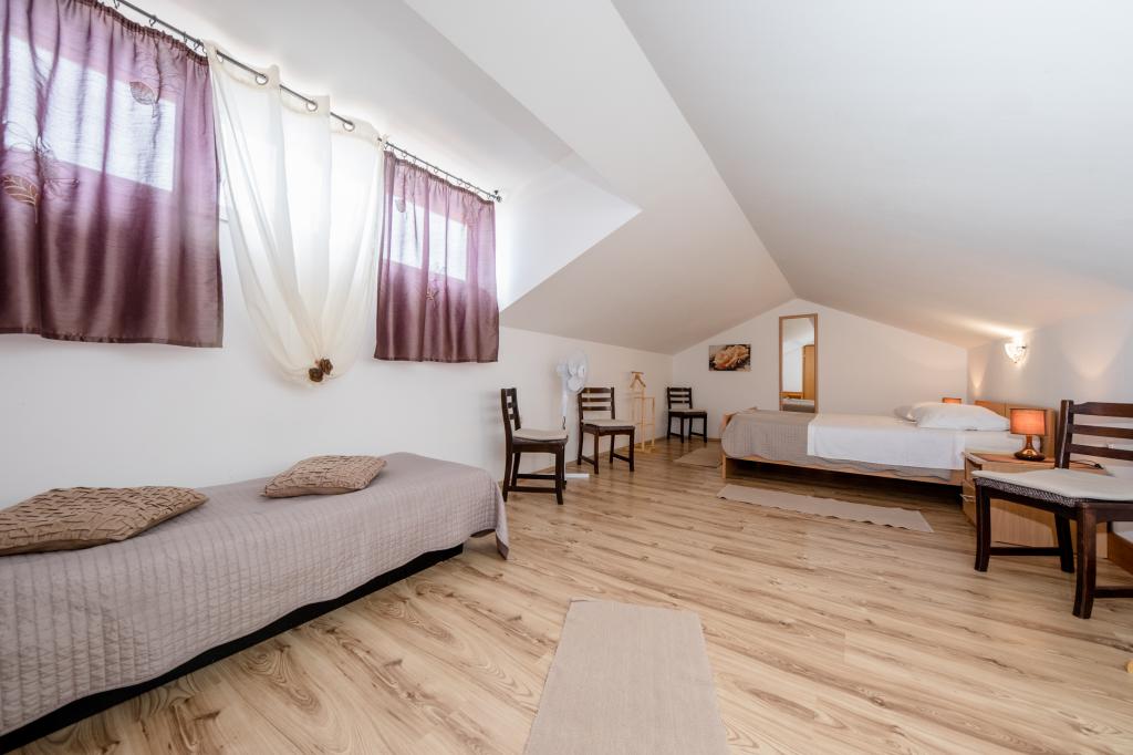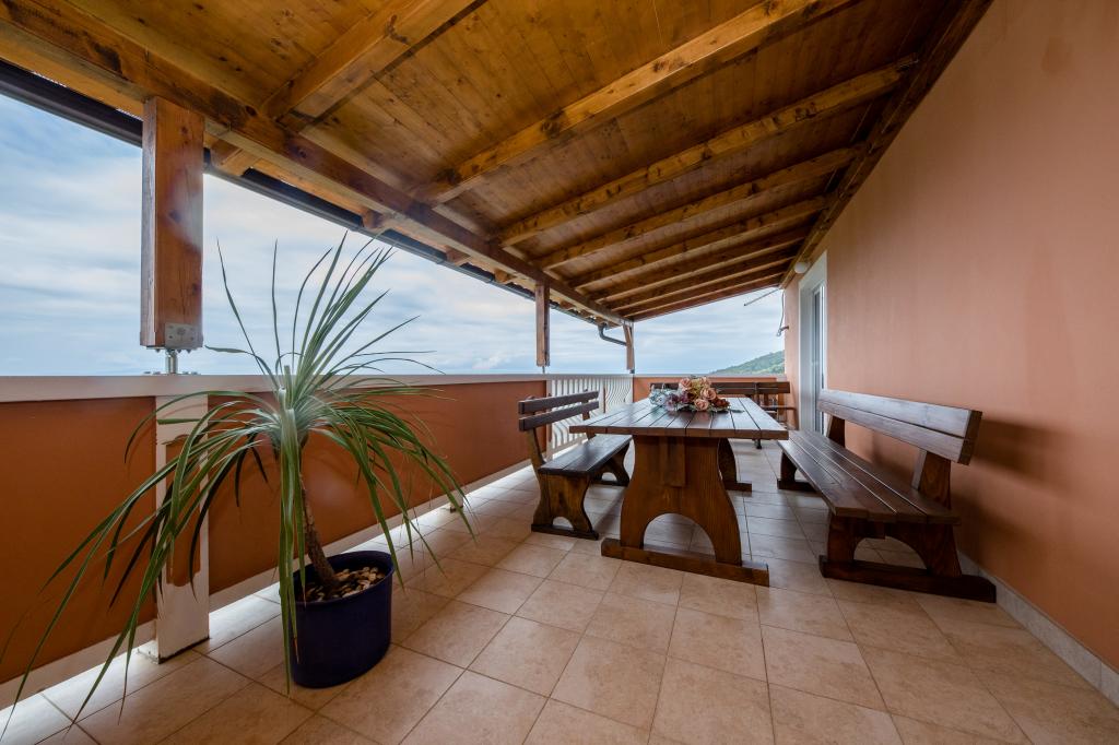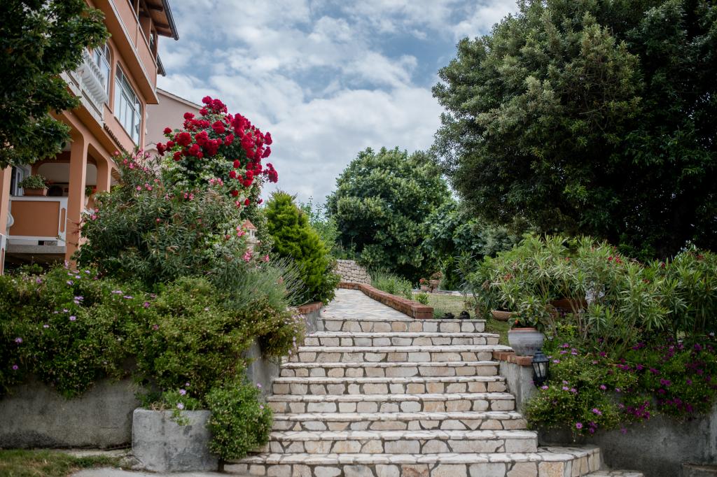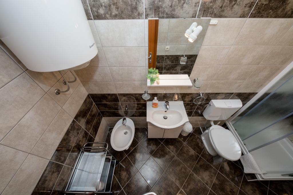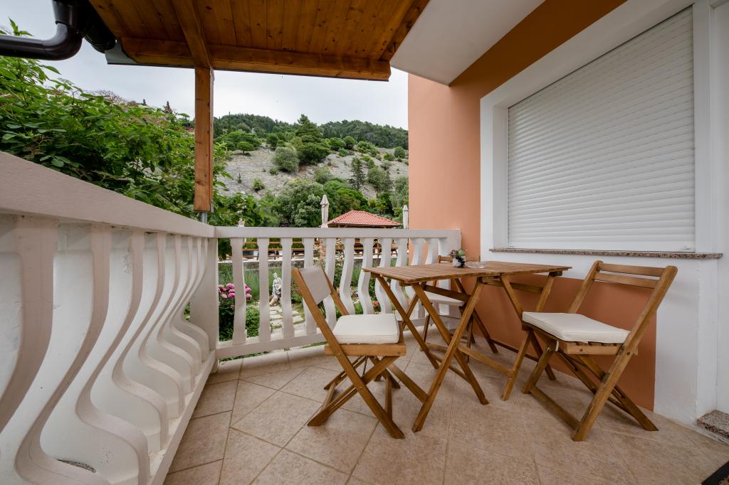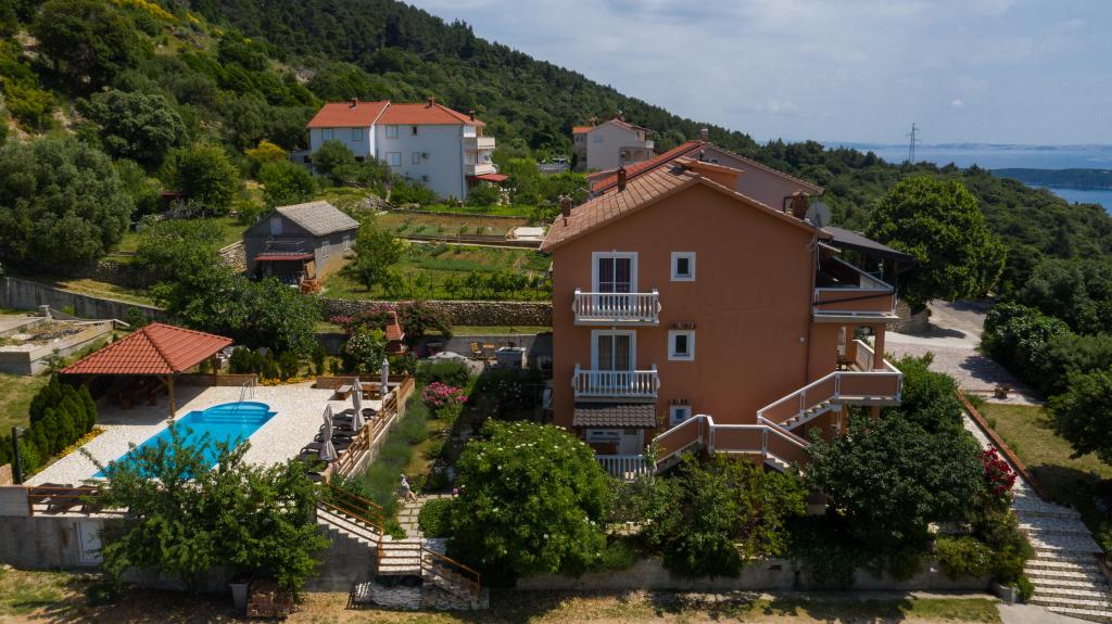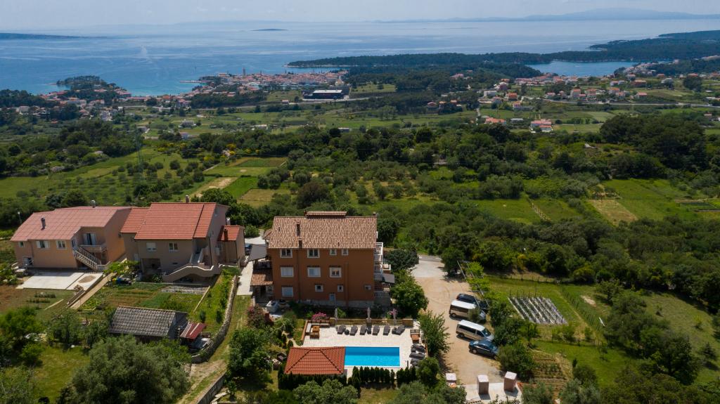 Modern ingerichte appartementen op 350 meter boven de zeespiegel in een rustig dorpje in Mundanije op het eiland Rab genaamd Šćerba. De faciliteit ligt op ongeveer 2-3 km van de zee, het centrum en alle andere belangrijke locaties, dat is ongeveer 10 minuten met de auto. De ligging van het gebouw biedt vanaf alle terrassen en balkons een prachtig uitzicht over het hele eiland en het grootste deel van de Kvarnerbaai. De rust en niet zo veel verkeer van onze stad biedt een perfecte en ontspannende vakantie in de beschutting van de natuur en heerlijk zonnig zomerweer. Er is een grote parkeerplaats naast het huis, en achter het huis is er een prachtig gemaakt zwembad en een ligweide ernaast.