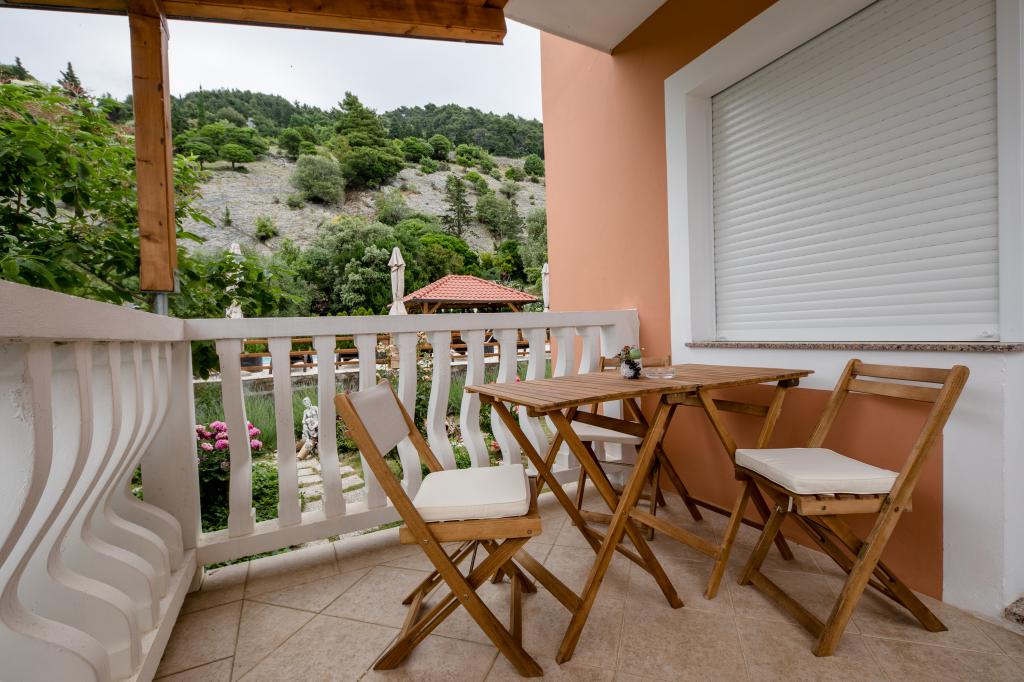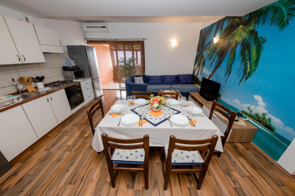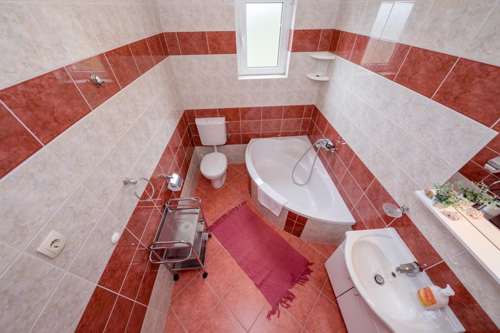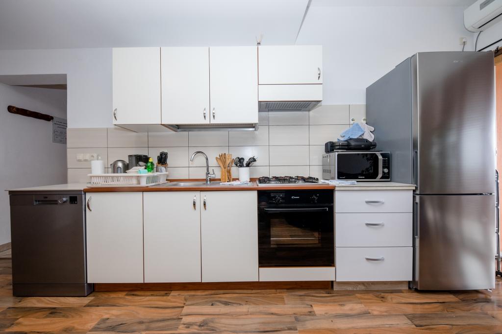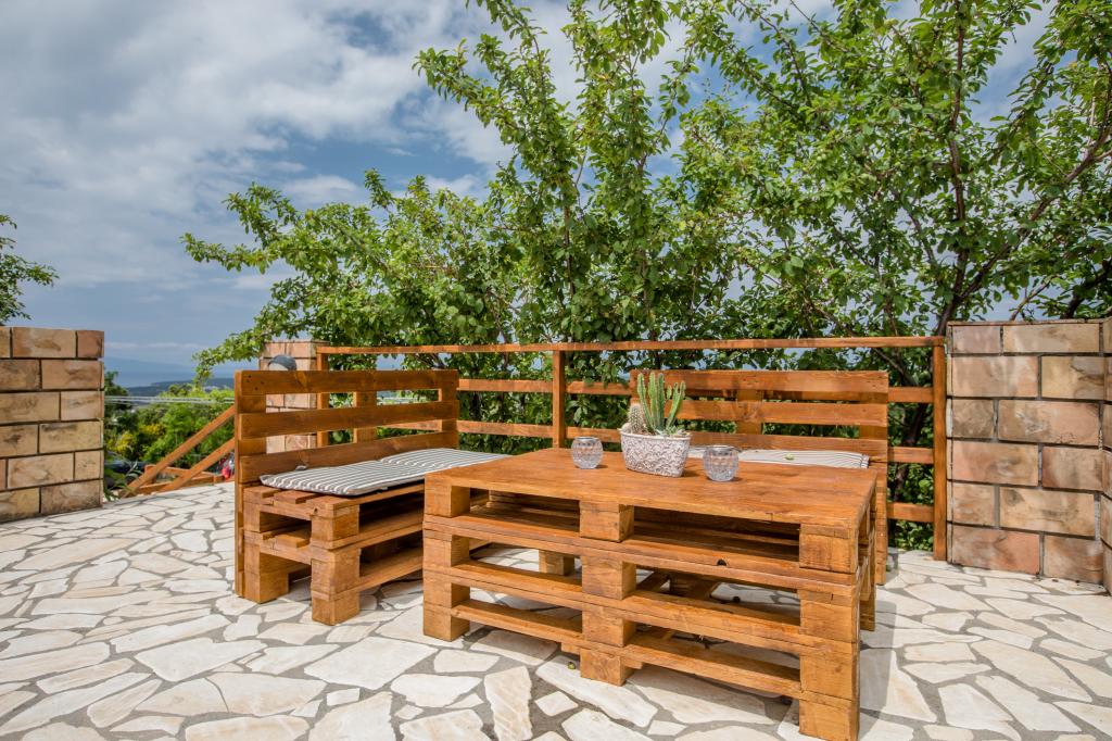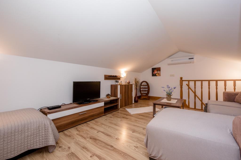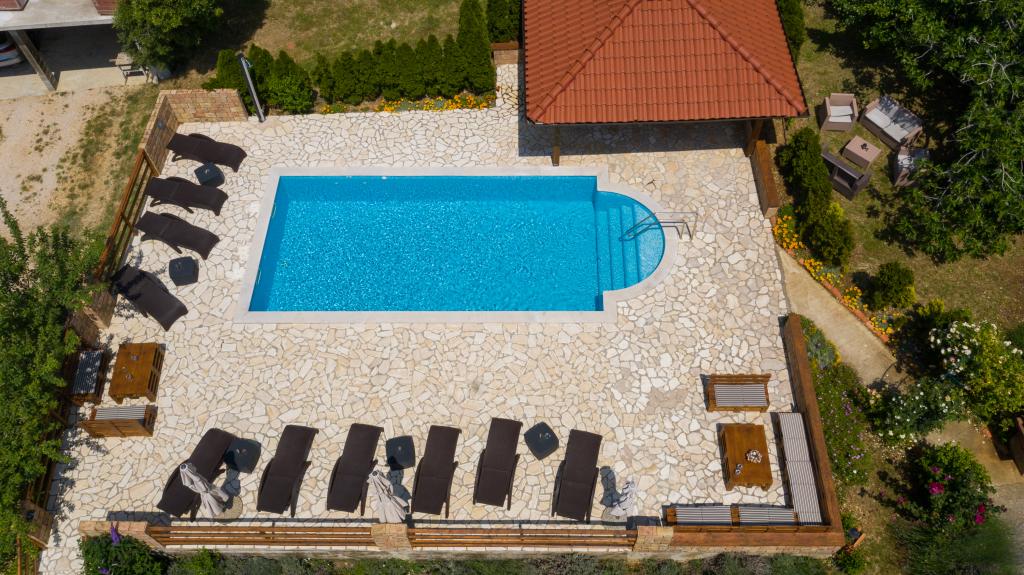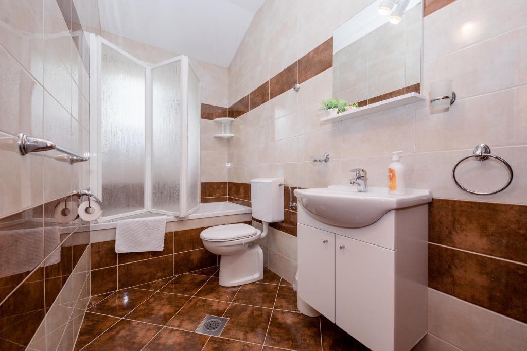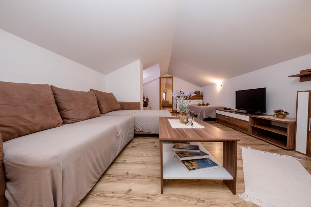 Modern ingerichte appartementen op 350 meter boven de zeespiegel in een rustig dorpje in Mundanije op het eiland Rab genaamd Šćerba. De faciliteit ligt op ongeveer 2-3 km van de zee, het centrum en alle andere belangrijke locaties, dat is ongeveer 10 minuten met de auto. De ligging van het gebouw biedt vanaf alle terrassen en balkons een prachtig uitzicht over het hele eiland en het grootste deel van de Kvarnerbaai. De rust en niet zo veel verkeer van onze stad biedt een perfecte en ontspannende vakantie in de beschutting van de natuur en heerlijk zonnig zomerweer. Er is een grote parkeerplaats naast het huis, en achter het huis is er een prachtig gemaakt zwembad en een ligweide ernaast.