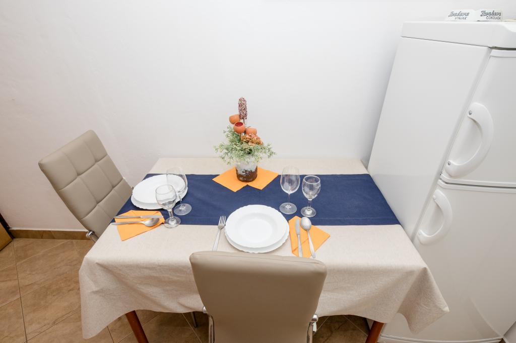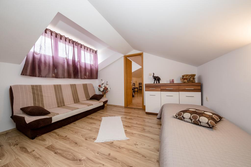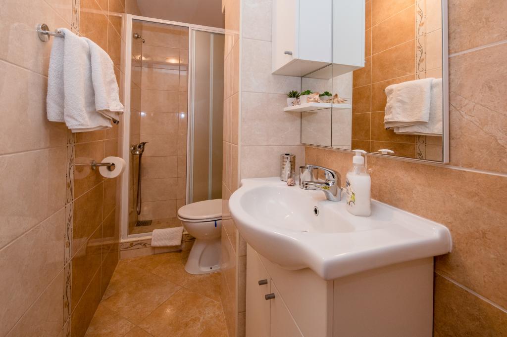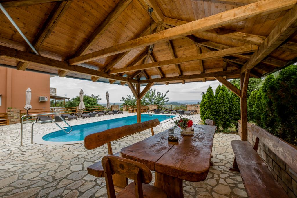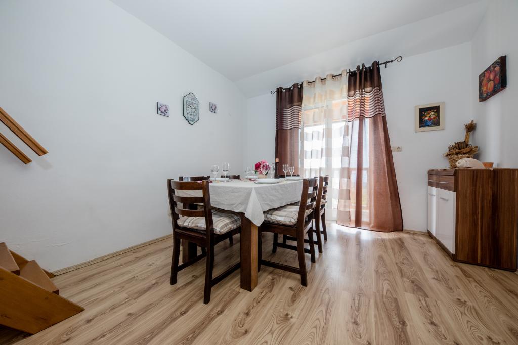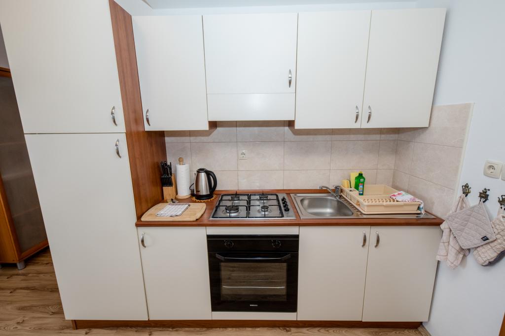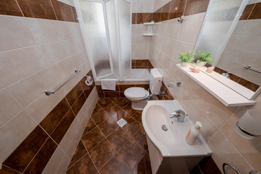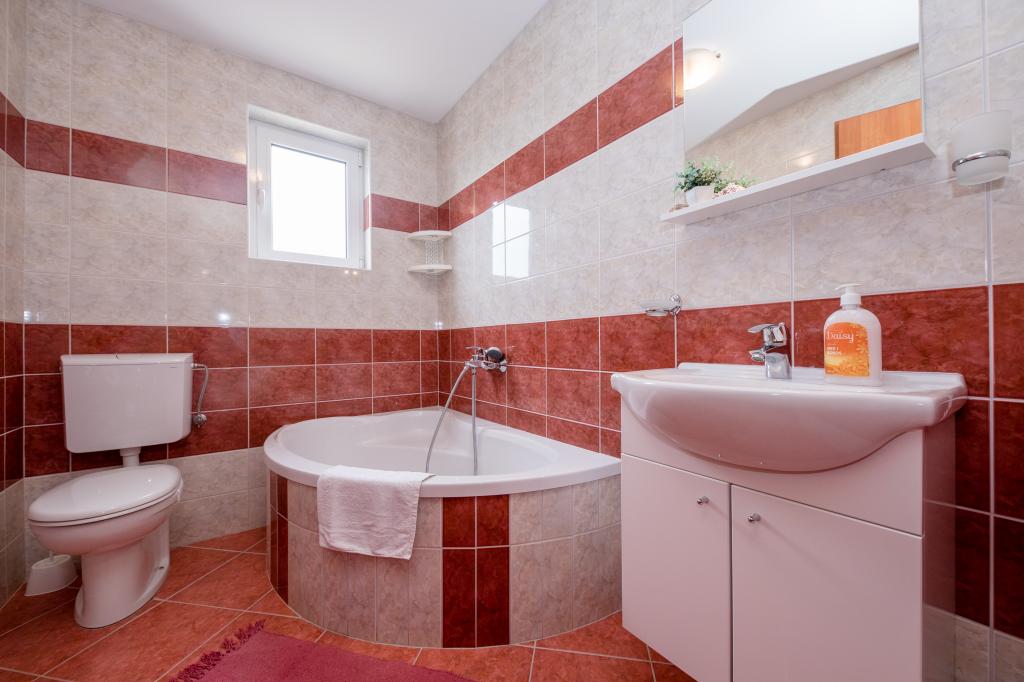 Modern ingerichte appartementen op 350 meter boven de zeespiegel in een rustig dorpje in Mundanije op het eiland Rab genaamd Šćerba. De faciliteit ligt op ongeveer 2-3 km van de zee, het centrum en alle andere belangrijke locaties, dat is ongeveer 10 minuten met de auto. De ligging van het gebouw biedt vanaf alle terrassen en balkons een prachtig uitzicht over het hele eiland en het grootste deel van de Kvarnerbaai. De rust en niet zo veel verkeer van onze stad biedt een perfecte en ontspannende vakantie in de beschutting van de natuur en heerlijk zonnig zomerweer. Er is een grote parkeerplaats naast het huis, en achter het huis is er een prachtig gemaakt zwembad en een ligweide ernaast.
