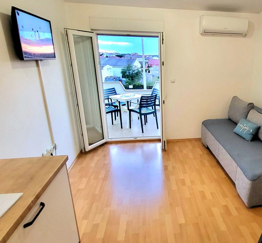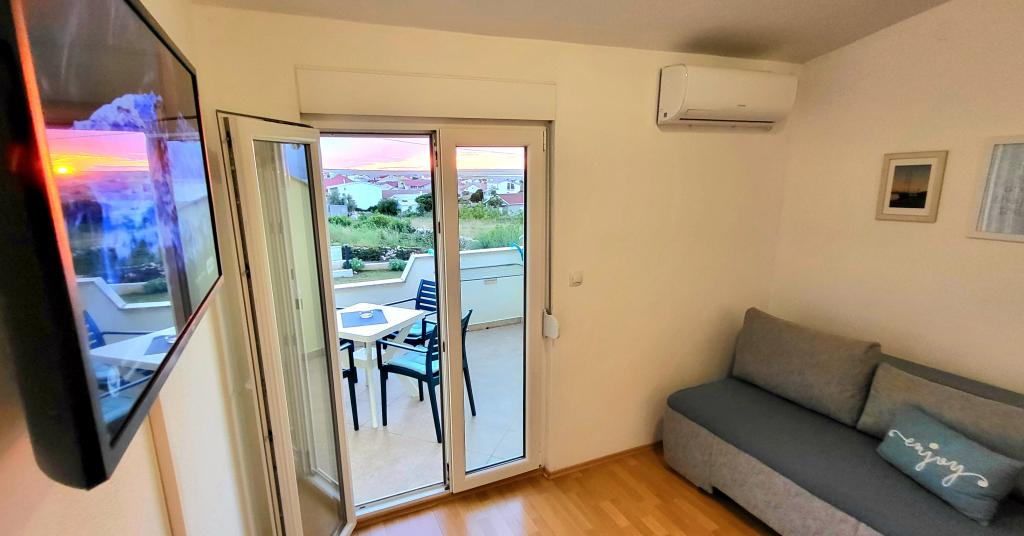 De appartementen bevinden zich op de eerste verdieping van een gezinswoning. Elk appartement bestaat uit een slaapkamer, keuken en woonkamer, hal, badkamer en balkon met prachtig uitzicht op zee en de berg Velebit, en is bedoeld voor max. 4 personen. 4 mensen. Er is een tweepersoonsbed in de slaapkamer en een extra bed in de woonkamer, dat in appartementen A en B geschikt is voor 2 kinderen, terwijl in appartement C een extra bed ook geschikt is voor 2 volwassenen. De appartementen beschikken onder andere over wi-fi, satelliet-tv, airconditioning, strijkijzer en strijkplank. Gasten kunnen ook gebruikmaken van de gemeenschappelijke wasmachine in de garage, evenals de grill en de privéparkeerplaats op de binnenplaats van het huis. Het huis is gelegen in een rustige omgeving zonder veel lawaai en lawaaierig verkeer, en dicht bij alles wat deze plek te bieden heeft, en op slechts 3 minuten loopafstand van het strand, ideaal voor volledige ontspanning en genieten van uw jaarlijkse vakantie.