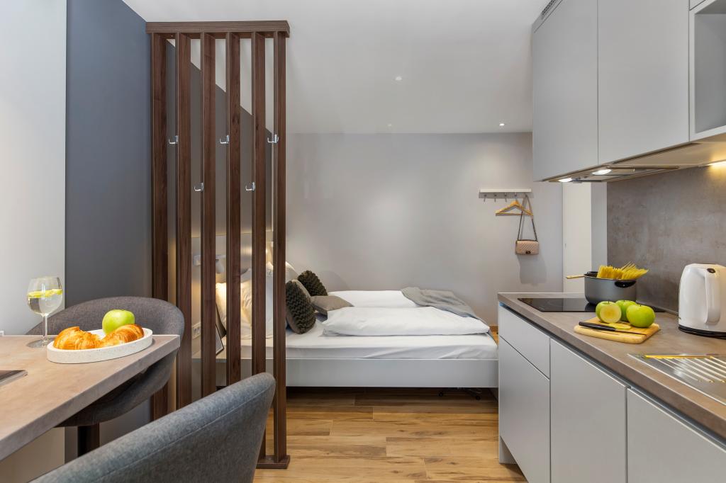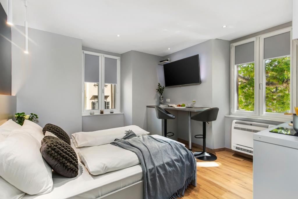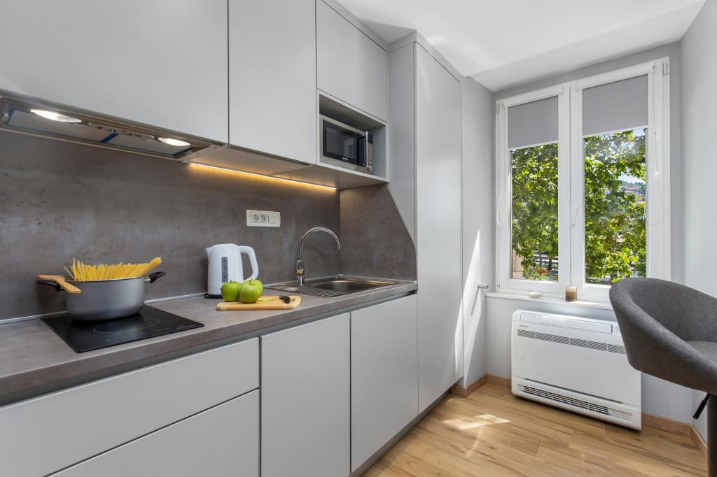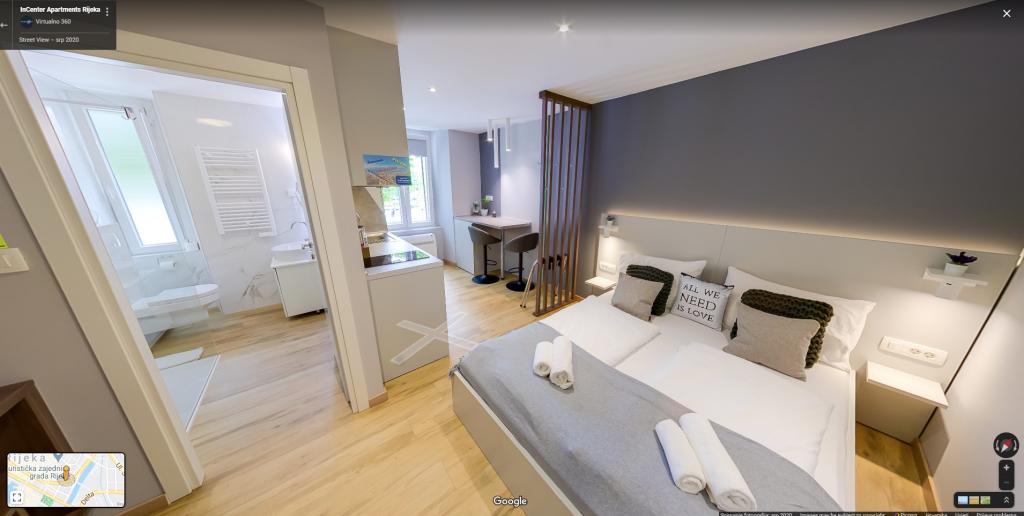 InCenter Apartments Rijeka liggen in het hart van Rijeka, direct naast Korzo, op een ideale locatie voor gasten die overal dichtbij willen zijn en de stad te voet willen verkennen. Studio-appartementen in het centrum van Rijeka – zelf inchecken, direct naast Korzo. Onze modern ingerichte studio is perfect voor stellen, individuele reizigers en zakelijke gasten die op zoek zijn naar een comfortabel, praktisch en gemakkelijk verblijf in het stadscentrum. Een groot voordeel is het zelf inchecken via PIN, wat zorgt voor een snelle, flexibele en zorgeloze aankomst. Het appartement biedt alles wat u nodig heeft voor een aangenaam verblijf: een kingsize bed en een prettige open indeling, een volledig uitgeruste keuken met vaatwasser, koelkast, magnetron, waterkoker, koffiezetapparaat en keukengerei, een moderne badkamer met inloopdouche en haardroger, airconditioning, tv met MaxTV IPTV, Netflix en snelle wifi, parkeergelegenheid in de buurt, restaurants, winkels, openbaar vervoer en de belangrijkste bezienswaardigheden van de stad op slechts een steenworp afstand van het appartement. Het appartement bevindt zich op de 2e verdieping (geen lift). Als u op zoek bent naar een modern studio-appartement in het centrum van Rijeka met een fantastische locatie, goede bereikbaarheid en alles wat u nodig heeft voor een kort verblijf of zakenreis, dan zijn de InCenter Apartments een uitstekende keuze. Bekijk de virtuele 360°-rondleiding op Google en vind meer informatie op www.incenter.com.hr