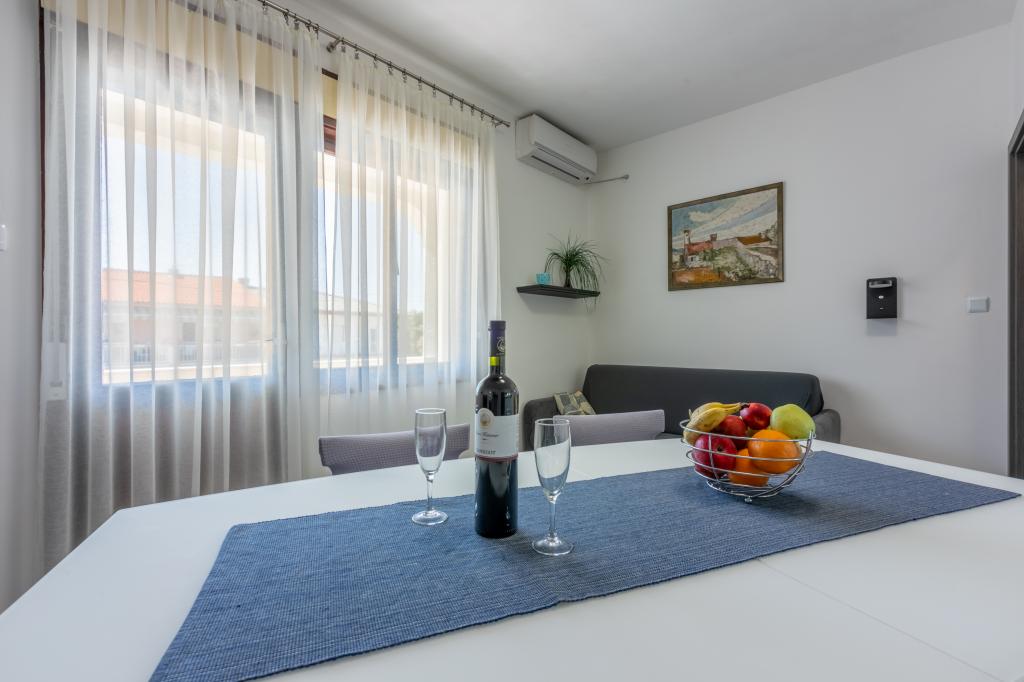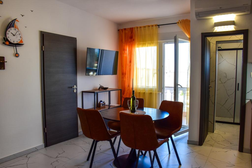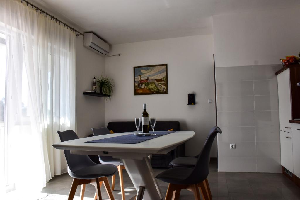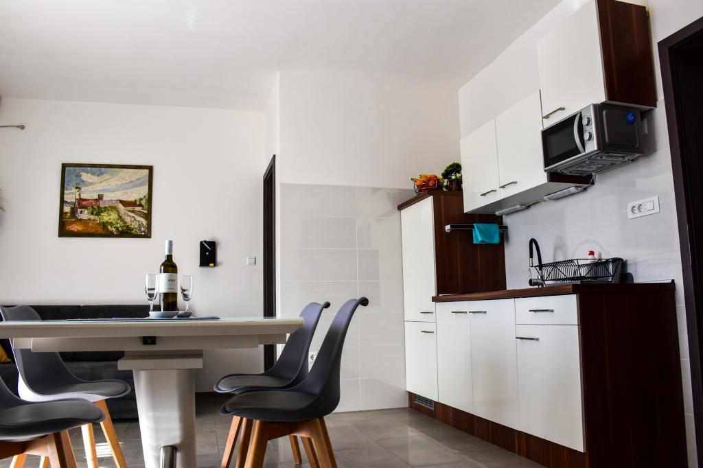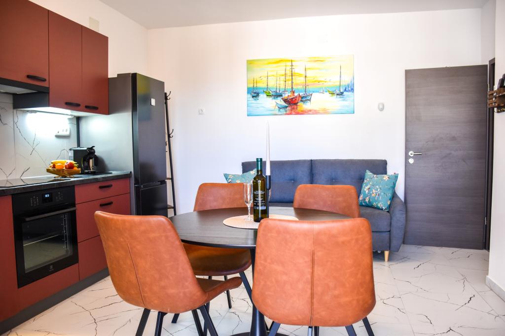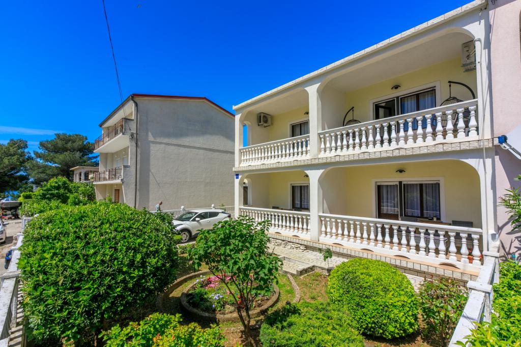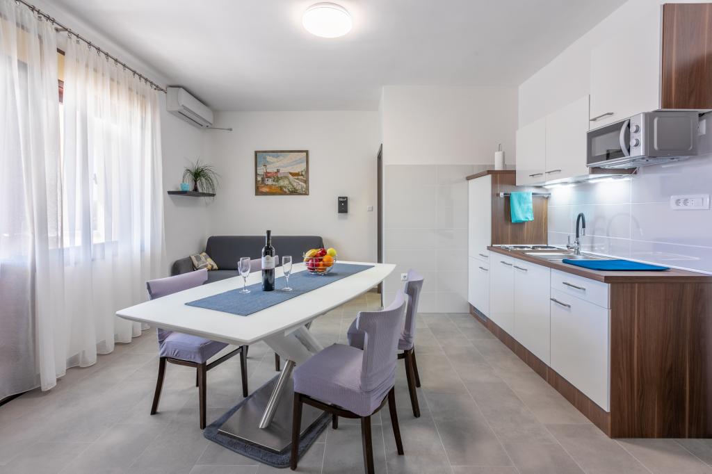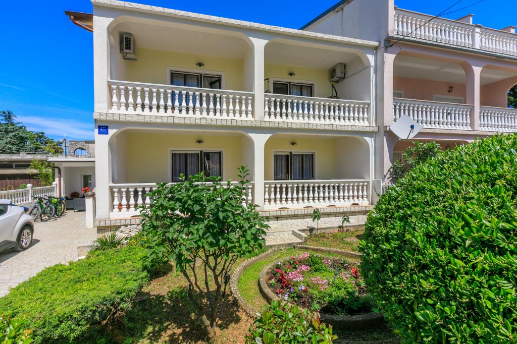 De appartementen bevinden zich in een gezinswoning, op een paar minuten lopen van de zee en de boulevard met een aantal restaurants, cafés, sportfaciliteiten en winkels. Het appartement "Ema" (2+2) bestaat uit een tweepersoonskamer, een keuken met eetkamer waar een tweepersoonsslaapbank staat die kan worden uitgeklapt tot een tweepersoonsbed, een badkamer en een ruim terras met barbecue. Het tweede appartement "Gita" (2+1) heeft een tweepersoonsslaapkamer, een ruime keuken met eetkamer met slaapbank, een badkamer en een ruim terras.