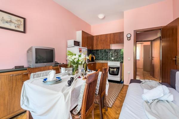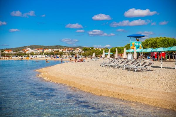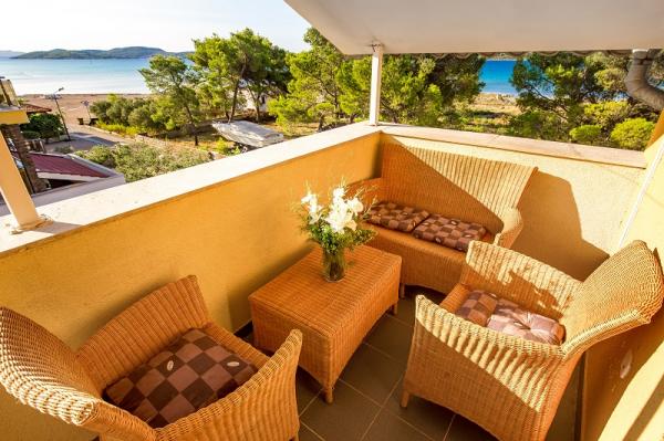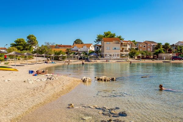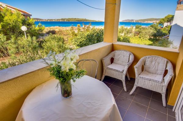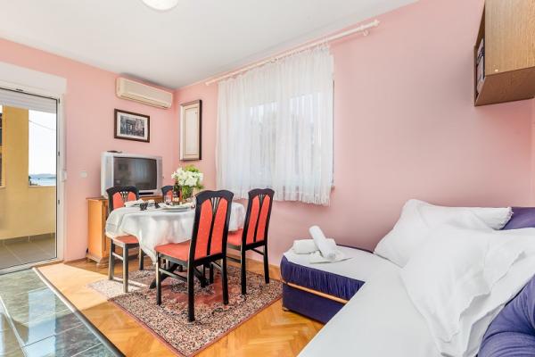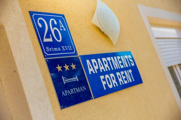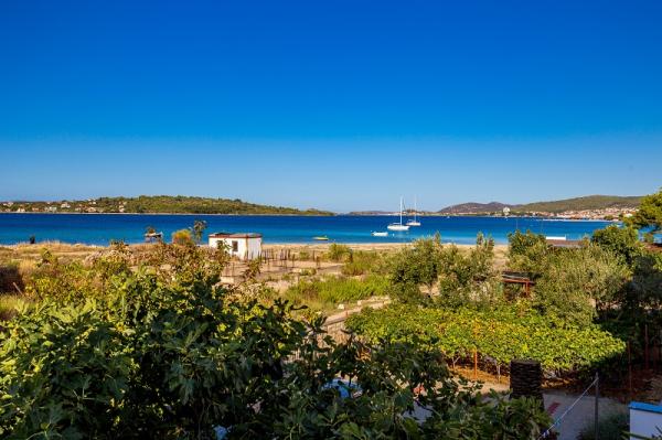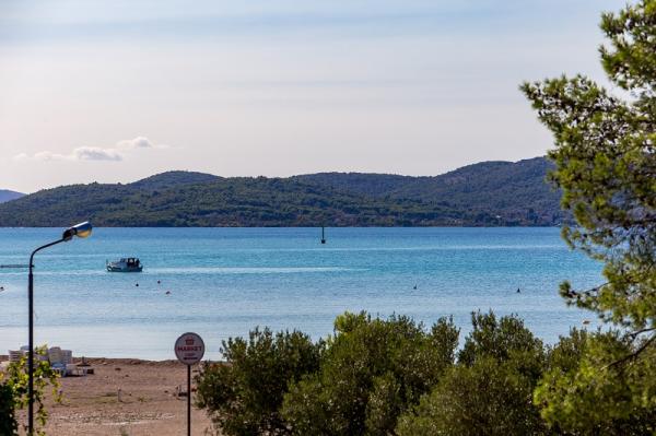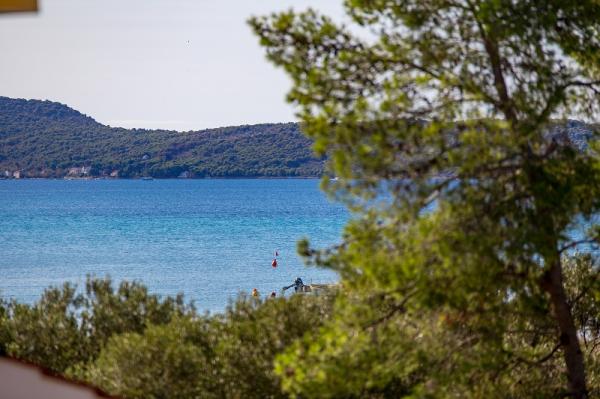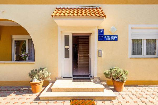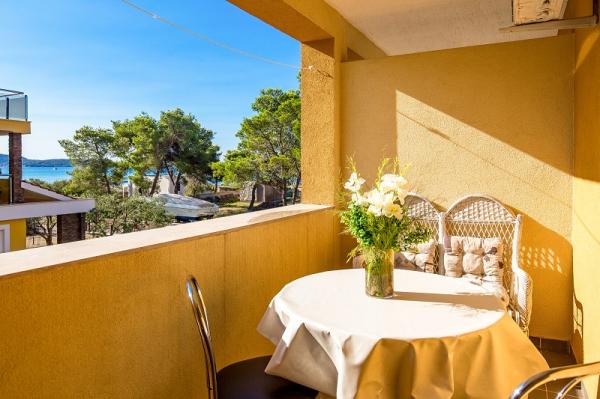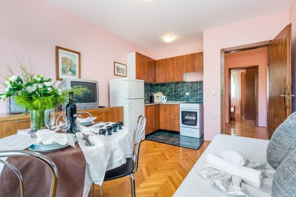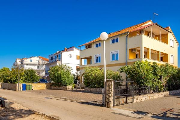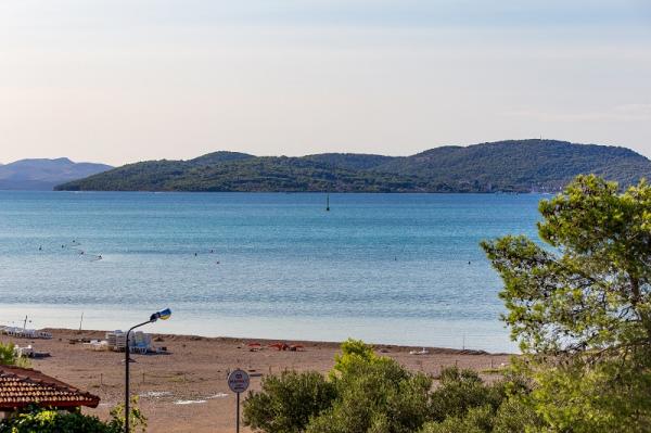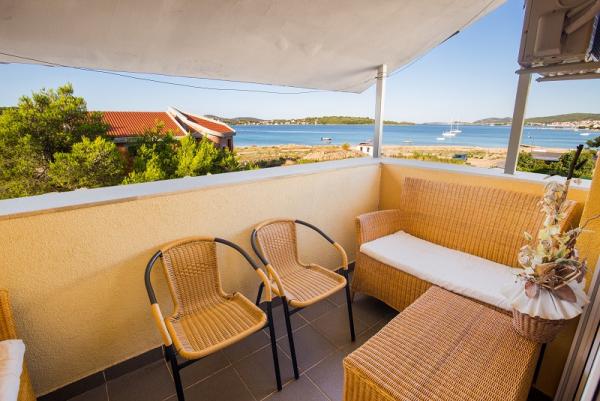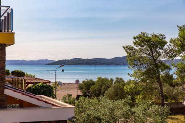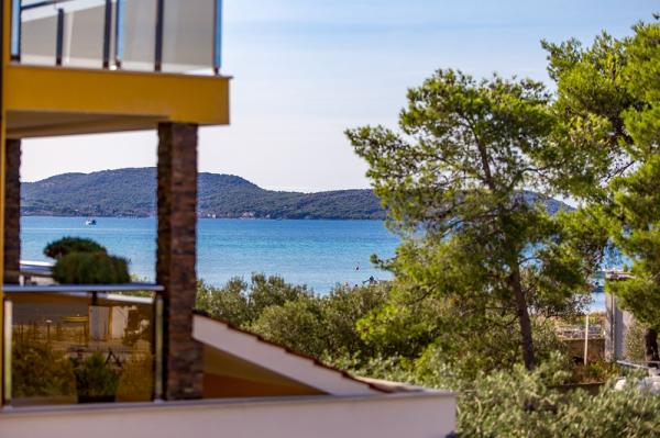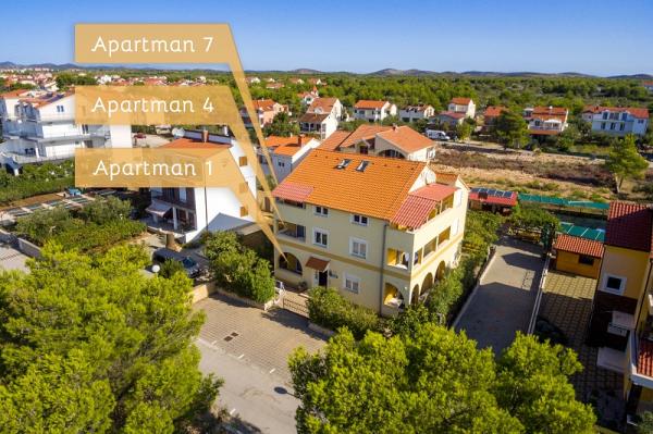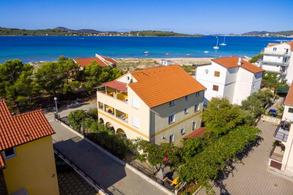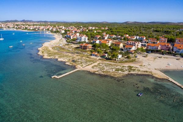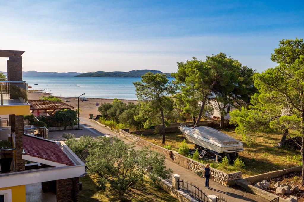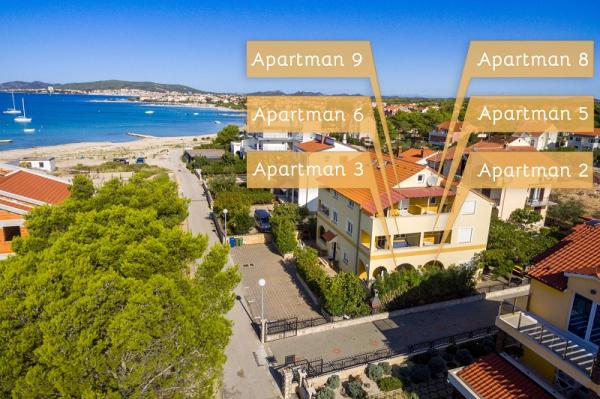Appartementen in Vodice (Srima) drie sterren, eerste rij naar de zee (50m tot zandstrand), twee en drie slaapkamer appartementen, volledig ingericht (airconditioning, tv, internet WiFi). Elk appartement heeft een keuken, een badkamer en een balkon met uitzicht op zee. Er is ook een buitengrill. .
