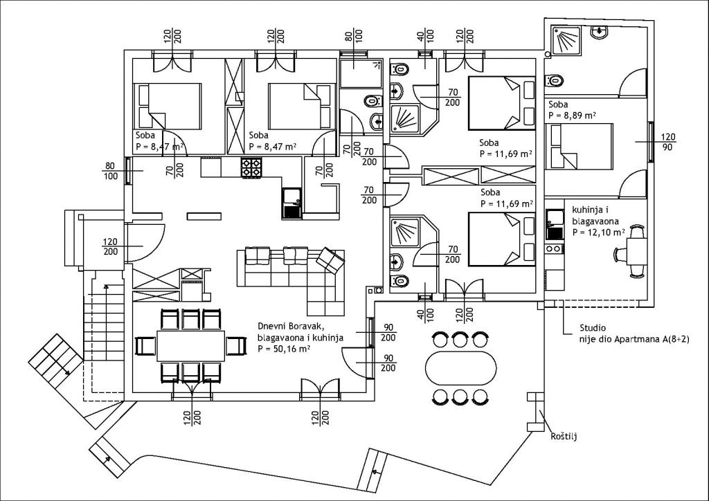 Welkom bij Apartments Pavlović – uw oase van rust in het hart van Supetar! Gelegen in een van de meest aantrekkelijke en tegelijkertijd rustige delen van Supetar op het eiland Brač, zijn Apartments Pavlović de ideale keuze voor een perfecte en ontspannen vakantie. Geniet van de nabijheid van de zee, diverse stranden en de stadspromenade – alles is binnen handbereik! Ons huis bevindt zich in de eerste rij gezinswoningen, direct achter de hotelcomplexen, wat rust en privacy garandeert, maar ook de directe nabijheid van alle belangrijke voorzieningen. Het dichtstbijzijnde strand ligt op slechts 250 meter afstand, de winkel op 50 meter en u bereikt de pittoreske promenade in vijf minuten lopen. Het complex beschikt in totaal over acht modern uitgeruste accommodaties met verschillende capaciteiten: 4 studio-appartementen voor twee personen, 3 appartementen voor vier personen en 1 groot appartement op de begane grond dat plaats biedt aan maximaal tien personen – ideaal voor grotere gezinnen of groepen vrienden. Alle appartementen zijn voorzien van airconditioning en volledig uitgerust – inclusief een keuken, eetkamer, badkamer en een eigen terras.