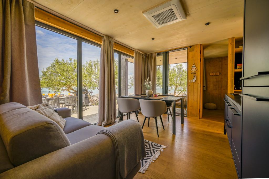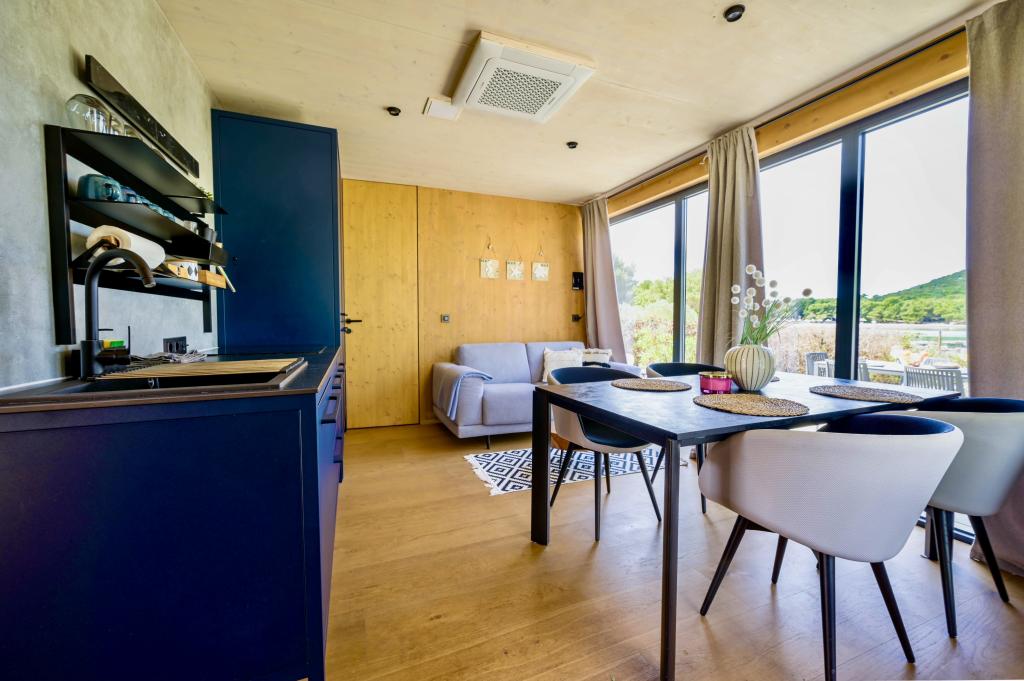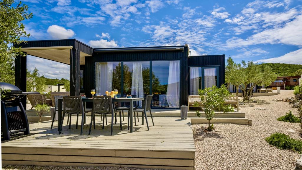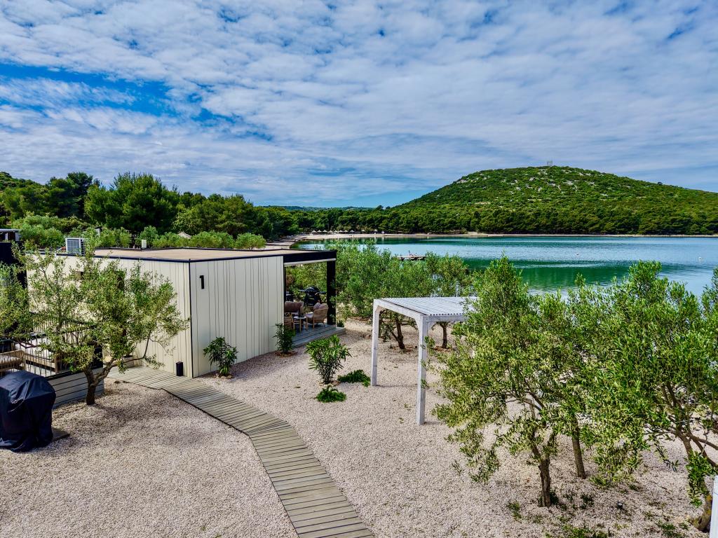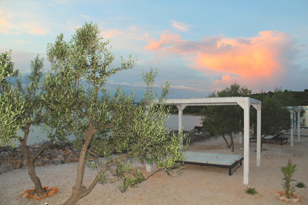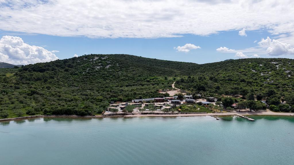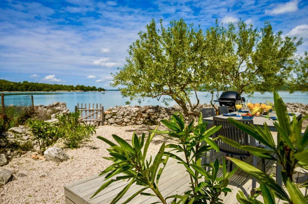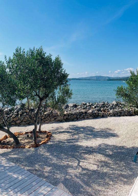De stacaravan ligt op een steenworp afstand van de zee. Het moderne interieur van het appartement is typisch Dalmatisch. Omringd door witte kiezels en groene olijfbomen, en aan de voorkant is alleen het eindeloze blauw. Zee, zon en wind zorgen voor een onbeschrijfelijk spel dat alle zintuigen streelt. Ongeacht of u in een van de twee slaapkamers slaapt, kunt u genieten van het blauw van de zee en de gloed van de zon in de ochtend. En vanuit de volledig uitgeruste keuken met alles wat u nodig heeft (o.a. vaatwasser en vriezer) en de ruime eettafel, heeft u een onbeschrijfelijk uitzicht op het terras en alle charmes die de zon en de zee te bieden hebben. Of u nu een maaltijd bereidt in de keuken of grillt op het terras, u heeft gegarandeerd volledige rust en privacy. Het doel van iedere vakantie is om de dagelijkse sleur en routine achter u te laten. Dat is precies wat onze accommodatie biedt. Hoewel het complex omringd is door 8 gelijksoortige gebouwen, geniet u hier van volledige privacy en rust, omdat iedereen u beschermt. De enige grens die u ziet, is de lucht en de zee.