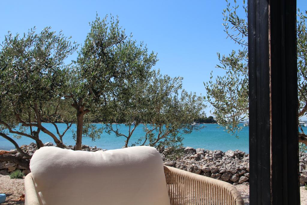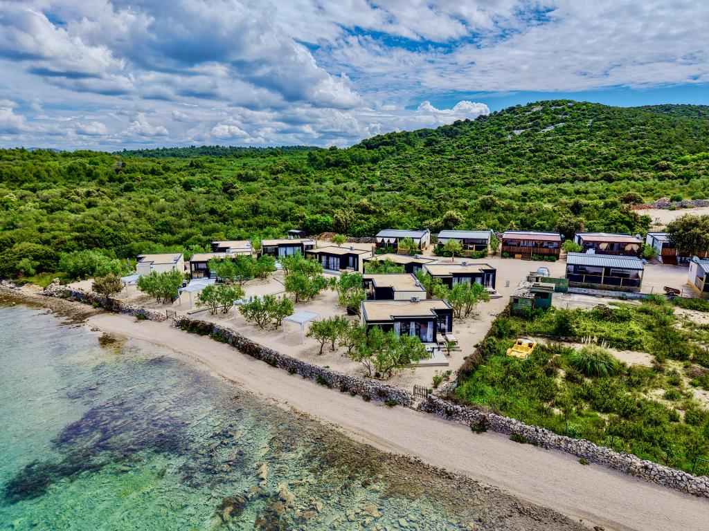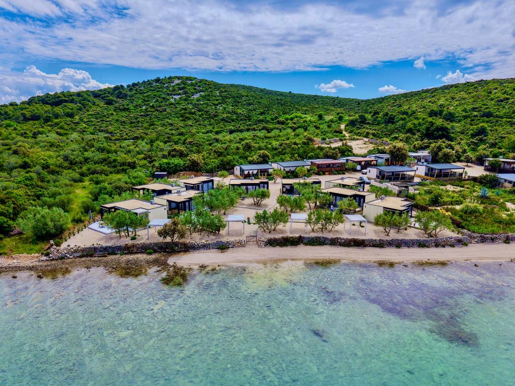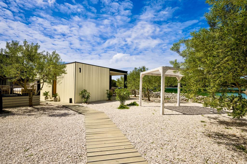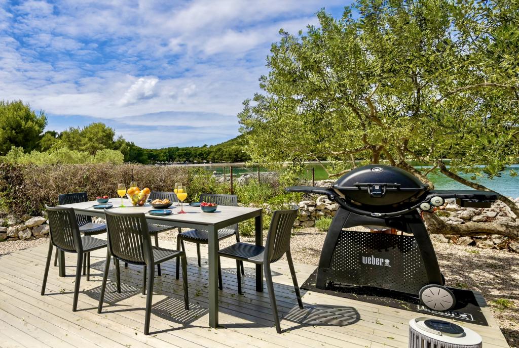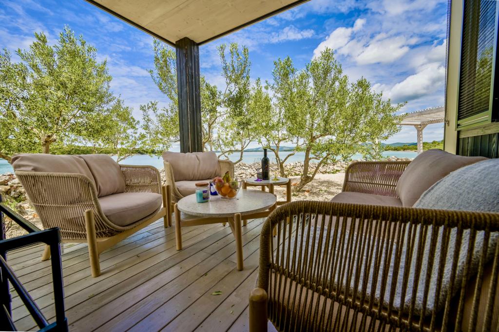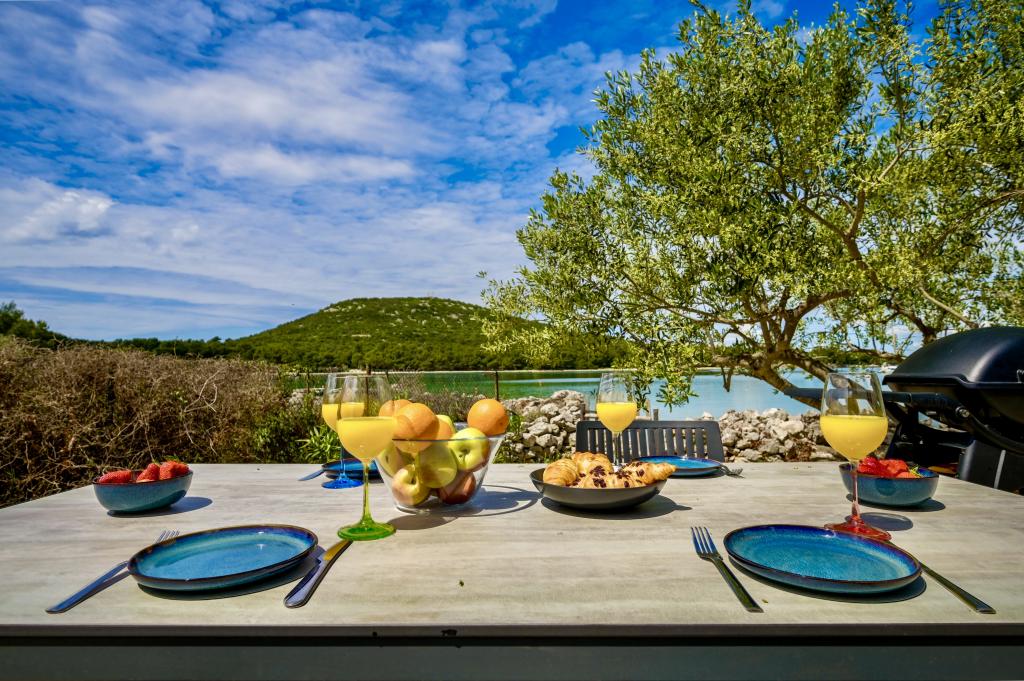 De stacaravan ligt op een steenworp afstand van de zee. Het moderne interieur van het appartement is typisch Dalmatisch. Omringd door witte kiezels en groene olijfbomen, en aan de voorkant is alleen het eindeloze blauw. Zee, zon en wind zorgen voor een onbeschrijfelijk spel dat alle zintuigen streelt. Ongeacht of u in een van de twee slaapkamers slaapt, kunt u genieten van het blauw van de zee en de gloed van de zon in de ochtend. En vanuit de volledig uitgeruste keuken met alles wat u nodig heeft (o.a. vaatwasser en vriezer) en de ruime eettafel, heeft u een onbeschrijfelijk uitzicht op het terras en alle charmes die de zon en de zee te bieden hebben. Of u nu een maaltijd bereidt in de keuken of grillt op het terras, u heeft gegarandeerd volledige rust en privacy. Het doel van iedere vakantie is om de dagelijkse sleur en routine achter u te laten. Dat is precies wat onze accommodatie biedt. Hoewel het complex omringd is door 8 gelijksoortige gebouwen, geniet u hier van volledige privacy en rust, omdat iedereen u beschermt. De enige grens die u ziet, is de lucht en de zee.
