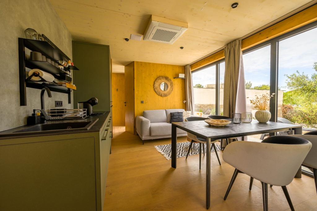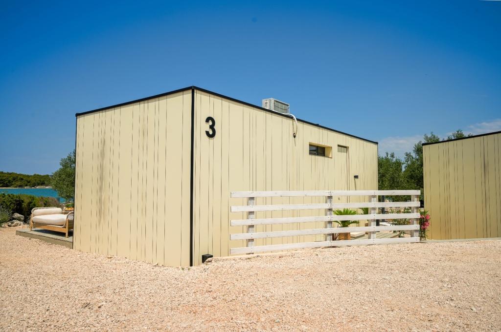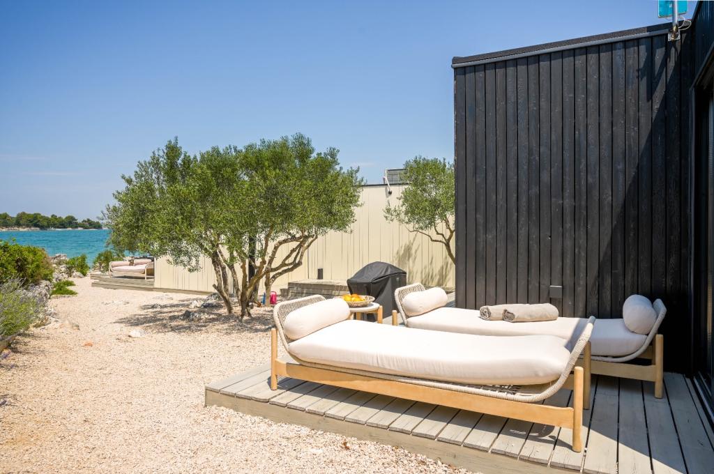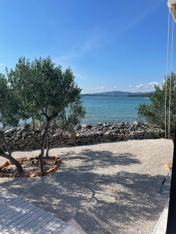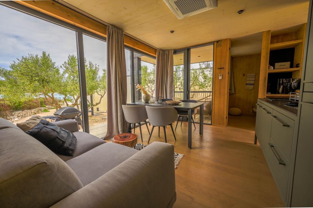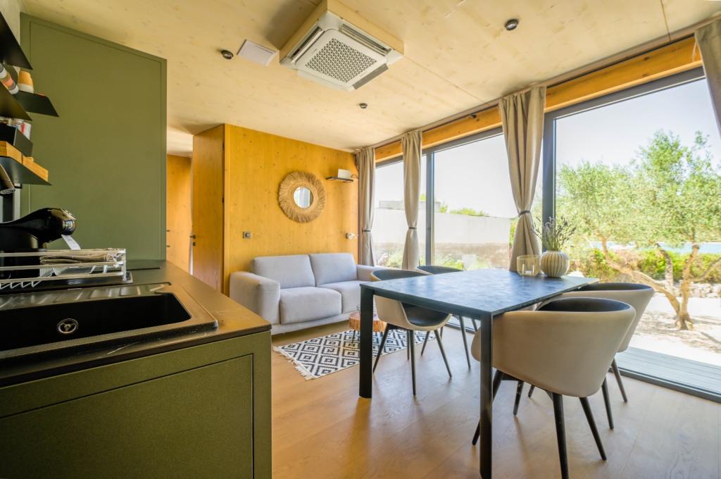 De stacaravan ligt op een steenworp afstand van de zee. Het moderne interieur van het appartement is typisch Dalmatisch. Omringd door witte kiezels en groene olijfbomen, en voor u alleen het eindeloze blauw. Zee, zon en wind zorgen voor een onbeschrijfelijk spel dat alle zintuigen streelt. Ongeacht of u in een van de twee slaapkamers slaapt, kunt u genieten van het blauw van de zee en de gloed van de zon in de ochtend. En vanuit de volledig uitgeruste keuken met alles wat u nodig heeft (o.a. vaatwasser en vriezer) en de ruime eettafel, heeft u een onbeschrijfelijk uitzicht op het terras en alle charmes die de zon en de zee te bieden hebben. Of u nu een maaltijd bereidt in de keuken of grillt op het terras, u heeft gegarandeerd volledige rust en privacy. Het doel van iedere vakantie is om de dagelijkse sleur en routine achter u te laten. Dat is precies wat onze accommodatie biedt. Hoewel het complex omringd is door 8 gelijksoortige gebouwen, geniet u hier van volledige privacy en rust, omdat iedereen u beschermt. De enige grens die u ziet, is de lucht en de zee.