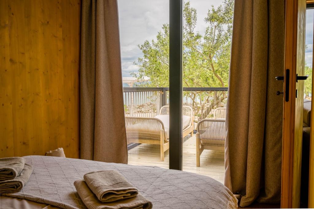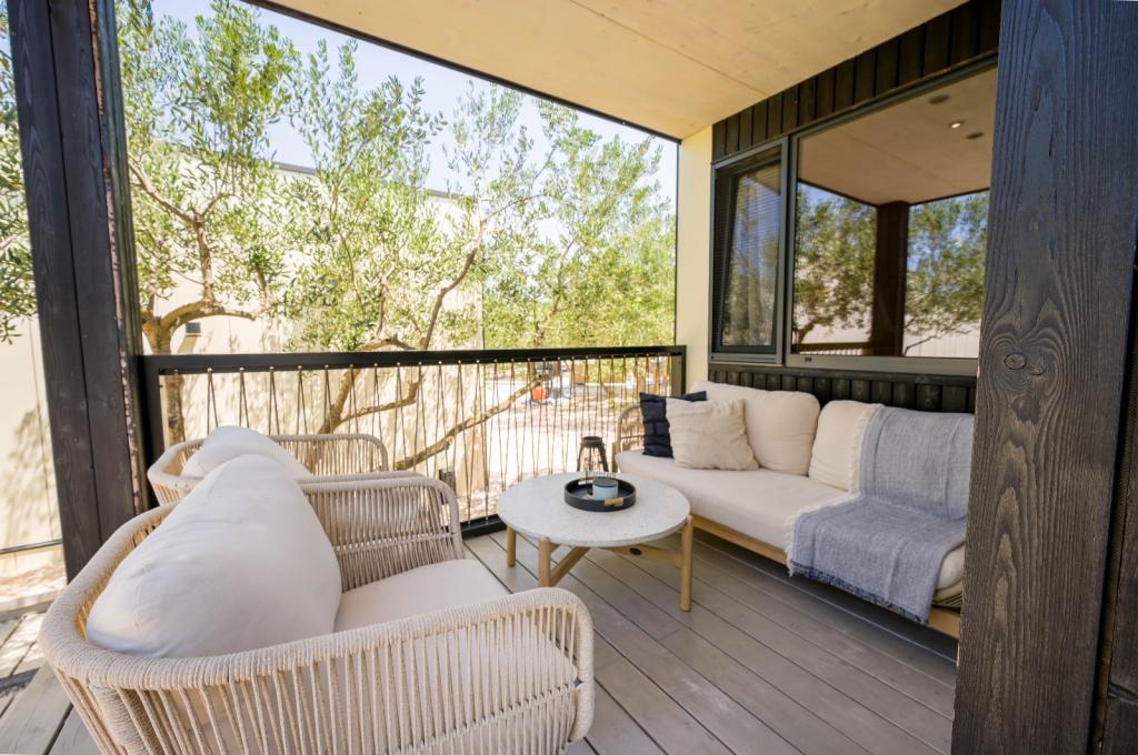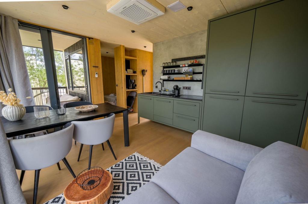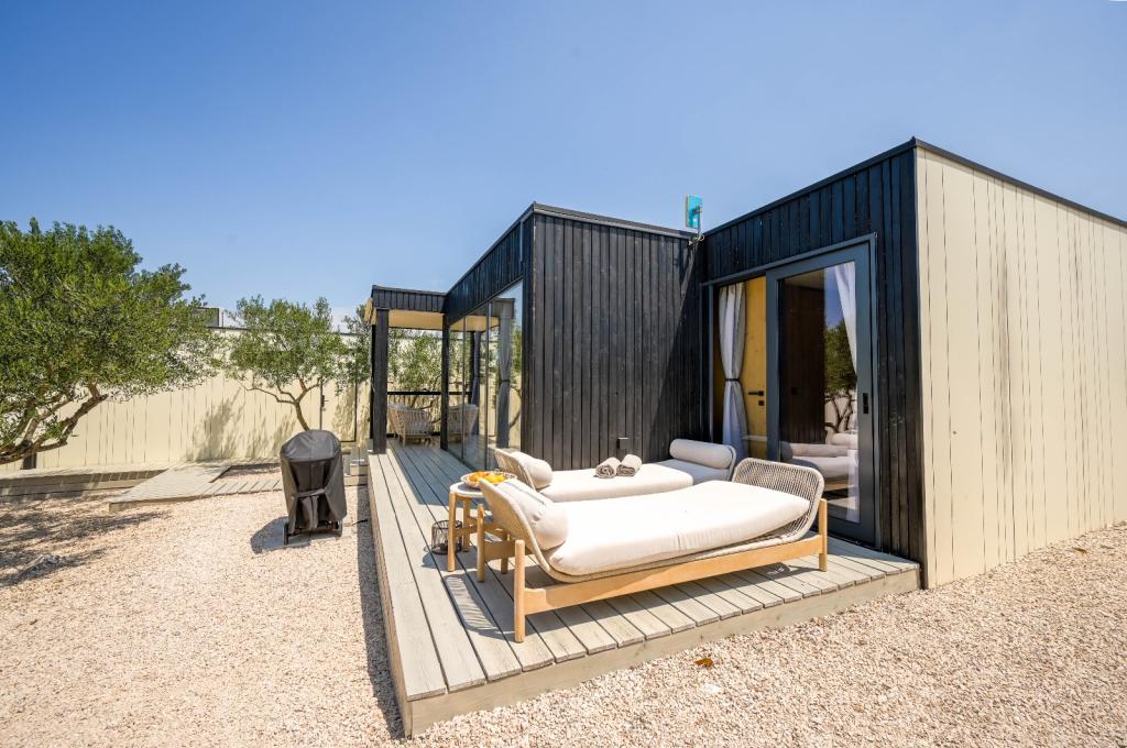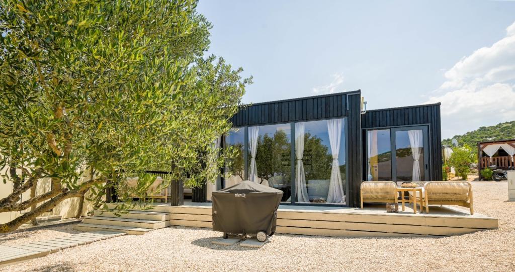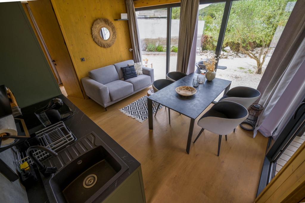 De stacaravan ligt op een steenworp afstand van de zee. Het moderne interieur van het appartement is typisch Dalmatisch. Omringd door witte kiezels en groene olijfbomen, en voor u alleen het eindeloze blauw. Zee, zon en wind zorgen voor een onbeschrijfelijk spel dat alle zintuigen streelt. Ongeacht of u in een van de twee slaapkamers slaapt, kunt u genieten van het blauw van de zee en de gloed van de zon in de ochtend. En vanuit de volledig uitgeruste keuken met alles wat u nodig heeft (o.a. vaatwasser en vriezer) en de ruime eettafel, heeft u een onbeschrijfelijk uitzicht op het terras en alle charmes die de zon en de zee te bieden hebben. Of u nu een maaltijd bereidt in de keuken of grillt op het terras, u heeft gegarandeerd volledige rust en privacy. Het doel van iedere vakantie is om de dagelijkse sleur en routine achter u te laten. Dat is precies wat onze accommodatie biedt. Hoewel het complex omringd is door 8 gelijksoortige gebouwen, geniet u hier van volledige privacy en rust, omdat iedereen u beschermt. De enige grens die u ziet, is de lucht en de zee.