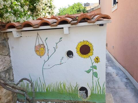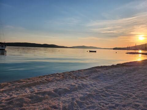 Voor onze jongste gasten is er naast de zomerkeuken een speelhoek, die is uitgerust met een speelhuisje, een tafel, puzzels en speelgoed. Als onze gasten optimaal willen genieten van hun zomervakantie, is er een SUP (Stand Up Paddle) die gebruikt kan worden. Het is gratis. In de directe omgeving van het appartement vindt u talloze cafés, restaurants en winkels - alles wat u nodig heeft tijdens uw verblijf. De dichtstbijzijnde winkel ligt op slechts 2 minuten afstand, evenals het restaurant "Mediteraneo". Het plaatselijke strand ligt ook op 2 minuten lopen. Houd er op de terugweg naar het appartement rekening mee dat er een kleine heuvel naar het appartement leidt. Als u advies nodig heeft over waar u kunt eten of waar u heen kunt, kunt u contact opnemen met de huishoudster Lucia, die op de begane grond woont. helpt u graag met alles wat u nodig heeft. Als u een week of langer bij ons verblijft, krijgt u een gratis rondleiding door de oude binnenstad van Trogir met Lucia, die ook een erkende toeristengids is.