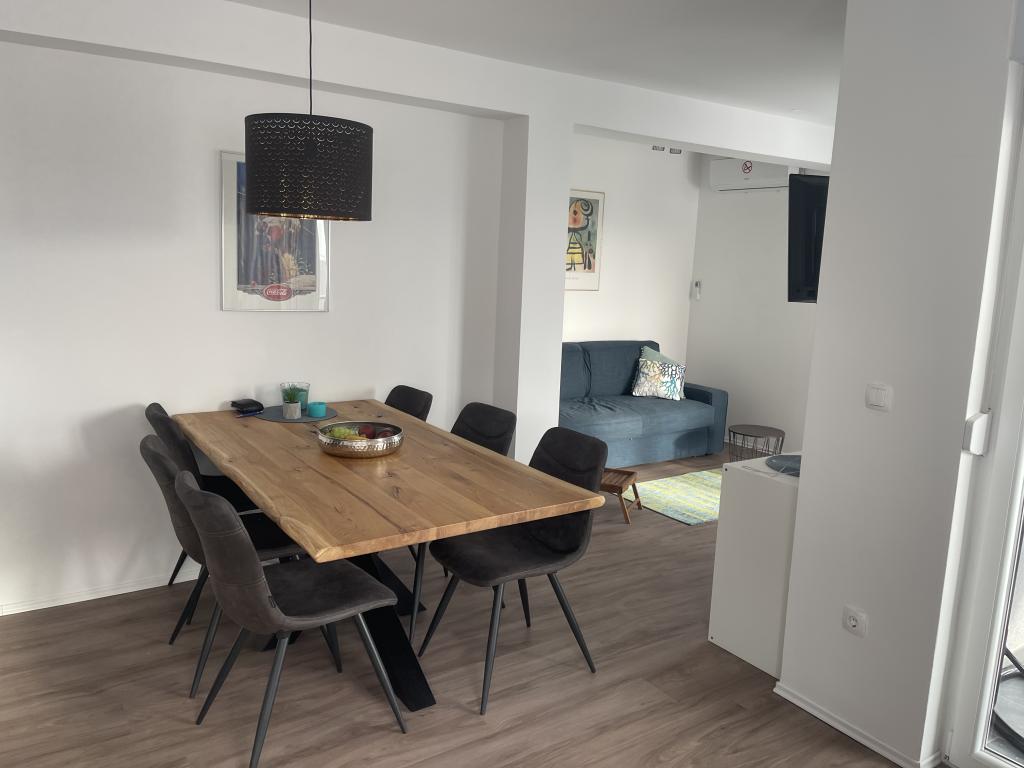 We voelden ons meteen op ons gemak in het appartement! Het was schoon, modern uitgerust (inductiekookplaat, oven-micro combi, wasmachine, vaatwasser, airconditioning, koelkast met vriesvak, tv) en smaakvol ingericht. We waren met z'n vijven in het appartement met een klein kind en een baby en we hadden veel ruimte. Het appartement ligt op de heuvel en biedt een geweldig uitzicht op de zee. Diverse stranden liggen op loopafstand en ook bent u snel in het gezellige stadje Trogir. Slenteren langs de haven, slenteren door de oude muren van de kleine steegjes of 's avonds naar een restaurant gaan, brengt je in vakantiestemming. Het appartement ligt op slechts een klein eindje rijden van de luchthaven van Split. Met een huurauto kunt u gemakkelijk het eiland Ciovo verkennen, dat tal van mooie stranden te bieden heeft, of dagtochten maken naar de omgeving. Als je het liever rustig hebt, kun je jezelf houden aan je eigen zwembad. Op het grote terras met eettafel, zithoek en ligstoelen kunt u heerlijk ontspannen. Veel dank aan de aardige gastheren voor de geweldige tijd! We komen graag terug!
