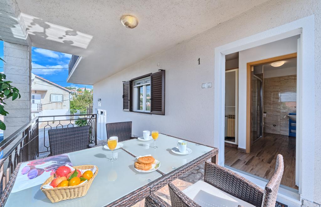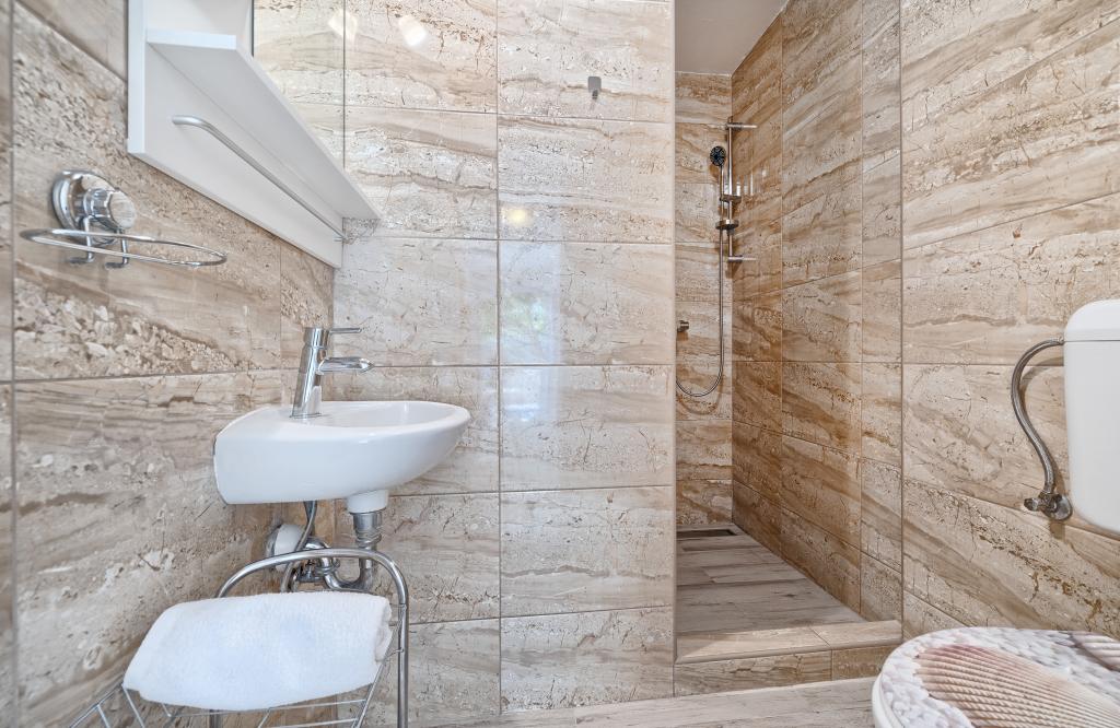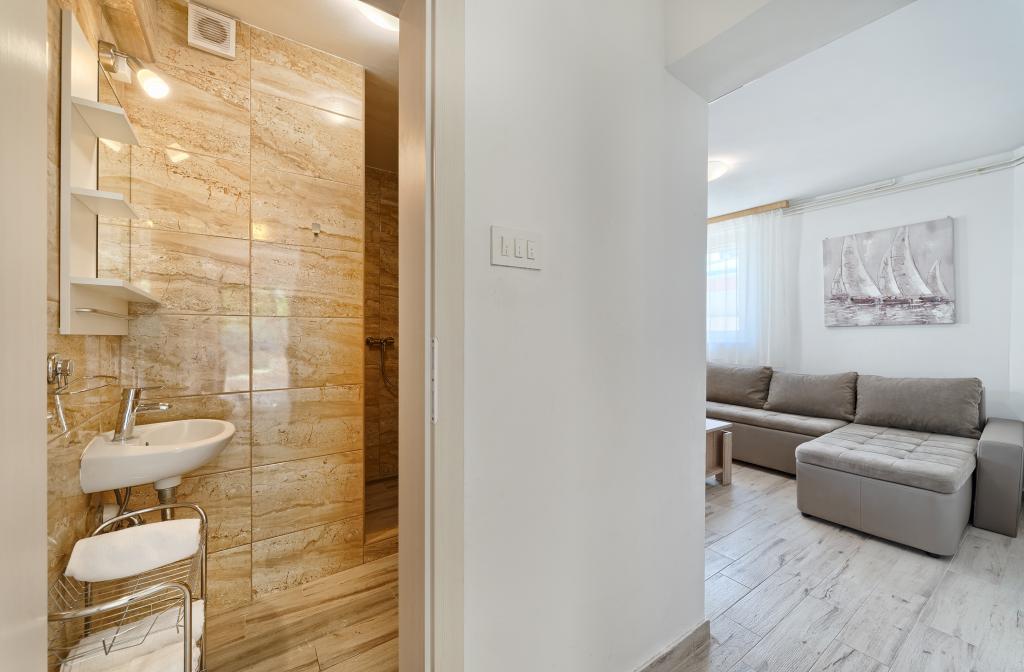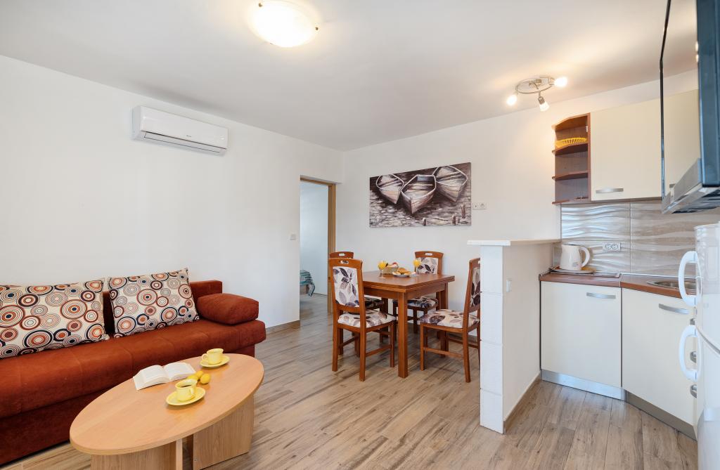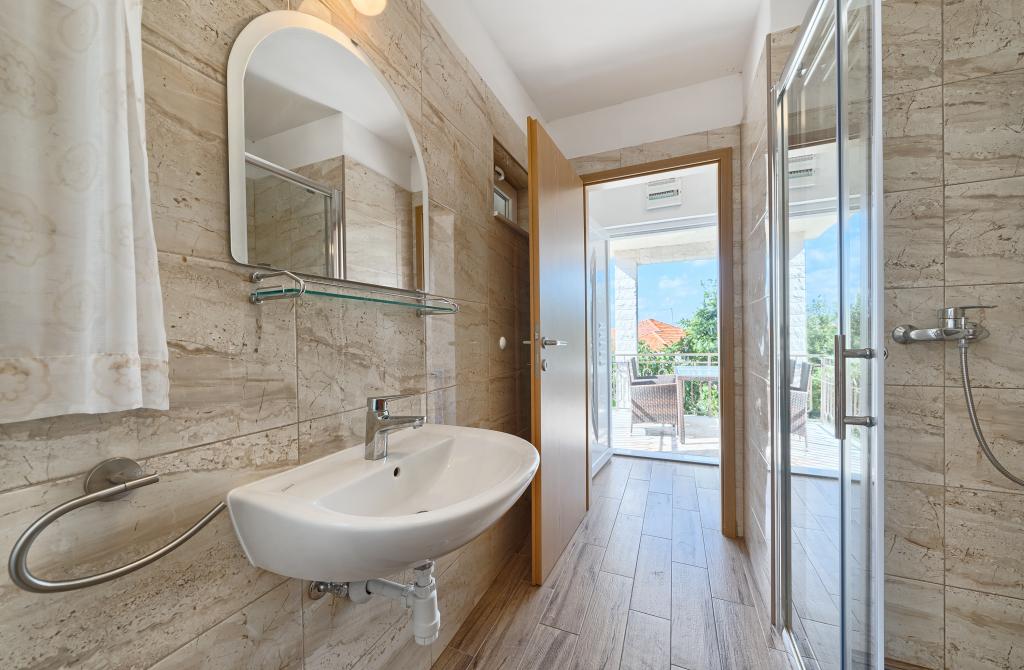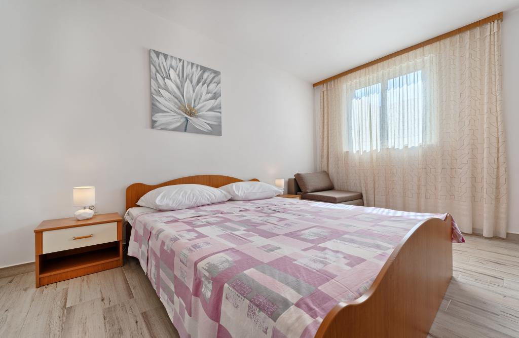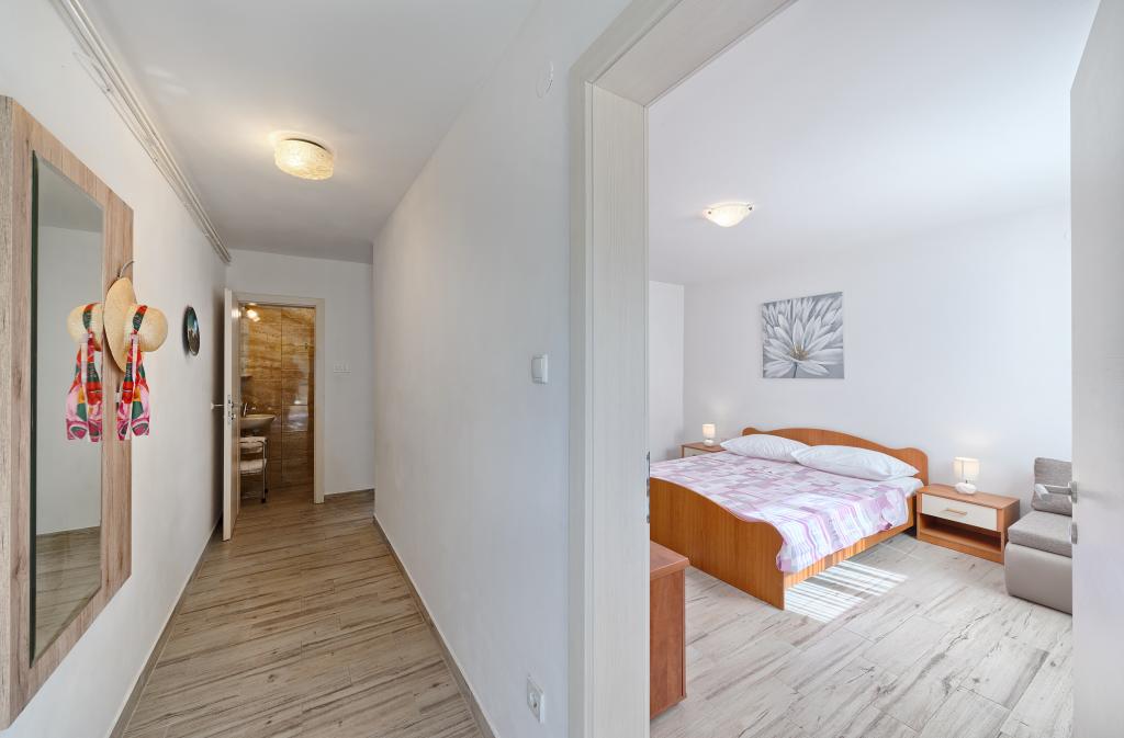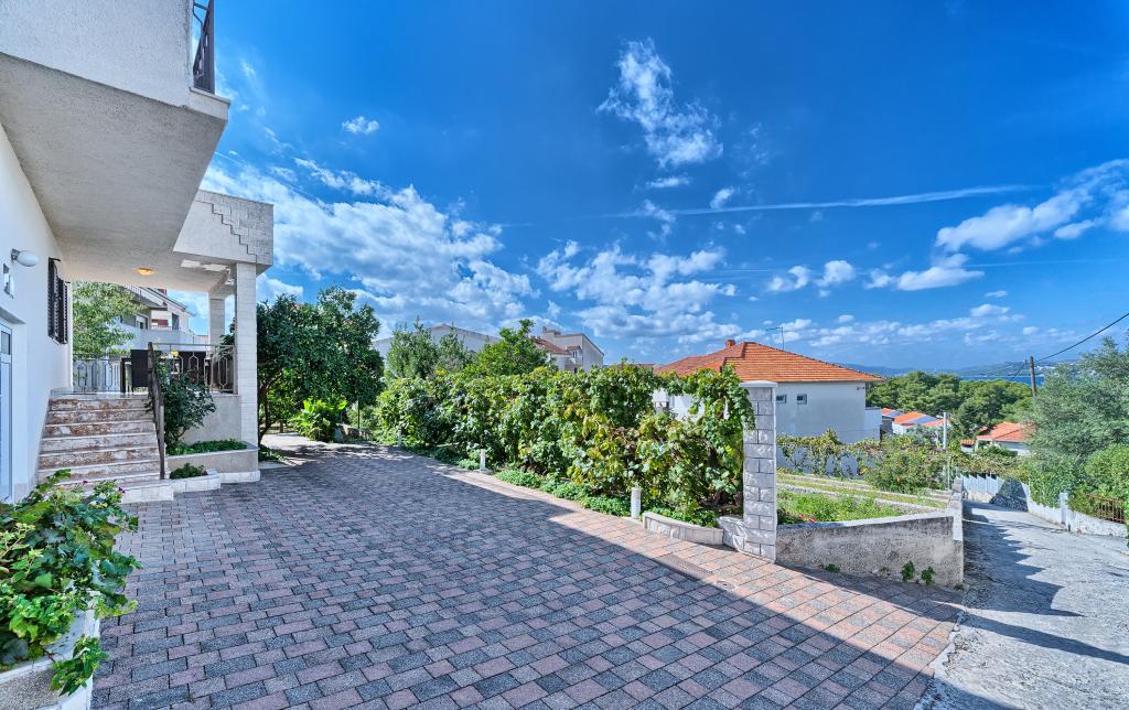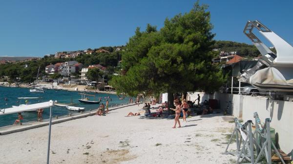 Appartementen Bareta bevinden zich op het eiland Ciovo, gemeente Trogir. Ze bevinden zich op een geweldige locatie voor degenen die willen genieten van de zon en de zee, evenals voor degenen die kennis willen maken met de historische en natuurlijke schoonheden van Midden-Dalmatië. De oude binnenstad van Trogir, die op de werelderfgoedlijst van UNESCO staat, bevindt zich op slechts 1000 meter afstand, terwijl Split (paleis van Diocletianus, veerboten voor eilanden), Omiš, Cetina (raften, canyoning, klimmen), de watervallen van Krka en Sibenik op minder dan 50 km afstand liggen. De luchthaven van Split ligt op slechts 5 km afstand. De appartementen bevinden zich op de begane grond van een familiehuis, omgeven door tuin en groen. Elk appartement heeft een eigen ingang en een groot terras met eettafel, parkeerplaats en barbecue en buitendouche zijn mogelijk. De appartementen bestaan uit een woonkamer verbonden met de keuken, een slaapkamer (bed 2 1, 2 2), mogelijk twee volwassenen met twee kinderen, een badkamer met toilet. De appartementen zijn volledig uitgerust met alles wat u nodig heeft voor een comfortabel verblijf / serviesgoed, beddengoed, enz.) Tr