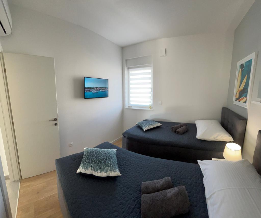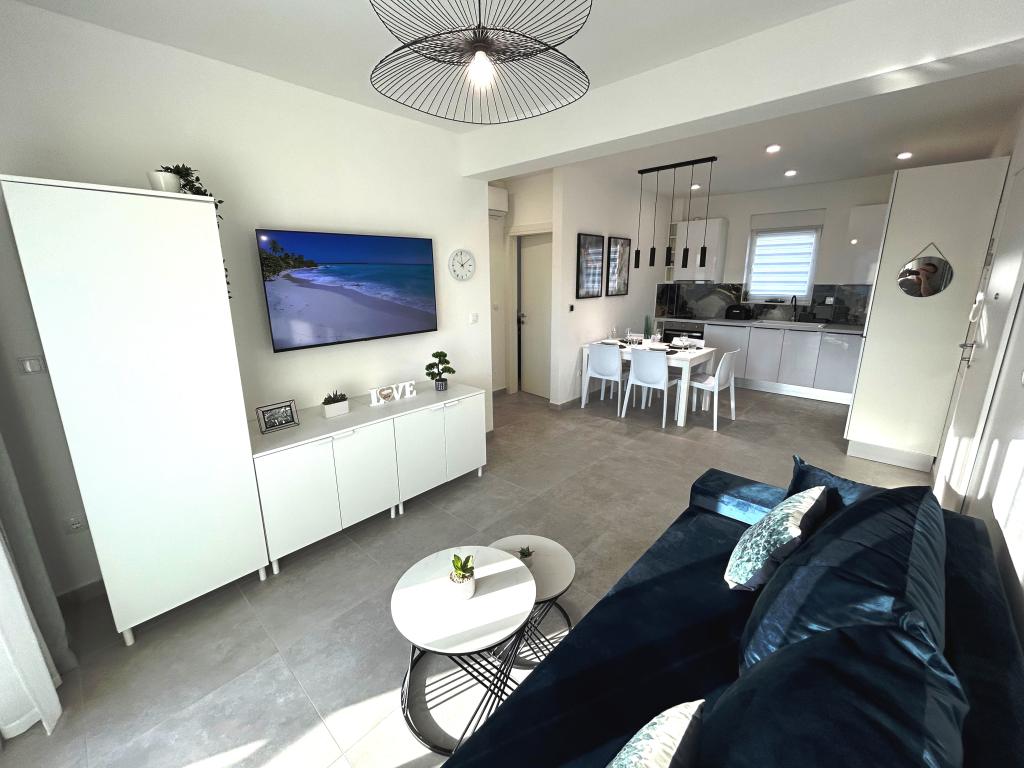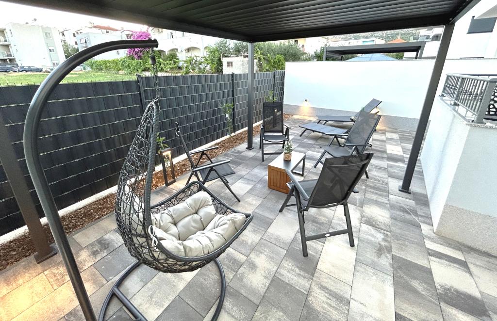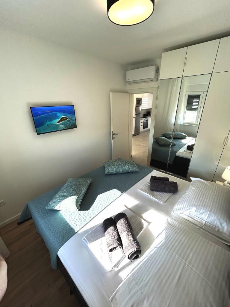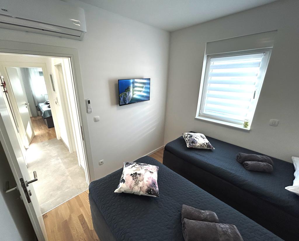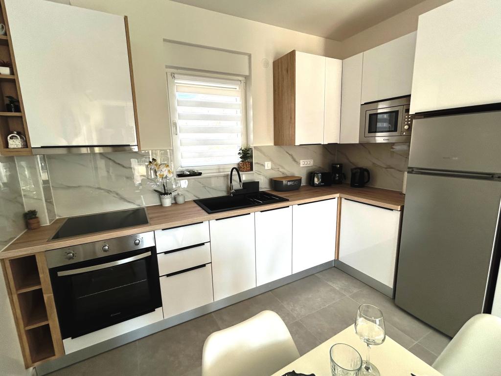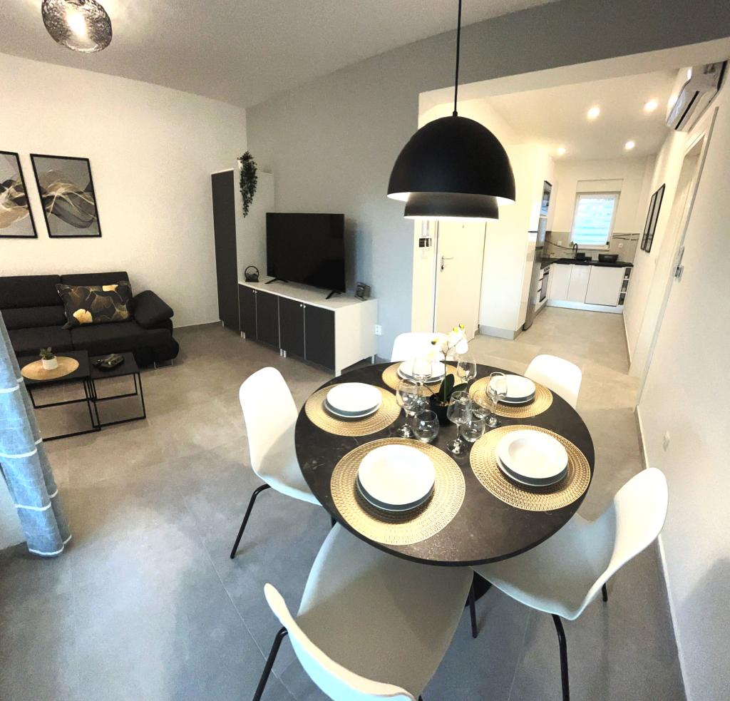 Town Trogir Apartments liggen op het vasteland van Trogir, op een toplocatie, op slechts 400 meter van het oude stadscentrum en 1000 meter van het nieuwe stadsstrand. Het strand is te bereiken via een promenade langs de zee. Alle belangrijke voorzieningen bevinden zich op loopafstand, op 5 tot 10 minuten lopen. Town Trogir Apartments is nieuw en gelegen in een klein woongebouw met 6 appartementen. De appartementen hebben een oppervlakte van circa 60 m². De appartementen bevinden zich op de begane grond, de eerste verdieping en de tweede verdieping. De appartementen zijn modern ingericht en van alle gemakken voorzien. Elk appartement beschikt over 2 slaapkamers, een woonkamer met eethoek, een volledig ingerichte keuken, een badkamer en een ruim terras met tuinmeubilair op de begane grond. De woonkamer en slaapkamers hebben aparte airconditioning. Er is gratis parkeergelegenheid voor het gebouw. Bedlinnen en handdoeken zijn inbegrepen. WiFi is gratis. De toeristenbelasting is bij de prijs inbegrepen.