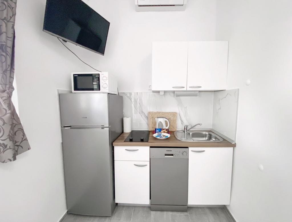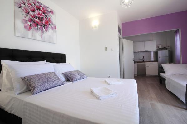 We hebben een heerlijke vakantie gehad bij tante Dasha. Hoewel er geen studio's meer beschikbaar waren, hebben we ervoor gekozen om in een kamer te verblijven en daar hebben we geen spijt van gehad. De bedden zijn erg comfortabel en we waren vooral blij dat er drankjes in de koelkast stonden, evenals koffie die we zelf konden zetten. Het terras met een prachtig uitzicht was de plek waar we de meeste tijd doorbrachten, en het strand ligt letterlijk voor het huis. We hebben van elk moment van ons verblijf genoten en zouden graag nog eens terugkomen.