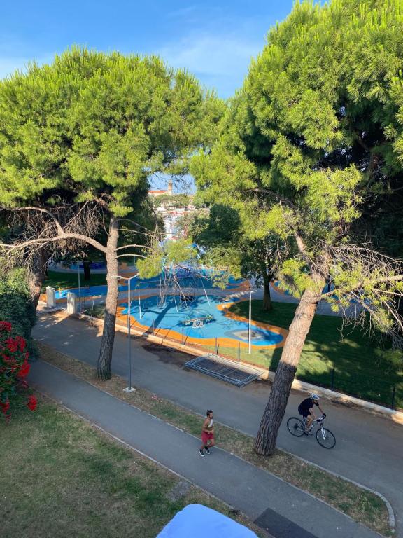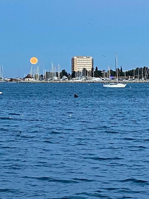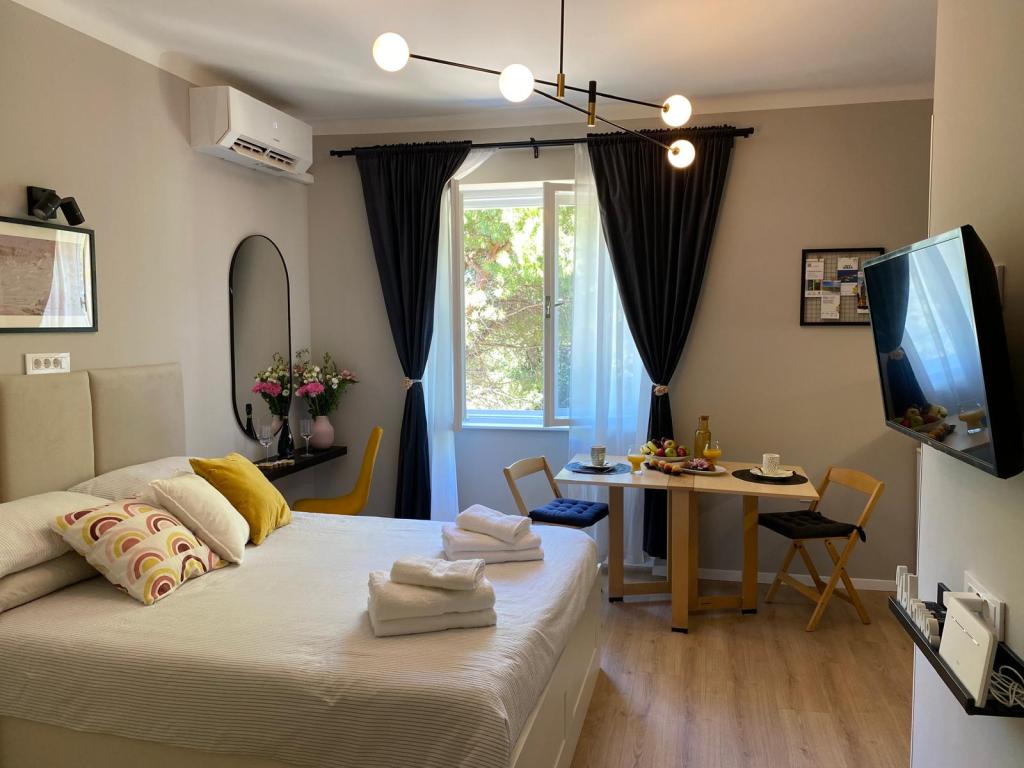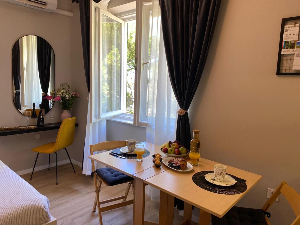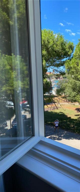 Studio-appartement "Victor 27" is een charmante accommodatie op een rustige locatie in het stadscentrum, dicht bij alle interessante voorzieningen. Dankzij de optimale ligging aan het begin van de boulevard kunt u lange wandelingen maken, fietsen of genieten van een ritje met de panoramatrein langs de kust van Umag. Vanuit het raam heeft u uitzicht op groene dennenbomen en op de achtergrond de zee en de oude haven. De studio bevindt zich op de tweede verdieping (geen lift). Er is geen balkon. Parkeren is gratis in het gebouw. Op voorafgaand verzoek is het mogelijk om een derde bed voor kinderen bij te plaatsen en er is ook de mogelijkheid om een fiets te gebruiken (dit wordt bij de boeking besproken).