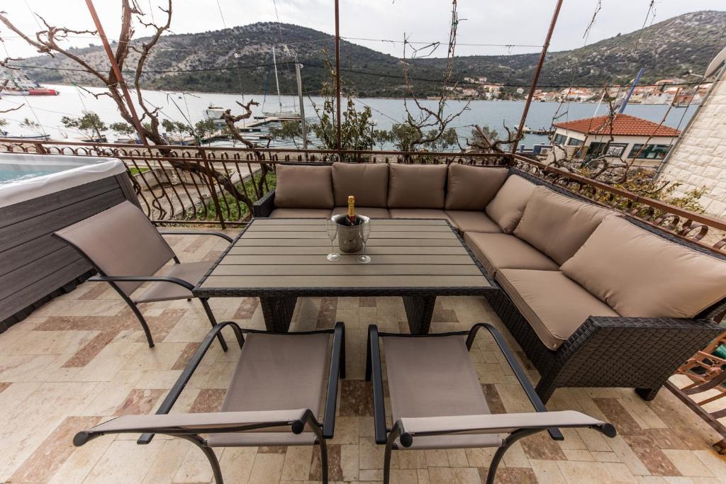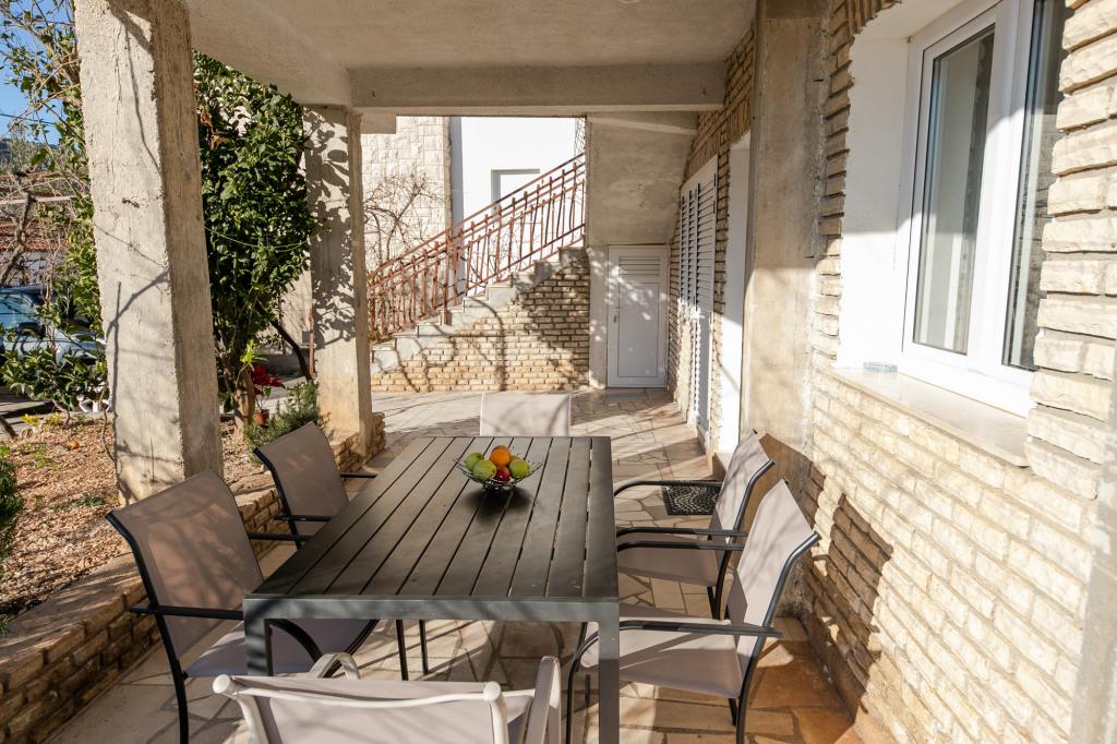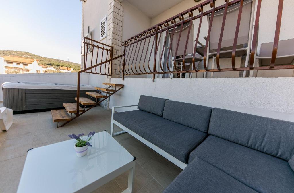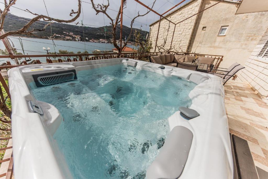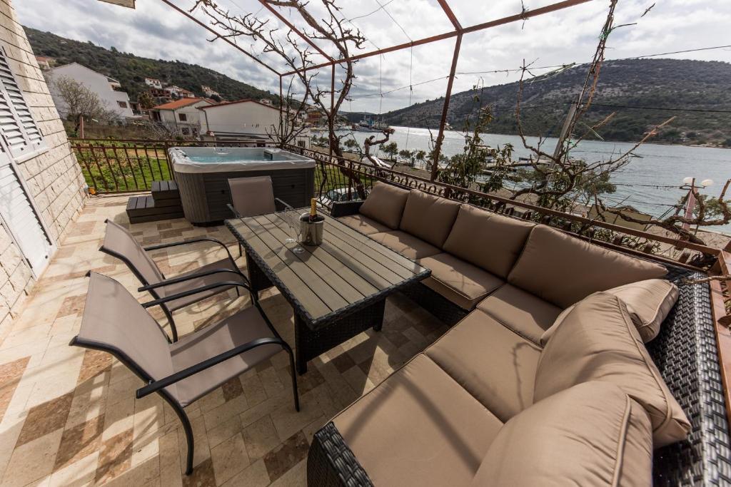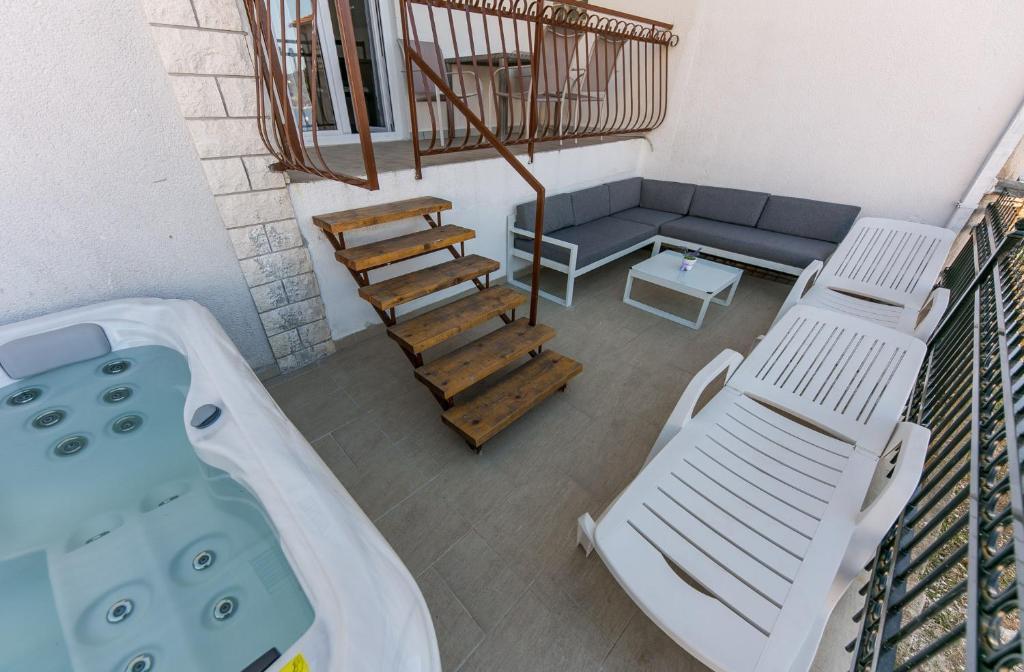 Apartments Mate ligt in Vinišće, 15 km ten westen van Trogir. Het huis ligt op 10 meter van de zee en het strand en heeft een grote parkeerplaats voor 8 auto's. Het huis heeft 5 appartementen: Appartement (6 2) Begane grond met jacuzzi: 3 slaapkamers, keuken met woonkamer, badkamer en lobby met jacuzzi. Appartement (7) Eerste verdieping met jacuzzi: 3 slaapkamers, keuken met woonkamer, 2 badkamers en groot terras met jacuzzi. Appartement (5 1) Penthouse: 2 slaapkamers, keuken met woonkamer, badkamer en groot balkon. Gedeelde jacuzzi. Appartement (4) Eerste verdieping met jacuzzi met: 2 slaapkamers, keuken, badkamer en groot terras met jacuzzi. Appartement (4) Tweede verdieping: 2 slaapkamers, keuken, badkamer en balkon. Gedeelde jacuzzi Een buitengrill is beschikbaar voor alle gasten. Gasten kunnen gebruikmaken van fietsen, een kajak en een supboard. Het huis is: - 10 meter van de zee en het strand - 100 meter van het restaurant - 150 meter van de winkel