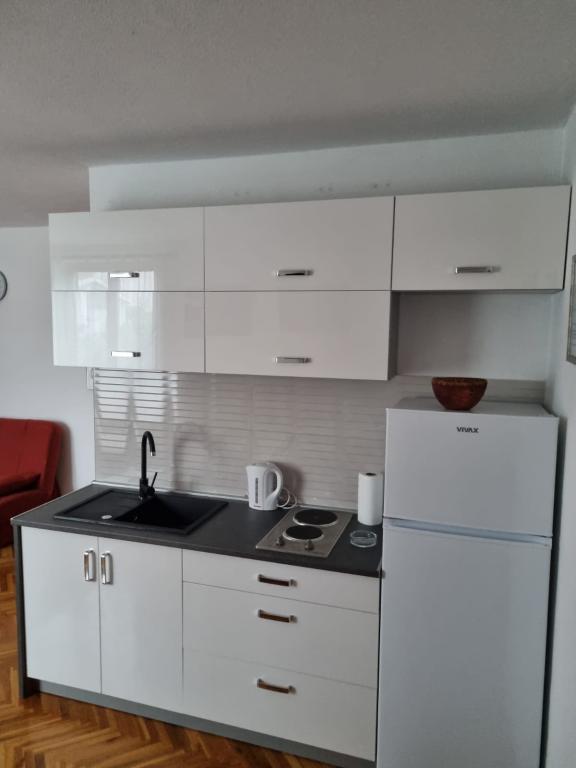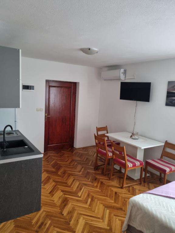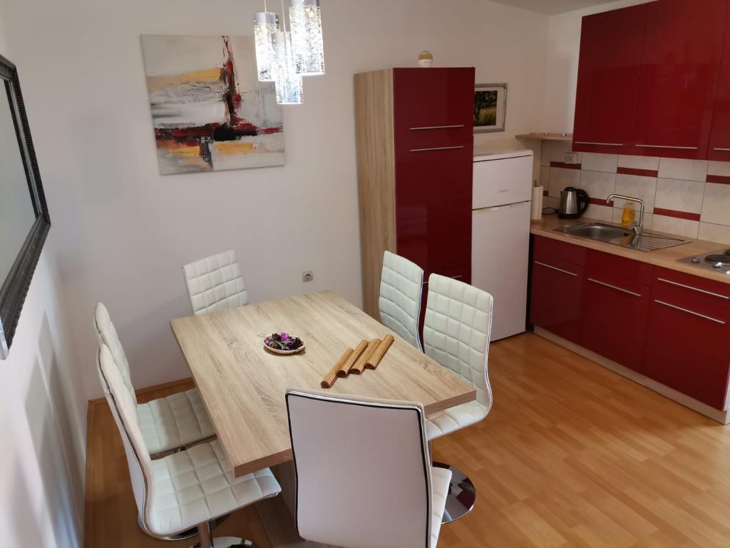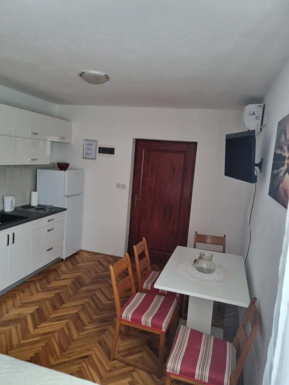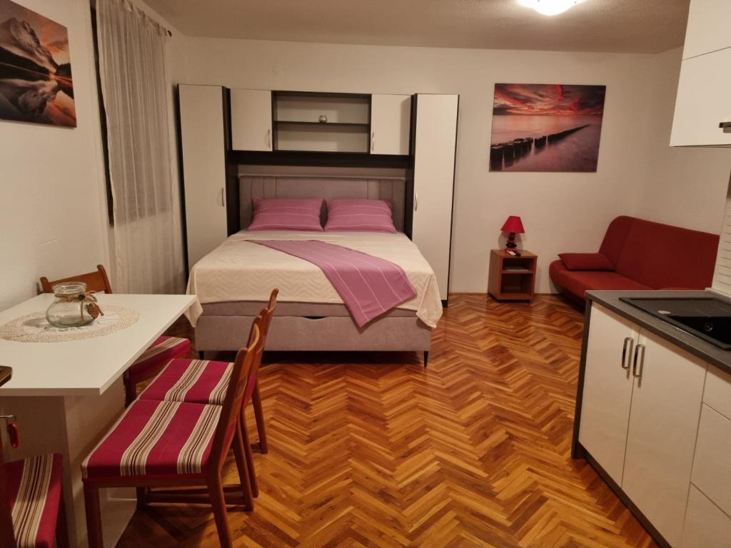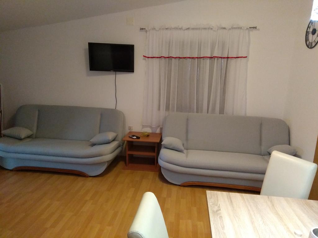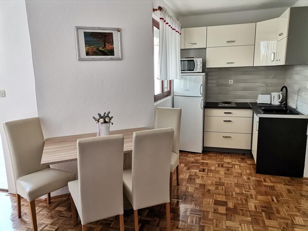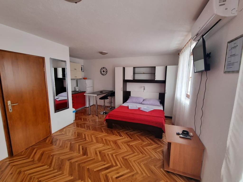 De appartementen liggen buiten de gebaande paden, dus het is rustig en vredig. Het is 10 minuten lopen naar het strand, er zijn onderweg een bakker en een Tommy-winkel. Een hele aardige en behulpzame eigenaar, die ons verwelkomde met koffie en heerlijke sapjes maakte voor de kinderen. Bij haar kunt u Rakija, wijn of olijfolie kopen. De appartementen zelf zijn zeer schoon en goed uitgerust met een parkeerplaats.