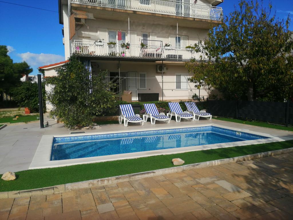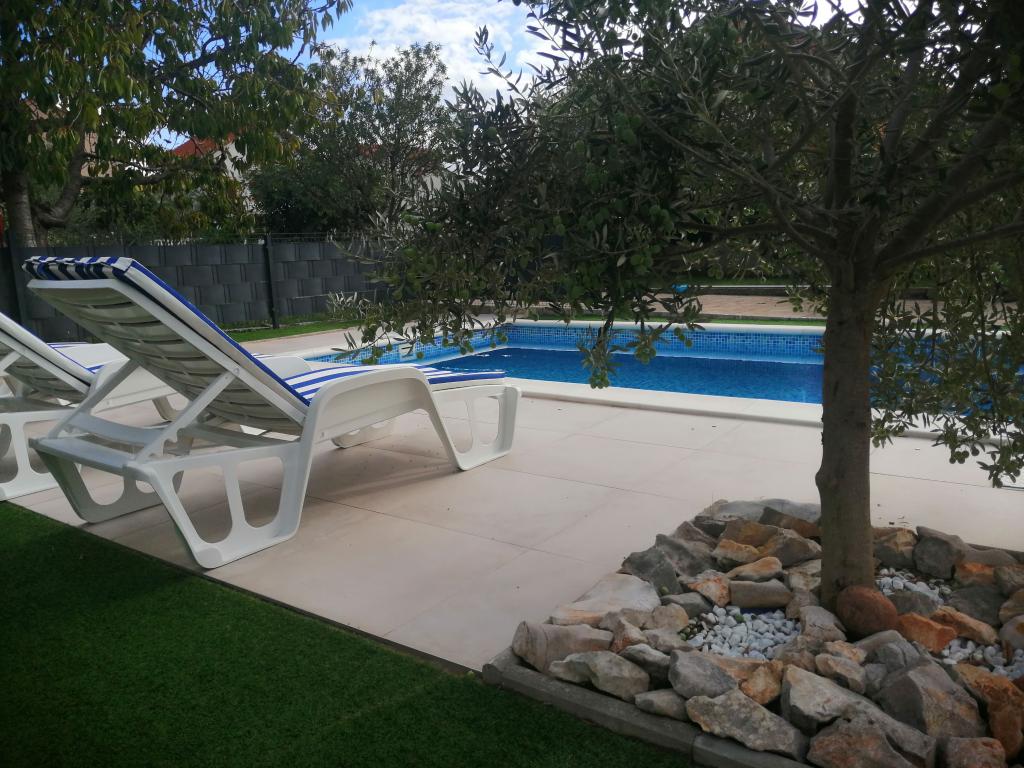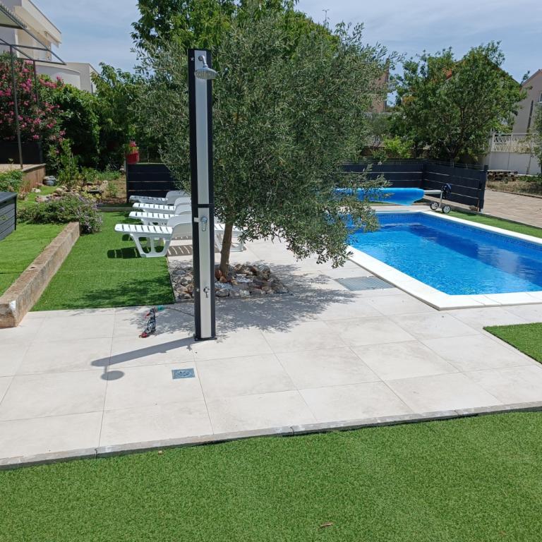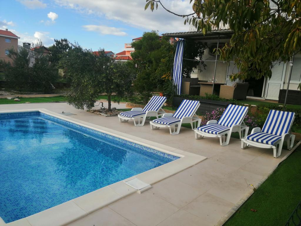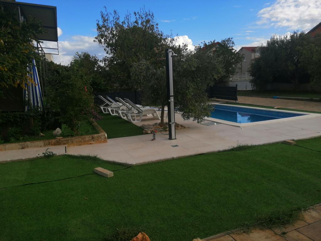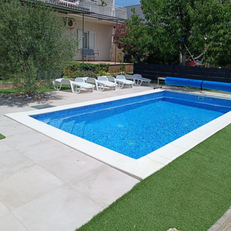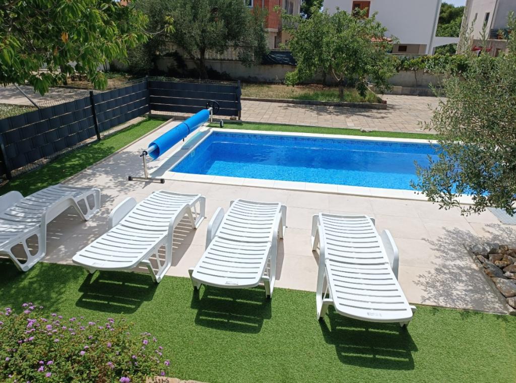 Onlangs gerenoveerde grote appartementen met een buitenzwembad, speciaal voor jou!! Als een vakantiehuis!! Volledig onlangs gerenoveerde keuken met nieuwe apparatuur (koelkast, vriezer, oven, kookplaat, magnetron, waterkoker, vaatwasser, wasmachine, afzuigkap). Serviesgoed en kookgerei. Woonkamer met hoekbank die indien nodig kan worden uitgeklapt tot een ruim bed. Nieuwe tv met satellietzenders. Slaapkamers met ruime tweepersoonsbedden. Beddengoed. Alle kamers zijn voorzien van airconditioning. Twee badkamers met toilet en inloopdouches, onlangs gerenoveerd. Wasmachine, strijkbenodigdheden, haardroger. Stofzuiger en schoonmaakmiddelen, toiletpapier, zeep, handdoeken. Er is ook een terras van 30 m2 met tuinmeubelen, evenals een grill en ligstoelen bij het zwembad. Enorme tuin van 1300 m2 met veel mediterrane bomen. Parkeren in de tuin GRATIS!! De luchthavens van Zadar en Split liggen op ongeveer 60 km afstand. Dichtbij de nationale parken Krka en Kornati