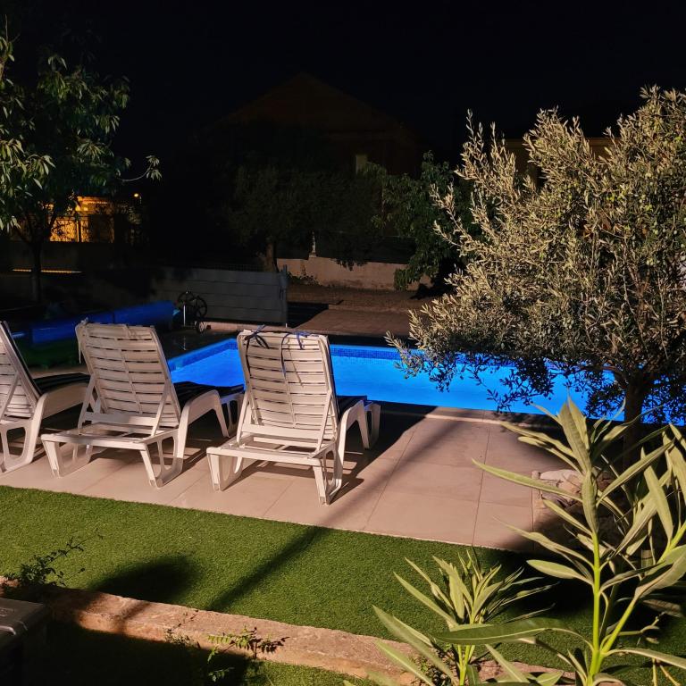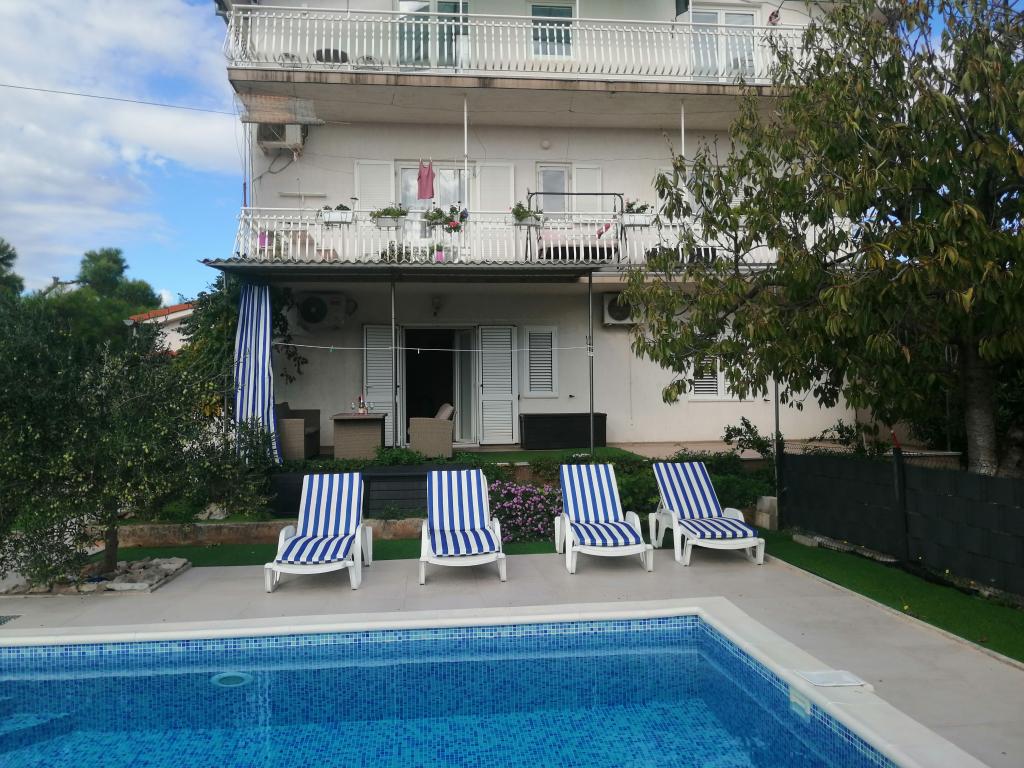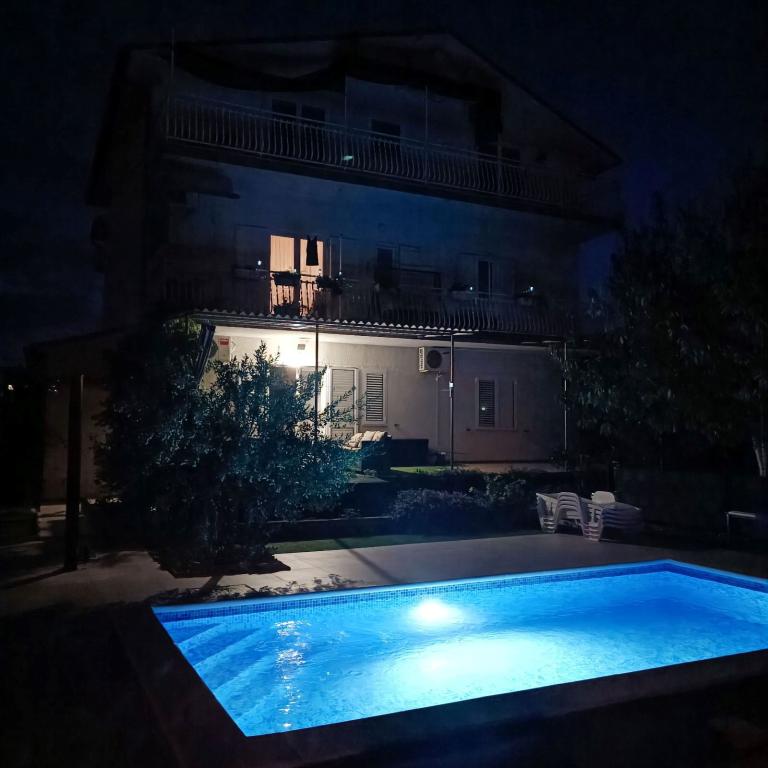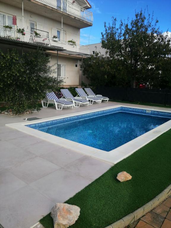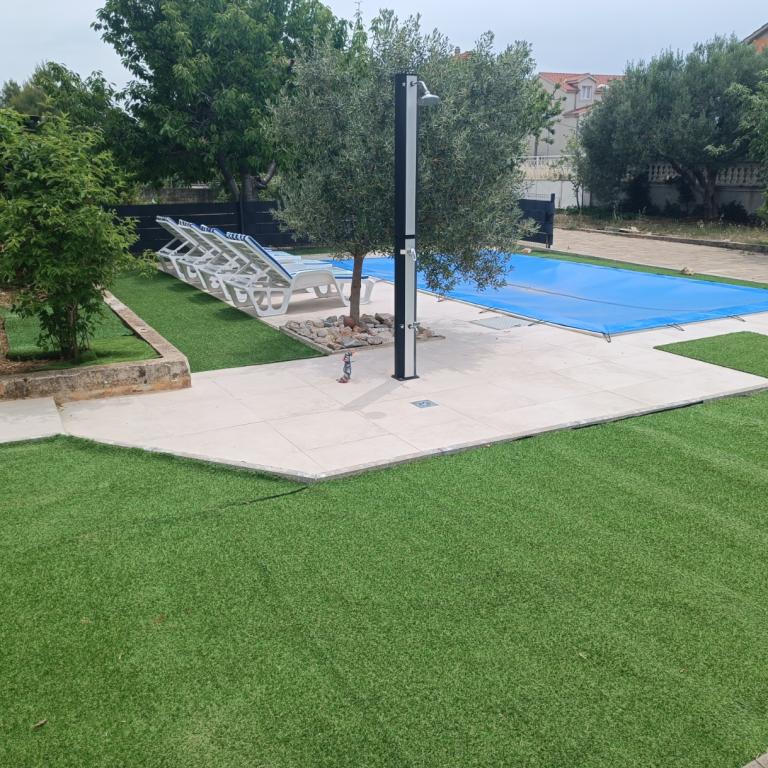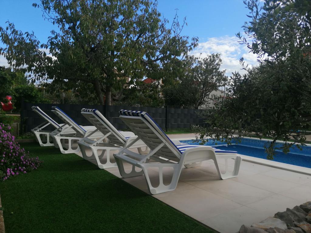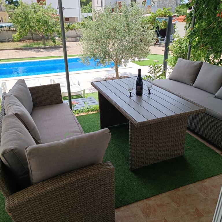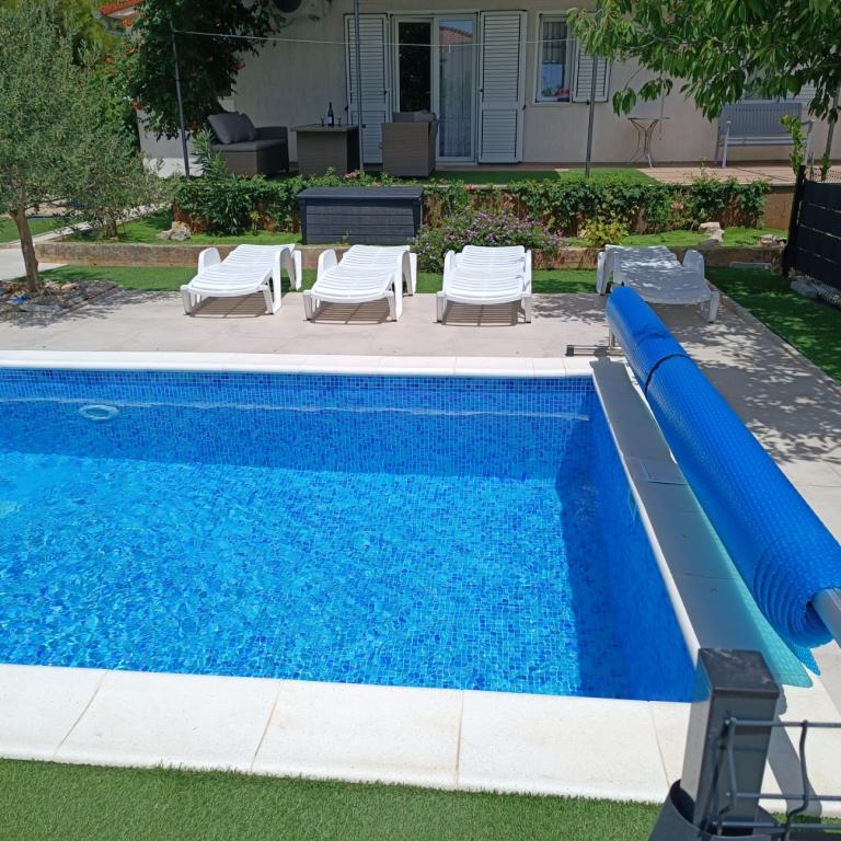 Onlangs gerenoveerde grote appartementen met een buitenzwembad, speciaal voor jou!! Als een vakantiehuis!! Volledig onlangs gerenoveerde keuken met nieuwe apparatuur (koelkast, vriezer, oven, kookplaat, magnetron, waterkoker, vaatwasser, wasmachine, afzuigkap). Serviesgoed en kookgerei. Woonkamer met hoekbank die indien nodig kan worden uitgeklapt tot een ruim bed. Nieuwe tv met satellietzenders. Slaapkamers met ruime tweepersoonsbedden. Beddengoed. Alle kamers zijn voorzien van airconditioning. Twee badkamers met toilet en inloopdouches, onlangs gerenoveerd. Wasmachine, strijkbenodigdheden, haardroger. Stofzuiger en schoonmaakmiddelen, toiletpapier, zeep, handdoeken. Er is ook een terras van 30 m2 met tuinmeubelen, evenals een grill en ligstoelen bij het zwembad. Enorme tuin van 1300 m2 met veel mediterrane bomen. Parkeren in de tuin GRATIS!! De luchthavens van Zadar en Split liggen op ongeveer 60 km afstand. Dichtbij de nationale parken Krka en Kornati
