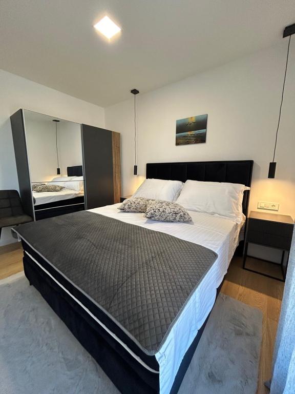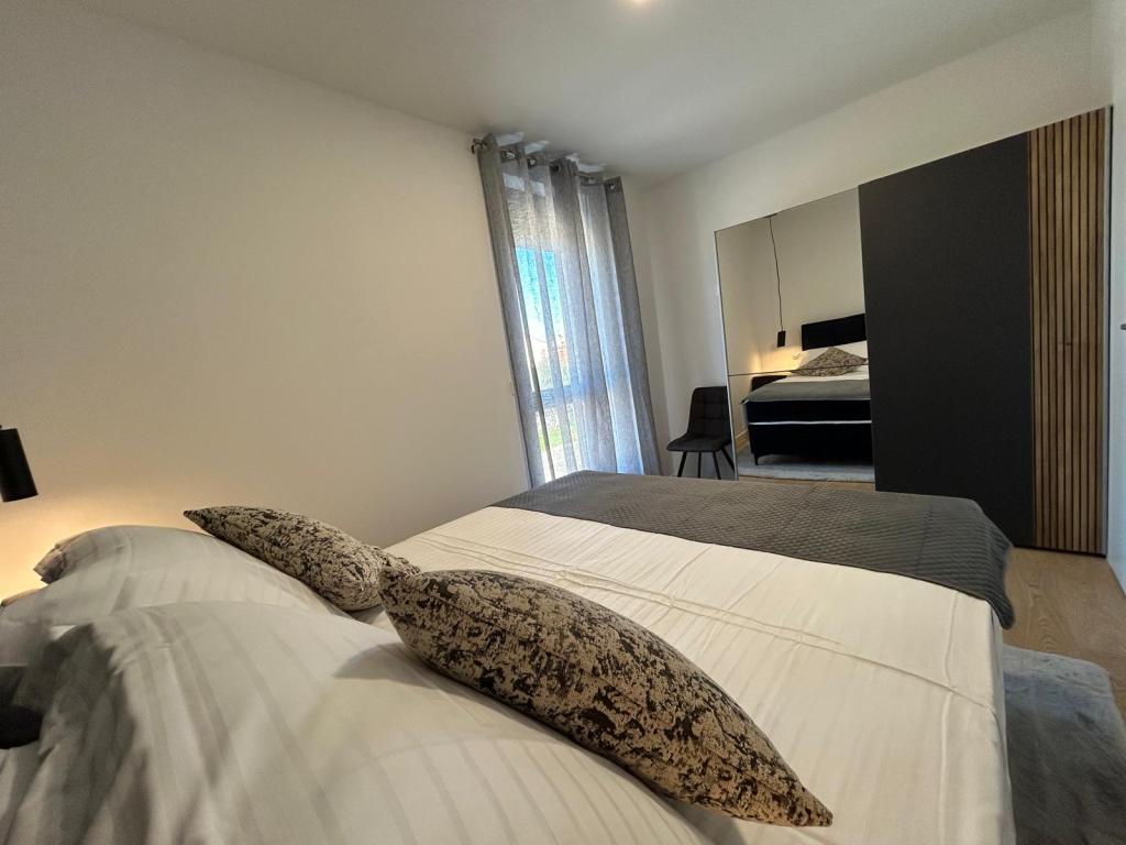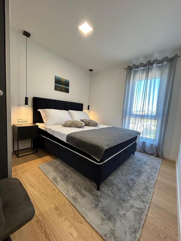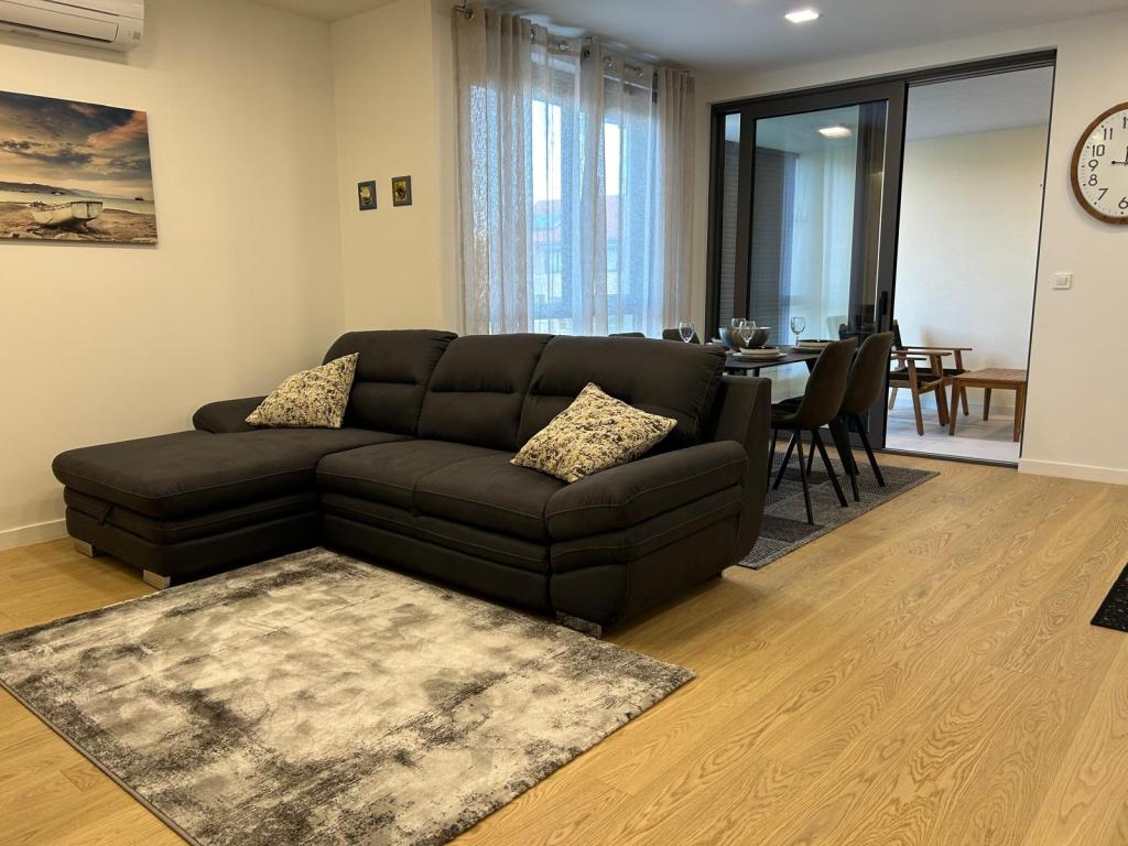 Nieuw!!! Het appartement bestaat uit: twee slaapkamers met grote bedden, een ruime woonkamer met eetkamer en keuken, badkamer en toegang tot de loggia... Modern ingericht appartement in een rustig deel van de stad, beveiligde parkeerplaats, dichtbij het strand, winkels, restaurants, promenade, tennisbanen, café-bar, kinderspeelplaats, dichtbij de jachthaven - mogelijkheid om een boot te huren, ...