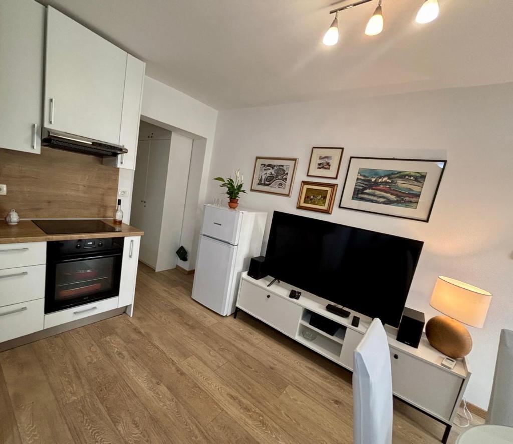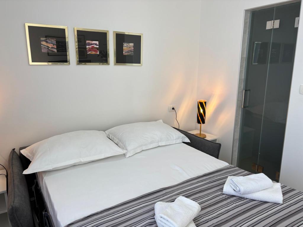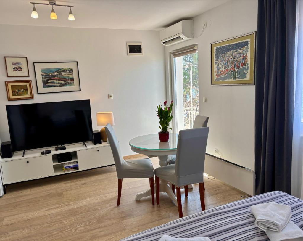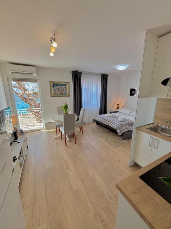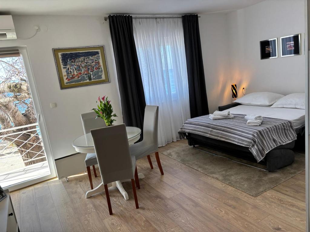 Het studioappartement is volledig en modern ingericht en bevindt zich op de eerste verdieping van een gezinswoning, op slechts 30 meter van de zee en een prachtig kiezelstrand met een geleidelijk aflopende zee. Er is parkeergelegenheid voor een auto voor het huis en in de tuin staat een tuinhuisje met een barbecue en tafels om in de schaduw te zitten. In de buurt vindt u winkels, restaurants, een patisserie en aan de rand van het dorp ligt winkelcentrum Plodine.