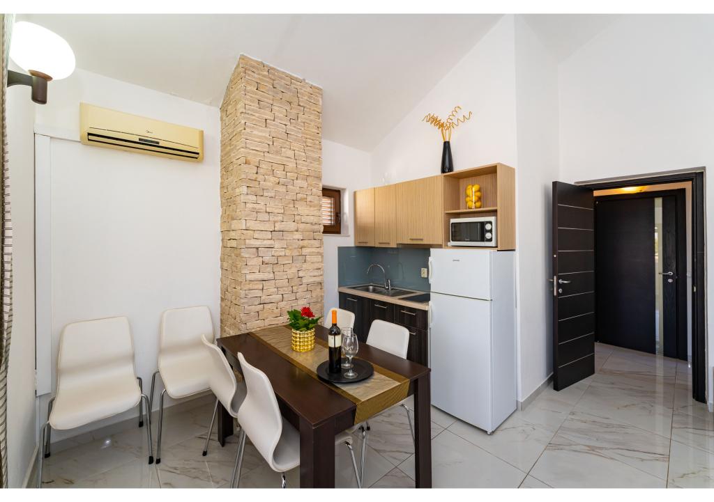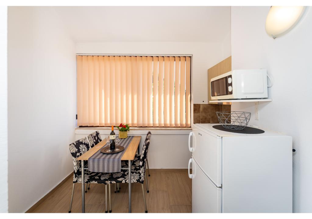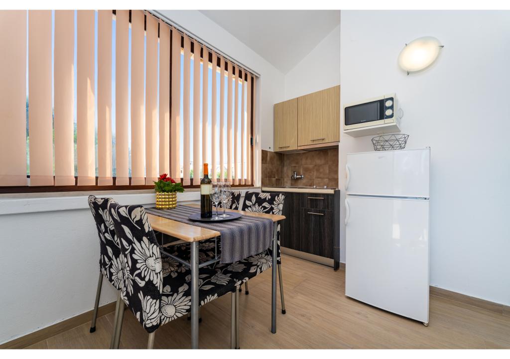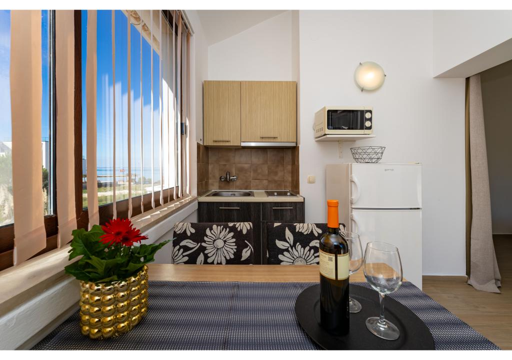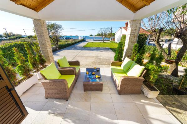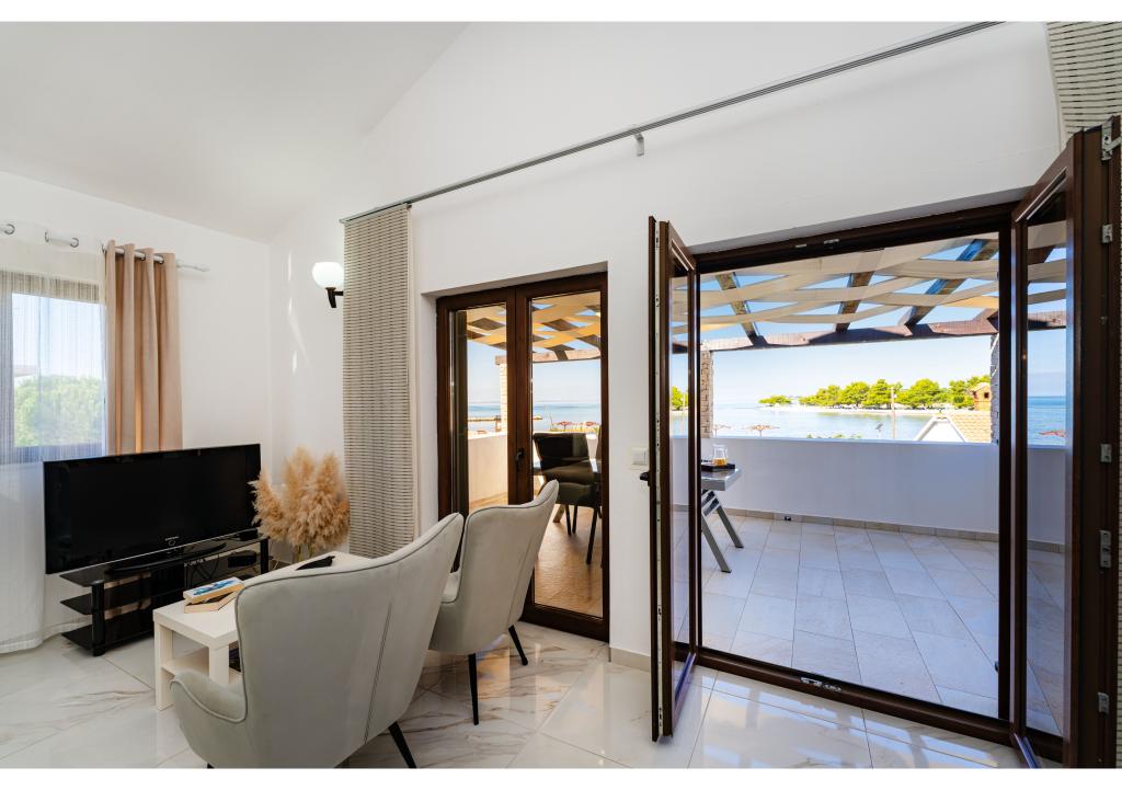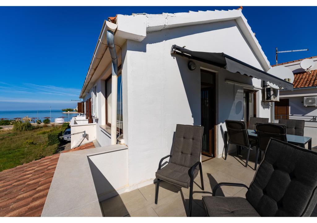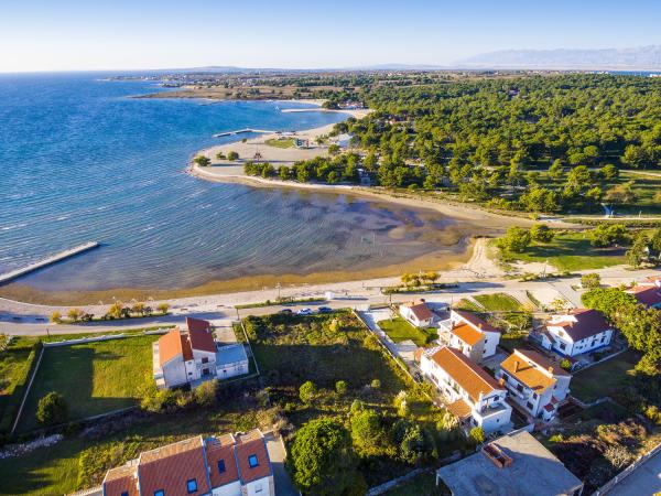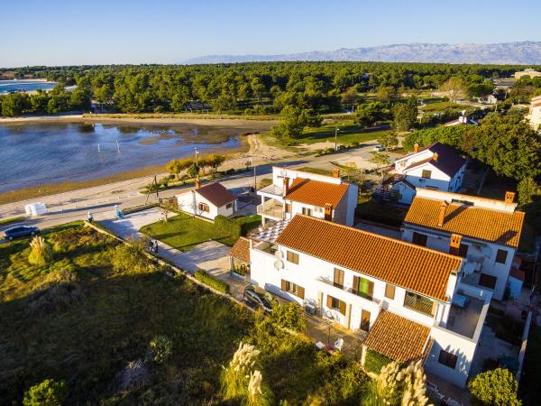 Appartementen op de eerste rij aan zee. Terras met uitzicht op zee. De baai is zanderig en ondiep. De appartementen liggen vlakbij het toeristische centrum van Zaton en zijn voorzien van airconditioning, internet, satelliet-tv, parkeergelegenheid, barbecue, etc.