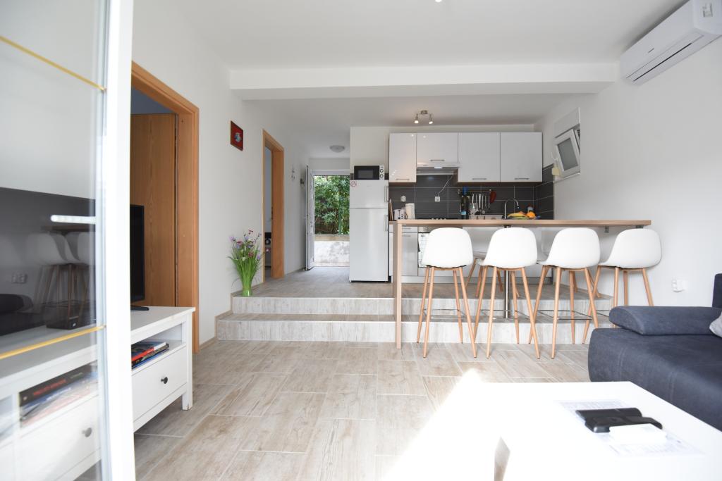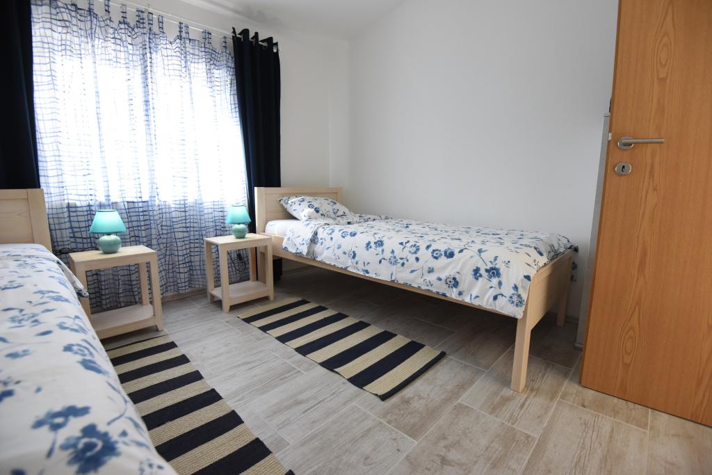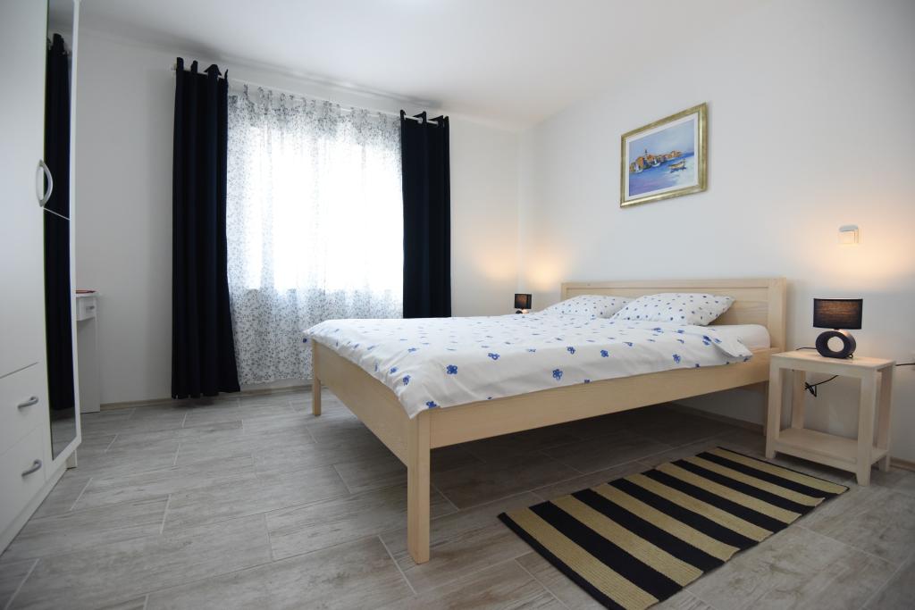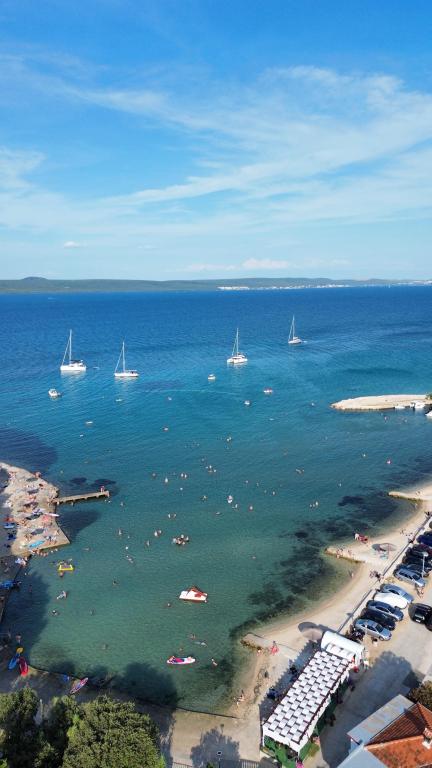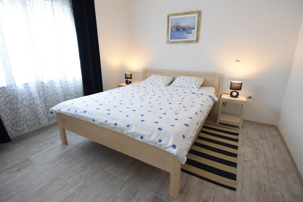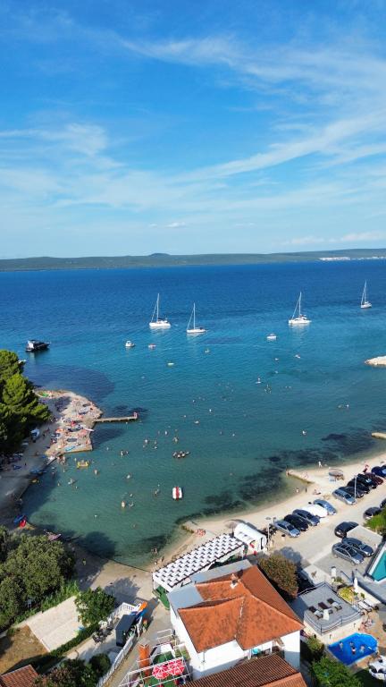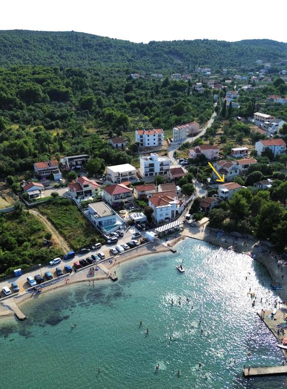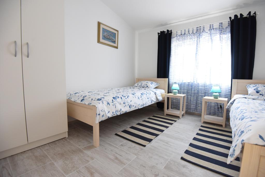 Ruime, modern ingerichte appartementen met zeezicht, direct aan het strand van Matlovac, zijn een ideaal verblijf voor gezinnen met kinderen. Het gebouw met eigen oprit bestaat uit twee units, twee appartementen van elk 75 m² (begane grond en eerste verdieping) met overdekte terrassen. De appartementen zijn voorzien van alle gemakken voor een aangename vakantie en er zijn kinderbedjes en kinderstoelen beschikbaar. Parkeren is mogelijk in de tuin, evenals het gebruik van een barbecue en een buitendouche. Het strand is verhard/kiezelachtig met een zandbodem en zonwering is gemakkelijk te vinden in het dennenbos. Er zijn twee cafés met fastfood naast het strand, met extra voorzieningen: een trampoline voor kinderen en een beachvolleybalveld.