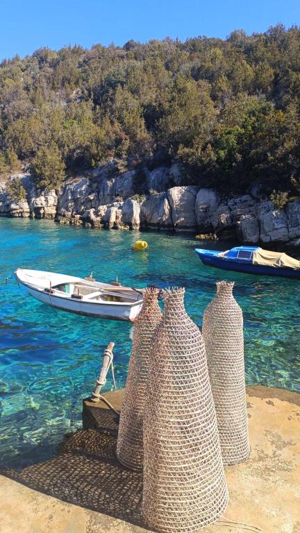 Huis en appartementen op een afgelegen locatie! Gelegen in de baai van Tatinja aan de noordkant van het eiland Hvar, in een kleine, beschutte baai, ver weg van de toeristische drukte. De woning ligt tussen de zee en het mediterrane landschap. Het huis heeft twee appartementen en de begane grond bestaat uit drie kamers: 2+1, 2+1 en 1+1. De dichtstbijzijnde buur woont op 500 meter afstand. Er is water en elektriciteit. Vanaf de hoofdweg is het 1680 meter over een onverharde weg en 1 km over een geasfalteerde weg. Met de auto bent u op 10 meter van het appartement en het huis. De zee ligt op 10 meter afstand en is schoon. Er is een kinderstrand. Er zijn twee appartementen: een met 2+1 slaapkamers, een keuken, woonkamer, toilet, koelkast, open haard en een groot terras met een prachtig uitzicht op zee. Het tweede appartement met 3+2 slaapkamers bestaat uit een slaapkamer, woonkamer, keuken, toilet, twee balkons en een mooi uitzicht op de baai. Het benedengedeelte van het huis heeft drie kamers (2+1, 2+1, 1+1), een toilet, een keuken, een koelkast, een open haard in de keuken en een buitenhaard om te barbecueën, evenals een broodoven. In de buurt liggen Vrboska (3 km), Jelsa (5 km), Stari grad (5 km), Hvar (10 km), een postkantoor, een bank, winkels, cafés, restaurants en alle ander
