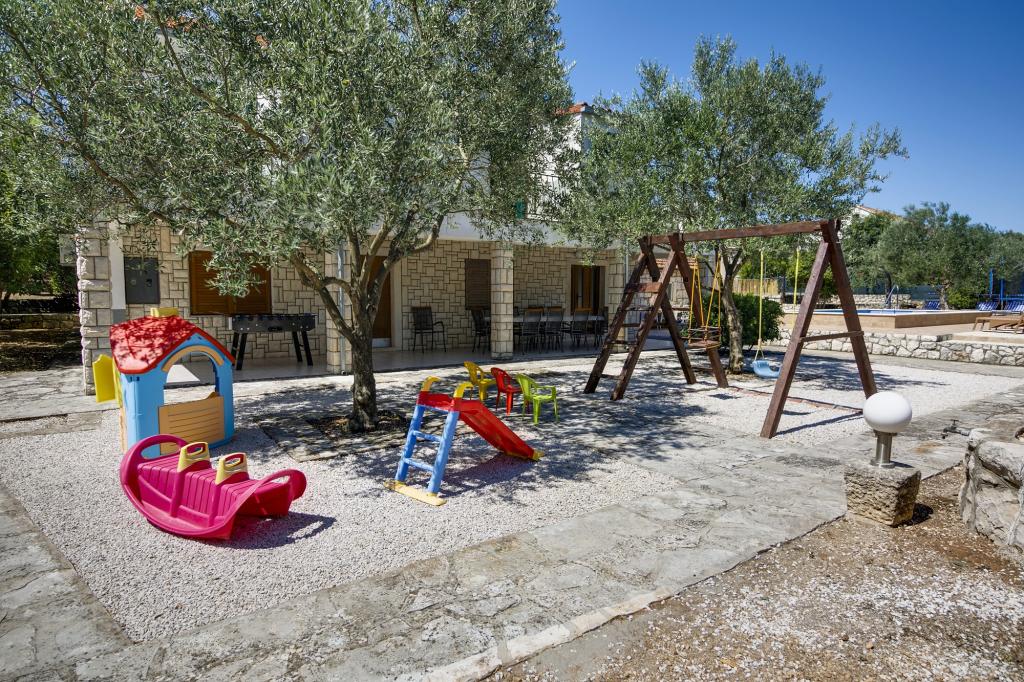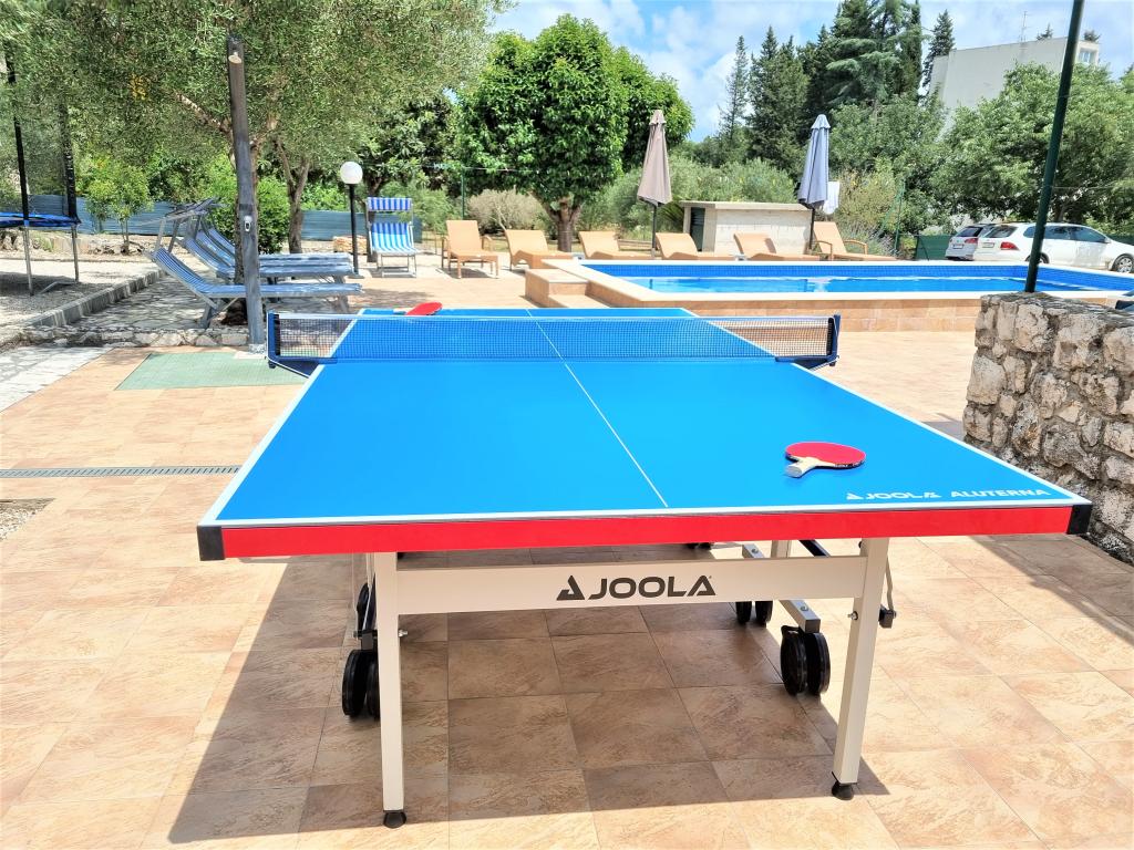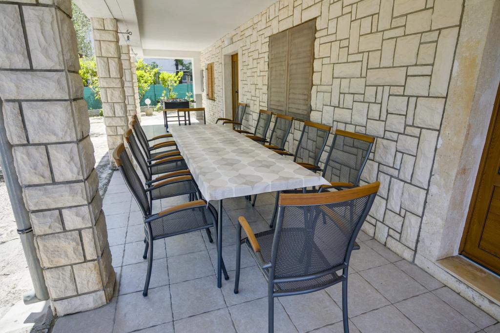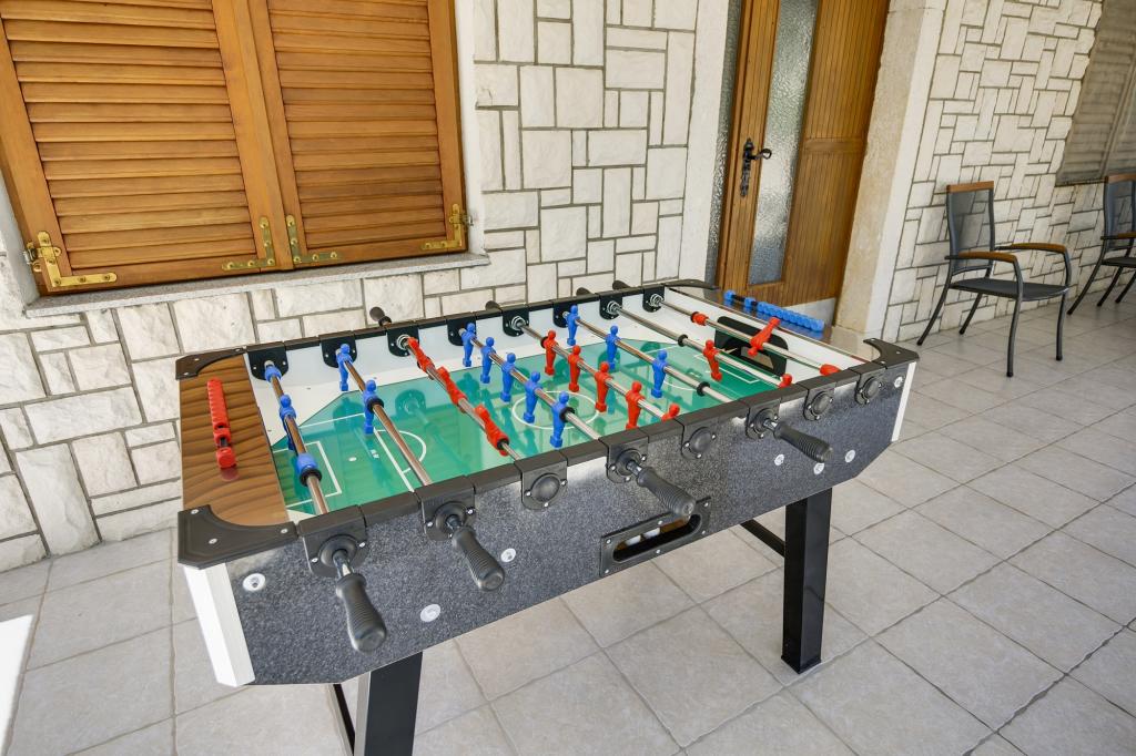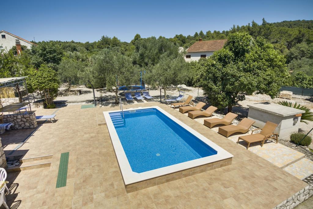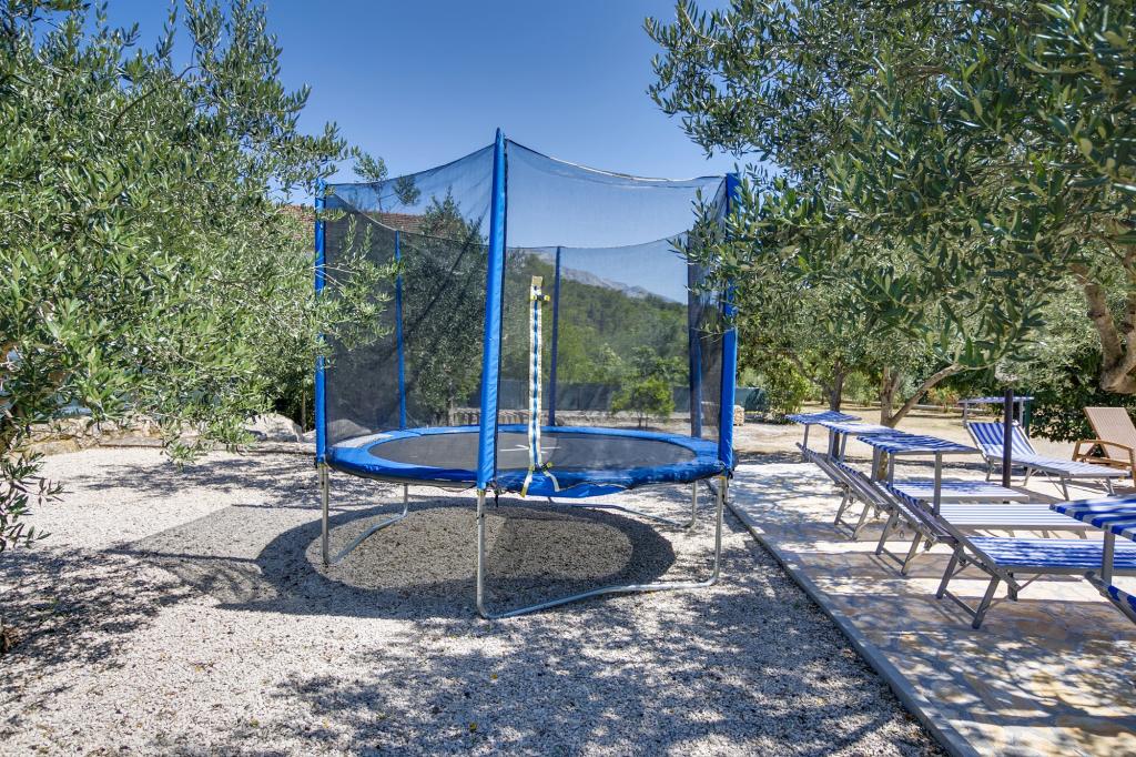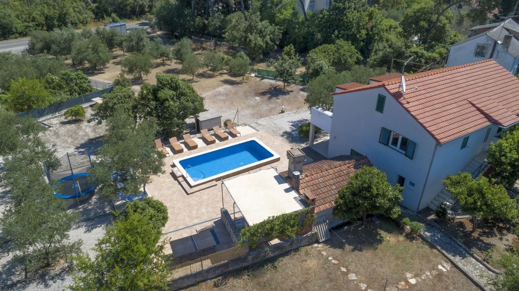 Villa Ivanka is gelegen in de buitenwijken van de stad Korčula op een ruim perceel van 3500m2. en biedt een grote parkeerplaats. Tijdens uw verblijf bent u de enige gasten in het huis, de gastheer is niet aanwezig tijdens uw verblijf. De gemakkelijkste manier om naar het strand te gaan, dat op 300 meter afstand ligt, is te voet. Dit huis biedt 193m2 ruimte voor maximaal 10 plus 2 personen. Het huis bestaat uit twee appartementen, een op de eerste verdieping met vier slaapkamers en een keuken, en de andere op de begane grond met een slaapkamer, badkamer en kitchenette. Elke kamer is ruim, verbonden met een badkamer, terras en airconditioning. Voor het huis is er een buitenzwembad van 24m2 en een diepte van 1,65m, met 11 hoogwaardige ligstoelen, tafeltennis, professionele tafelvoetbal en een trampoline. Naast het zwembad is er een zomerkeuken voor het bereiden van eten, naast de keuken is er een buitengrill voor gezellige gezelligheid en ontspanning. Het is toegestaan om een huisdier mee te nemen naar de wooneenheid. De stad Korcula is een aangename wandeling van een paar minuten langs de zee.
