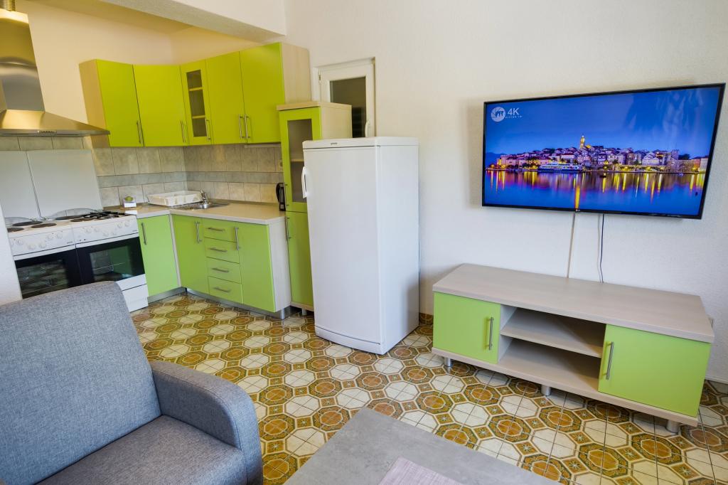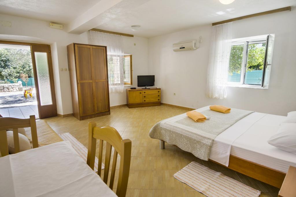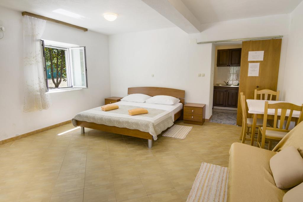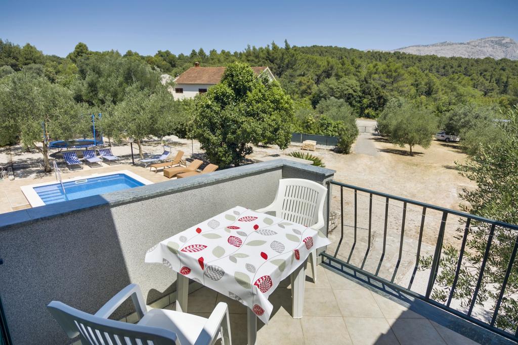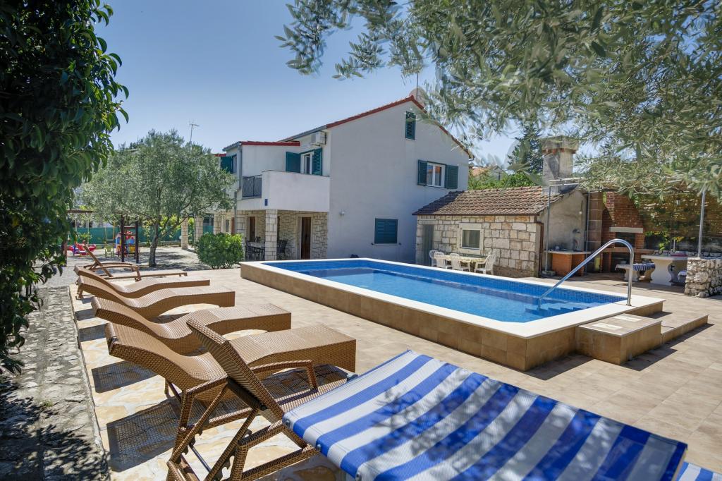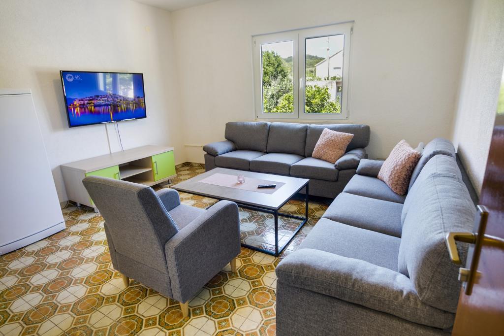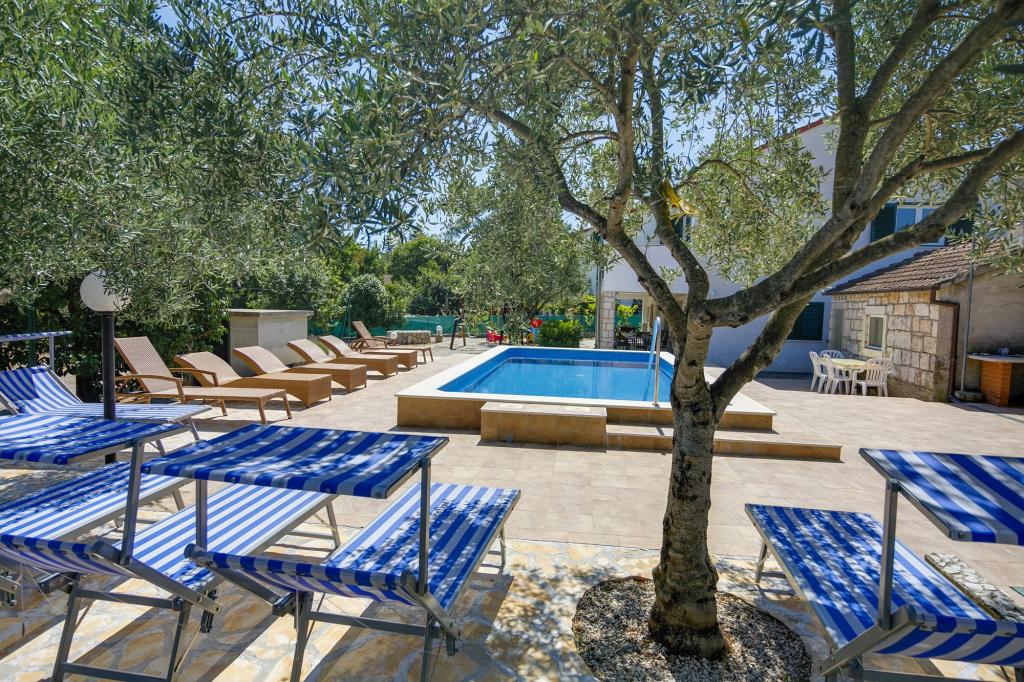 Villa Ivanka is gelegen in de buitenwijken van de stad Korčula op een ruim perceel van 3500m2. en biedt een grote parkeerplaats. Tijdens uw verblijf bent u de enige gasten in het huis, de gastheer is niet aanwezig tijdens uw verblijf. De gemakkelijkste manier om naar het strand te gaan, dat op 300 meter afstand ligt, is te voet. Dit huis biedt 193m2 ruimte voor maximaal 10 plus 2 personen. Het huis bestaat uit twee appartementen, een op de eerste verdieping met vier slaapkamers en een keuken, en de andere op de begane grond met een slaapkamer, badkamer en kitchenette. Elke kamer is ruim, verbonden met een badkamer, terras en airconditioning. Voor het huis is er een buitenzwembad van 24m2 en een diepte van 1,65m, met 11 hoogwaardige ligstoelen, tafeltennis, professionele tafelvoetbal en een trampoline. Naast het zwembad is er een zomerkeuken voor het bereiden van eten, naast de keuken is er een buitengrill voor gezellige gezelligheid en ontspanning. Het is toegestaan om een huisdier mee te nemen naar de wooneenheid. De stad Korcula is een aangename wandeling van een paar minuten langs de zee.