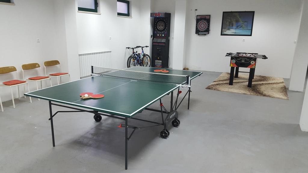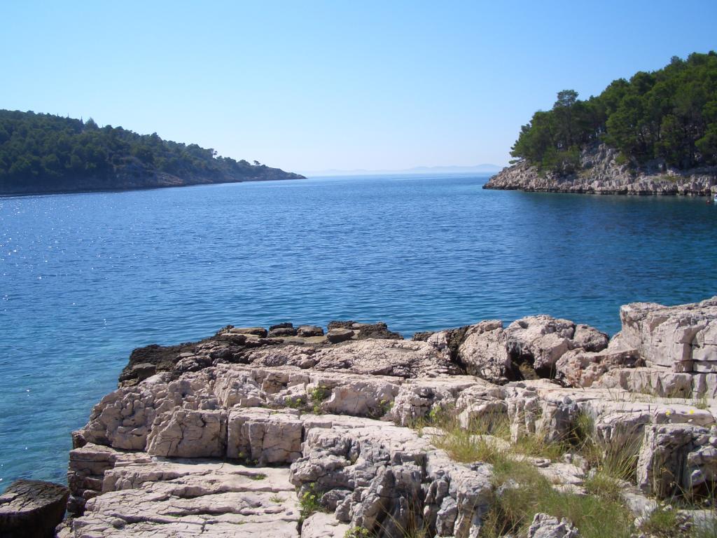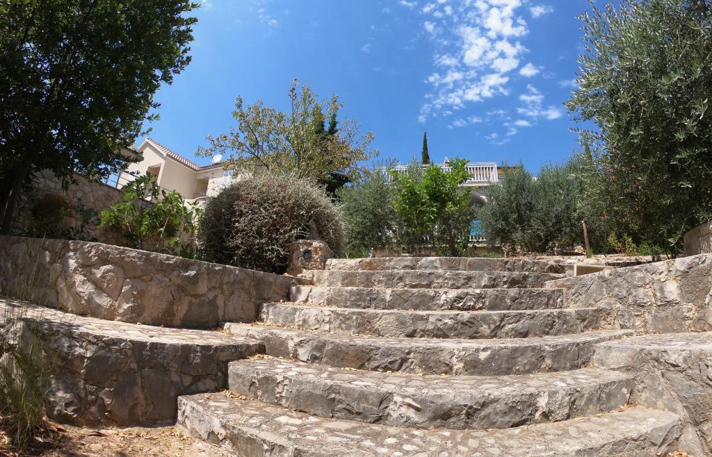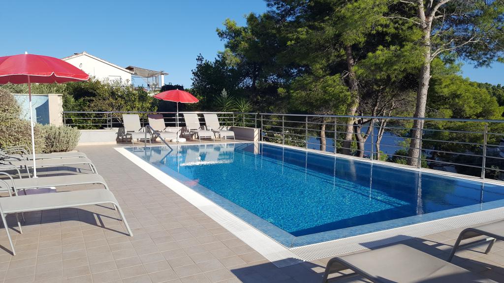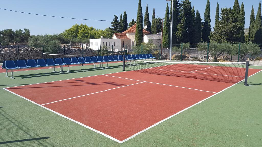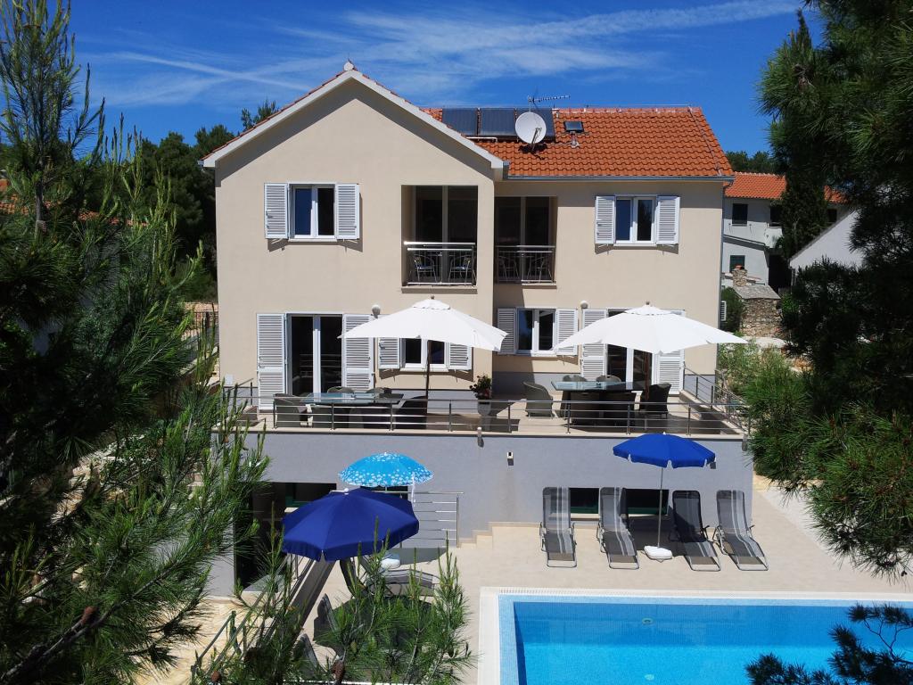 The detached holiday villa has a heated private pool and is located in the quiet and crystal-clear Osibova Bay, just 30 m from a small pebble beach. The house includes 4 kayaks and 8 bicycles. In the town of Milna, 2 km away, you'll find everything you need. On the way there, you'll find public sports fields (tennis, football, basketball and beach volleyball) that can be used. The modernly equipped villa consists of two identical residential units. In total, it features 6 bedrooms, 7 bathrooms, 2 living rooms with integrated kitchens, and a large shared sun terrace. In the basement, you'll find a 130 m² recreation room with games and fitness equipment, including billiards, table tennis and foosball. Facilities include Wi-Fi, private parking and a garden with a barbecue. The house is fully air-conditioned (each room with individually controllable air conditioning).