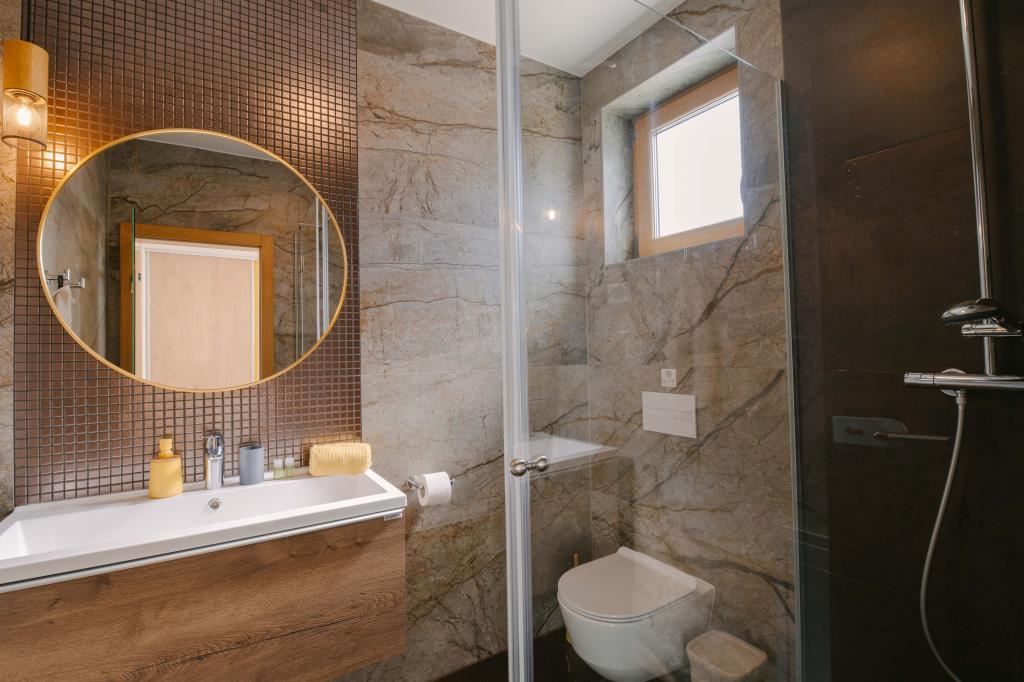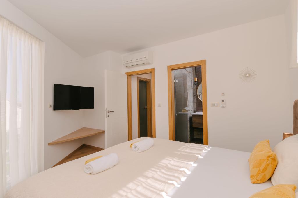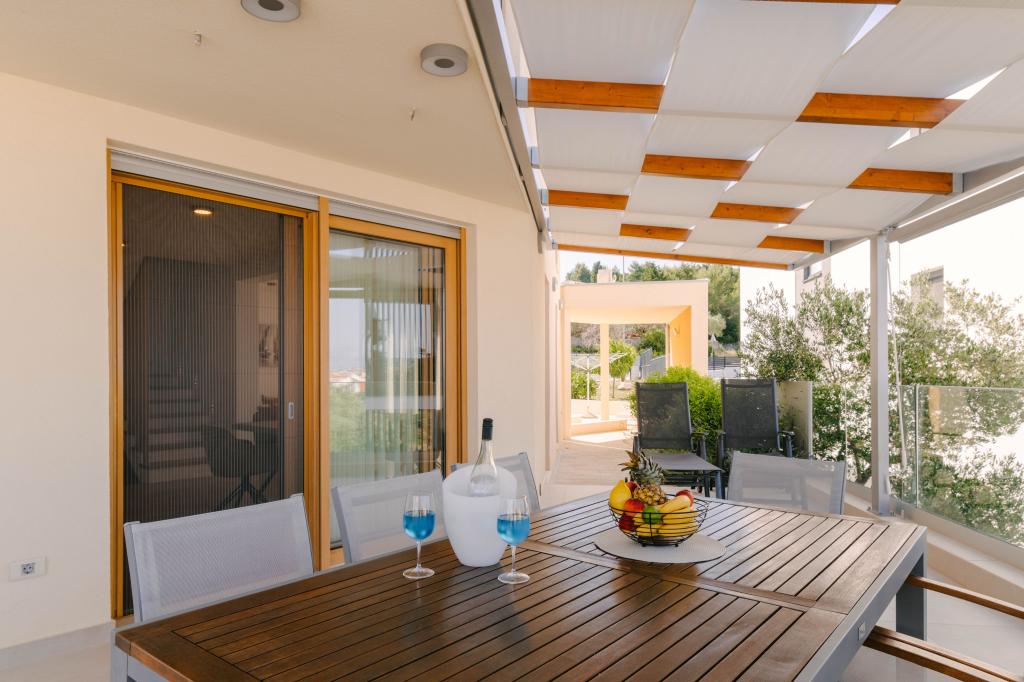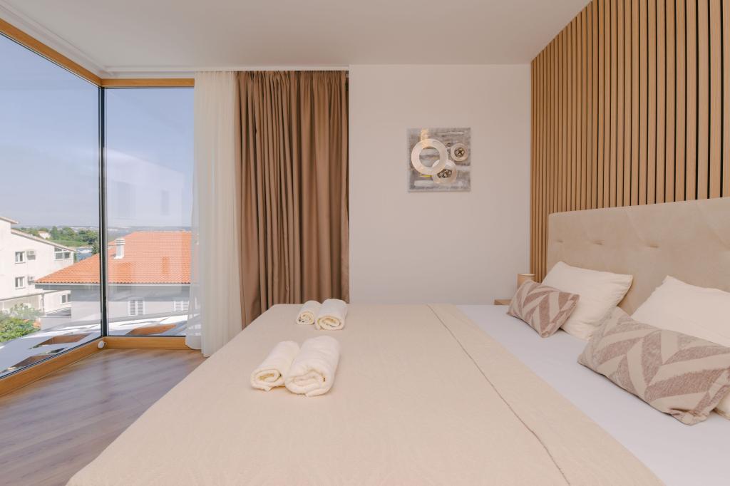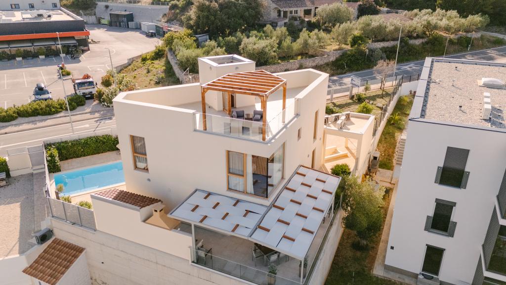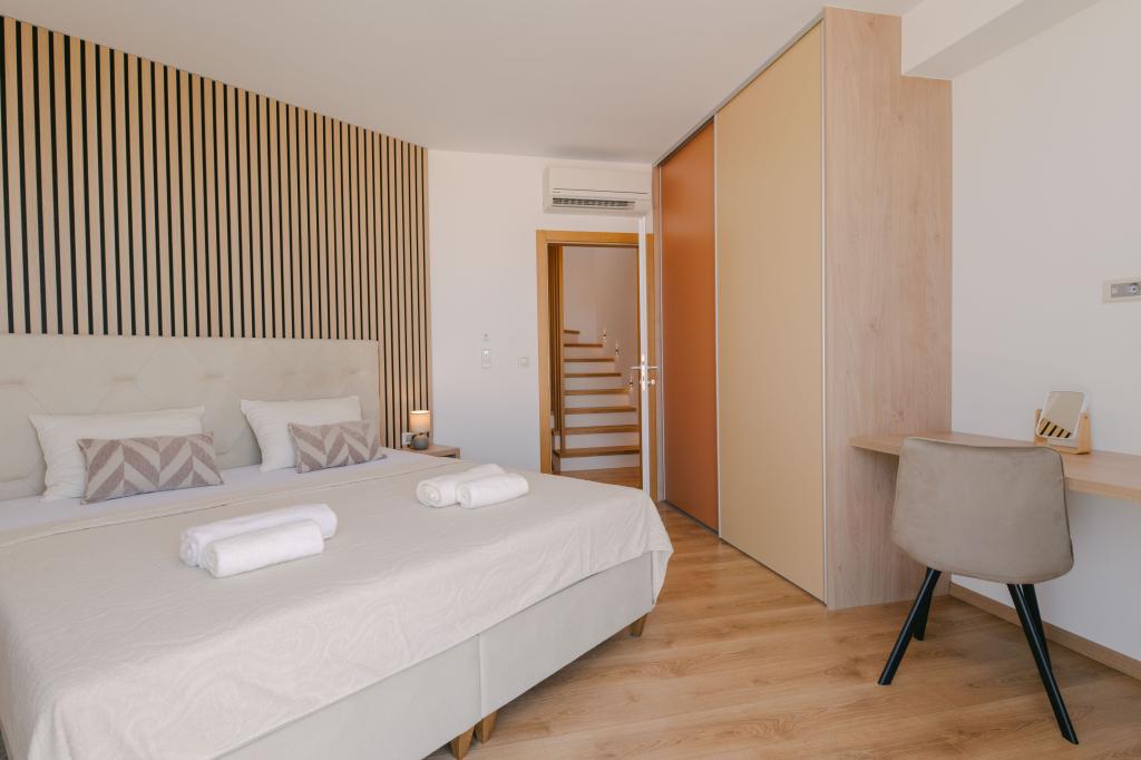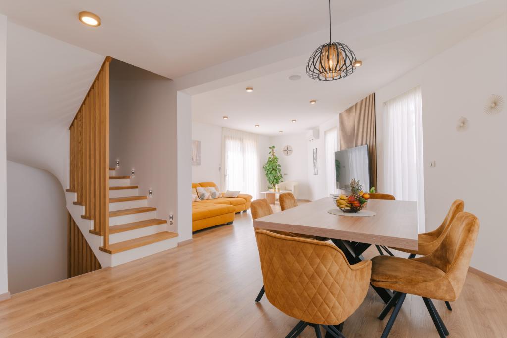 Op de bovenverdieping bevinden zich drie moderne slaapkamers, terwijl er in de kelder een gastenkamer is. Alle badkamers zijn voorzien van hoogwaardige Grohe- en Laufen-kranen, prestigieuze designkeramische tegels en elegante glazen deuren. Het huis is officieel gecategoriseerd door het Ministerie van Toerisme van de Republiek Kroatië, waardoor het comfortabel plaats biedt aan 9, zelfs 10 gasten. De open woon- en eetkamer, evenals elke slaapkamer, zijn voorzien van individuele airconditioning met een stille stand, ideaal voor een goede nachtrust. De moderne keuken, van het bekende Oostenrijkse merk DanKüchen, is volledig uitgerust met hoogwaardige apparatuur, waaronder een koelkast met ijsblokjesmachine en een waterkoeler.