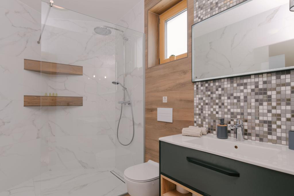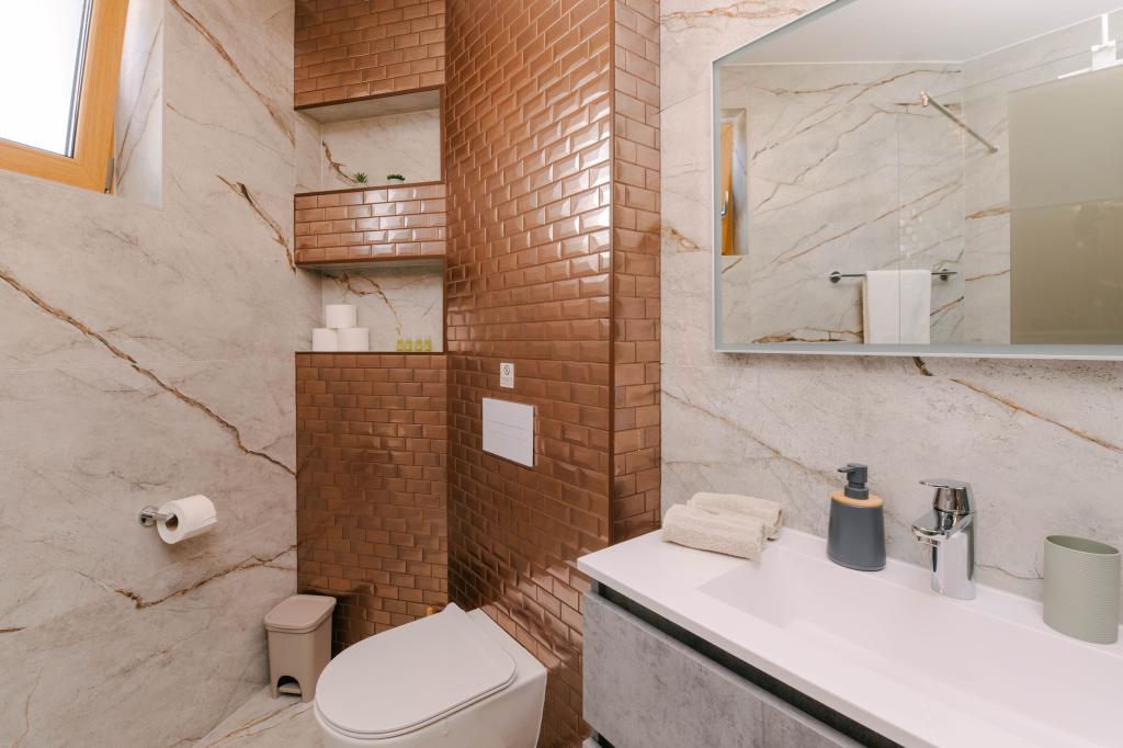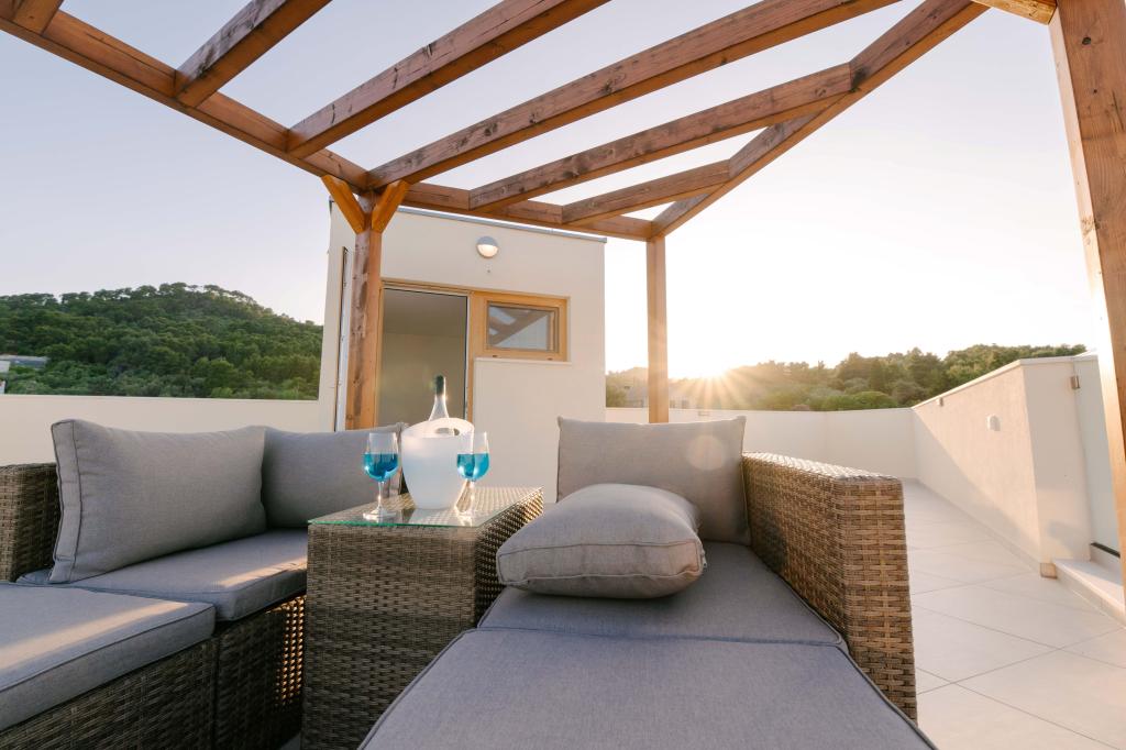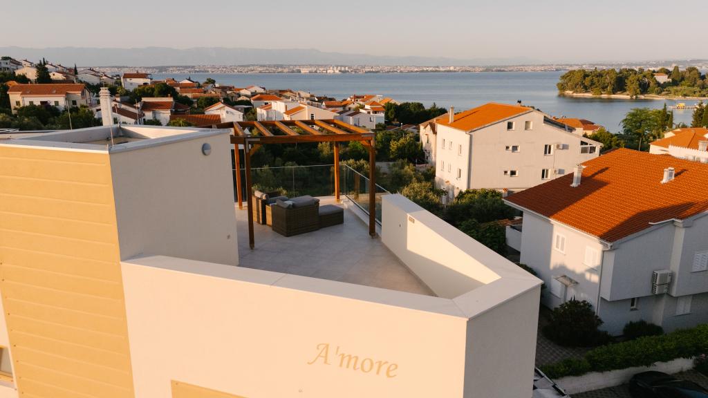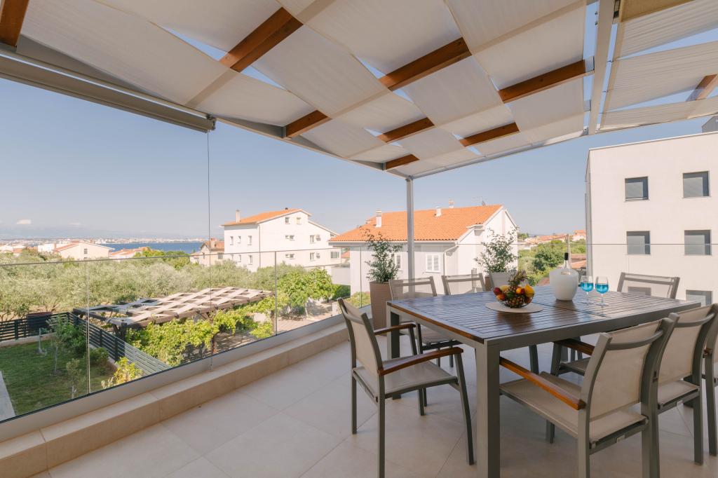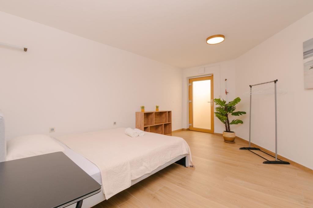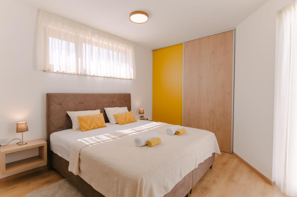 Op de bovenverdieping bevinden zich drie moderne slaapkamers, terwijl er in de kelder een gastenkamer is. Alle badkamers zijn voorzien van hoogwaardige Grohe- en Laufen-kranen, prestigieuze designkeramische tegels en elegante glazen deuren. Het huis is officieel gecategoriseerd door het Ministerie van Toerisme van de Republiek Kroatië, waardoor het comfortabel plaats biedt aan 9, zelfs 10 gasten. De open woon- en eetkamer, evenals elke slaapkamer, zijn voorzien van individuele airconditioning met een stille stand, ideaal voor een goede nachtrust. De moderne keuken, van het bekende Oostenrijkse merk DanKüchen, is volledig uitgerust met hoogwaardige apparatuur, waaronder een koelkast met ijsblokjesmachine en een waterkoeler.