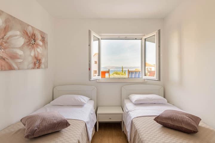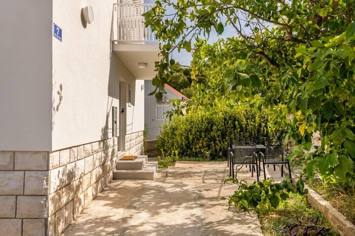 Onlangs gerenoveerd vakantiehuis in het centrum van Sutivan, op een paar minuten van het strand met een prachtig uitzicht op de zee. Tuinhuis Sutivan ligt op een perceel van 800m2 met een ruime mediterrane tuin en biedt plaats aan 8+1 gasten in 4 slaapkamers. De begane grond wordt gedomineerd door een grote open woon-/eetkamer met open haard voor koelere avonden en een volledig uitgeruste keuken met oven en vaatwasser. Vanuit de woonkamer is er toegang tot het buiteneetterras met uitzicht op de zee en ligstoelen. Op dezelfde verdieping bevindt zich een slaapkamer met twee aparte bedden en een badkamer met douche. De trap leidt naar de bovenverdieping met drie slaapkamers (twee met een tweepersoonsbed en een balkon, één met twee eenpersoonsbedden) en twee badkamers. In de kelder is er een tafelvoetbaltafel en een consolespeler met een extra badkamer met een wasmachine. Parkeerplaats voor twee auto's direct naast de ingang van het huis, buiten is er een traditionele barbecue met een extra tafel en stoelen. In de tuin staan olijfbomen en een grote vijgenboom, toegang tot het strand via de tuin.