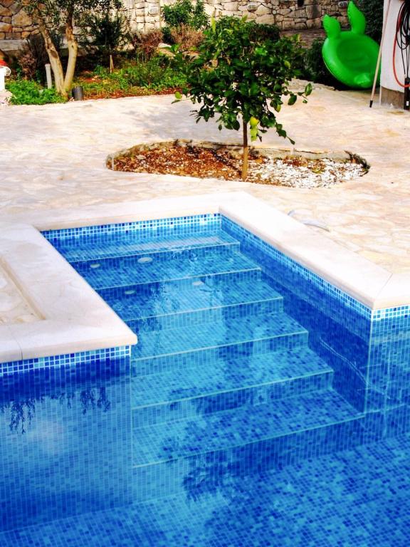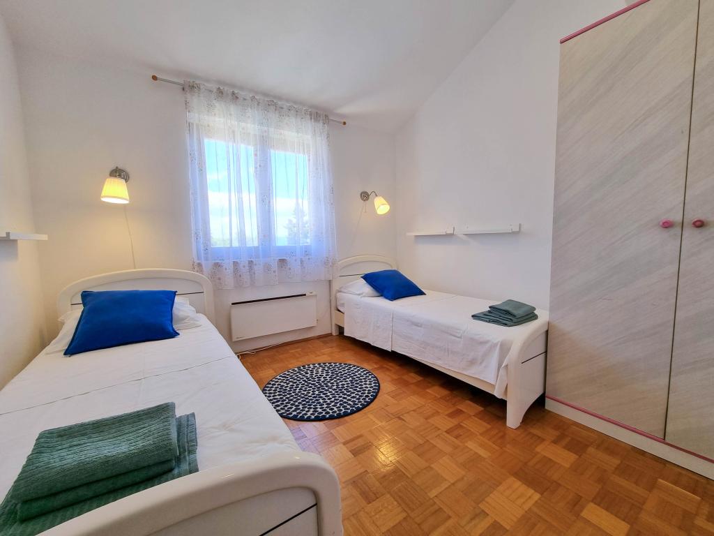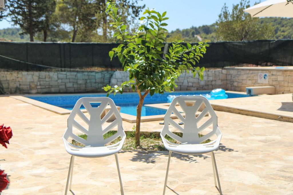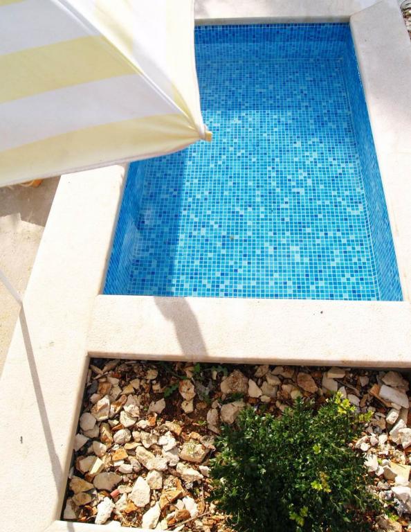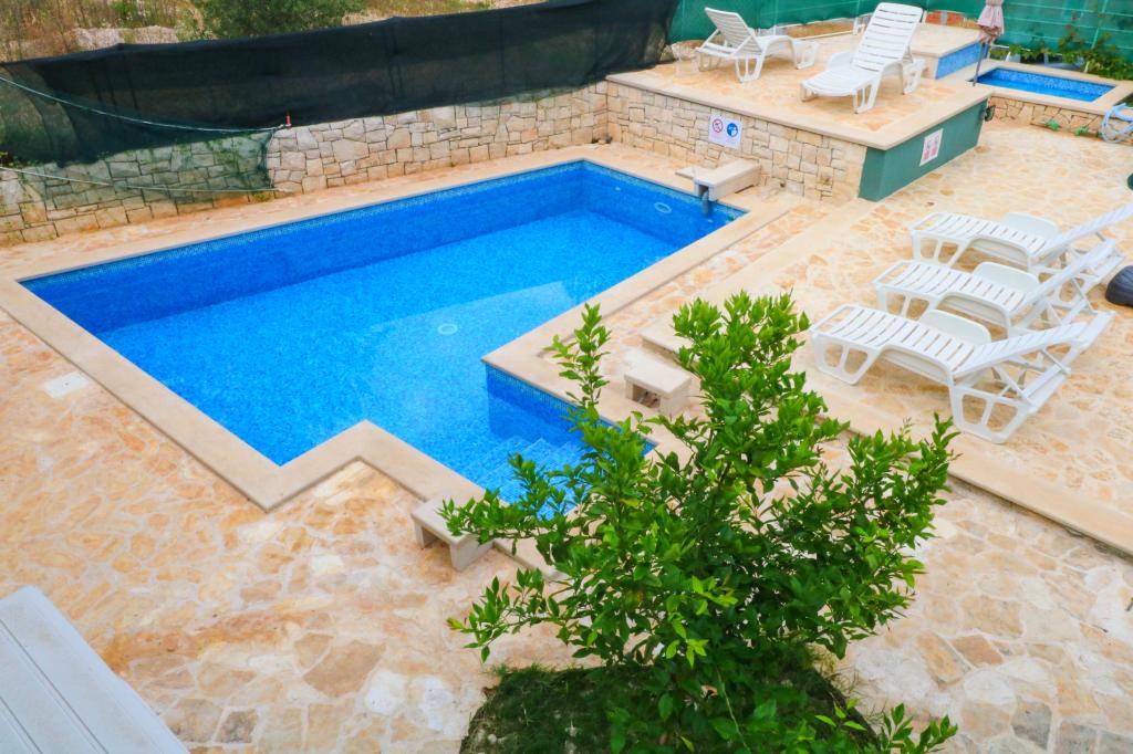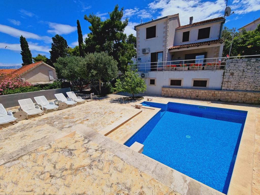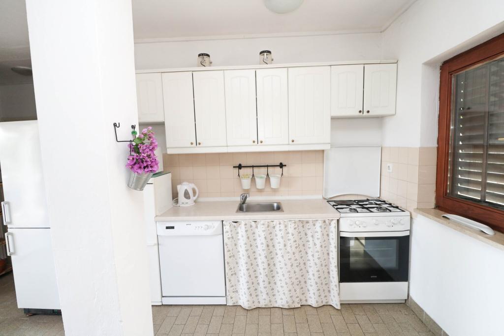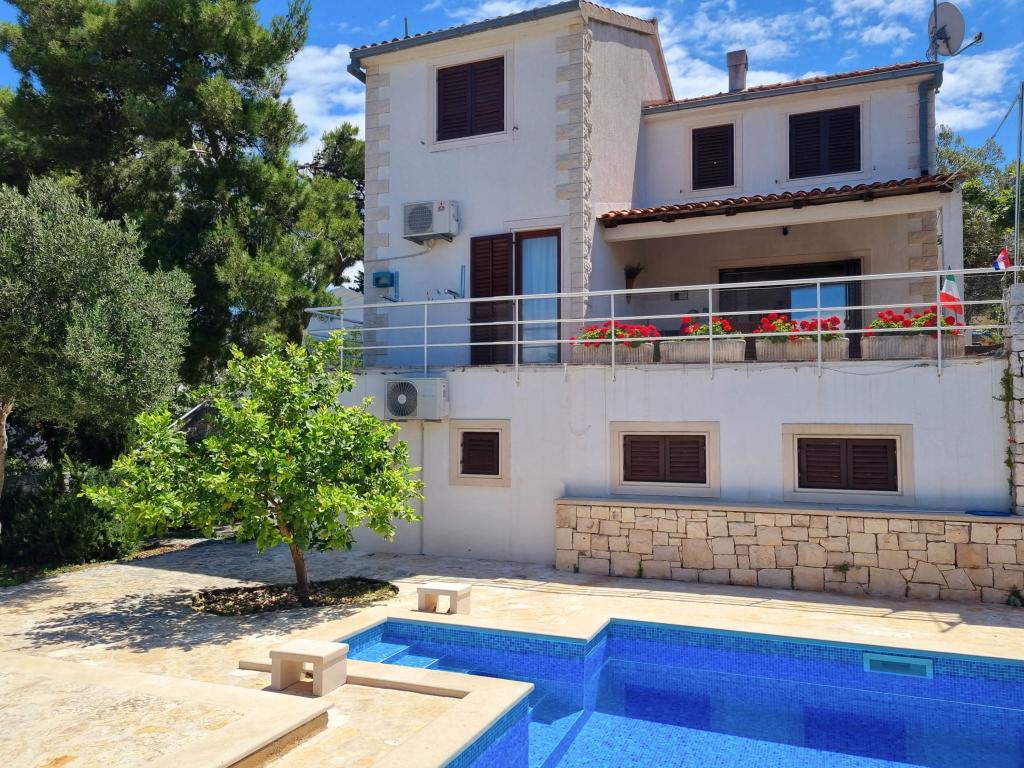 Villa Dvornik biedt volledige privacy in comfortabele accommodatie voor gezinnen met kinderen, studentengroepen en familiebijeenkomsten van meerdere generaties. Het heeft uitzicht op zee en ligt op slechts 300 meter van de zee en het strand. Woonoppervlak van 110 m2 + 25 m2 terras, grote tuin van 280 m2 bedekt met stenen platen, met 4 kamers (8 bedden) en twee zwembaden. Een groot zwembad met 4 massagejets van 24 m2 en een diepte van 1,5 m voor volwassenen en een kleiner bad bestemd voor kleine kinderen van 3,5 m2 en een diepte van 0,5 m. Beide baden worden verwarmd door middel van zonnecollectoren van 10 m2 waardoor de temperatuur van het zwembad van 21 °C in mei en oktober. De buitendouche en grill bevinden zich in de omgeving van het huis. Het huis is voorzien van airconditioning en heeft toegang tot draadloos internet. Er zijn drie parkeerplaatsen voorzien op het terrein rondom het huis. Huisdieren zijn welkom.