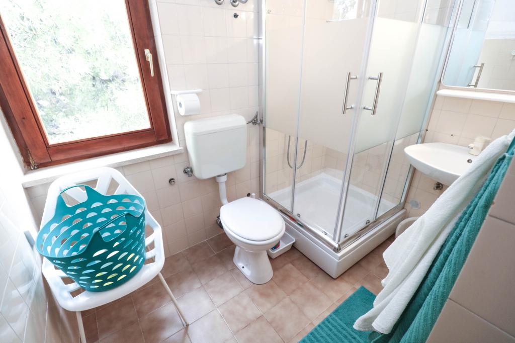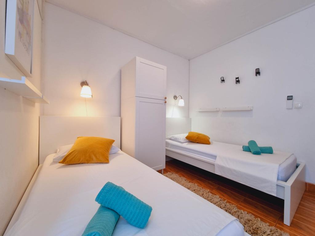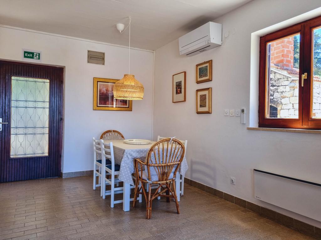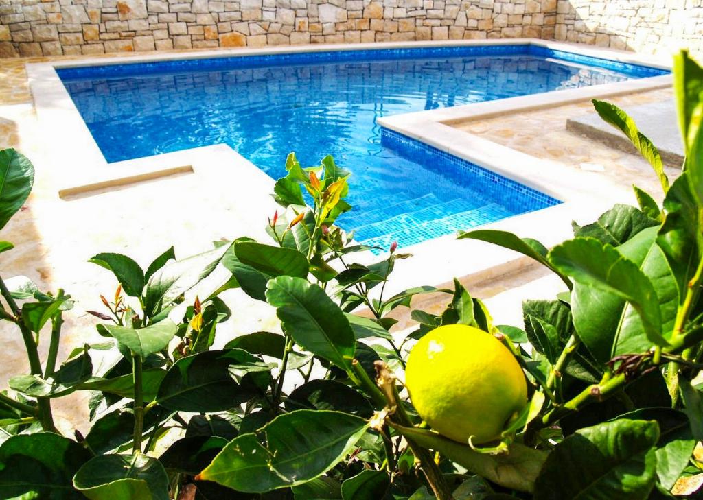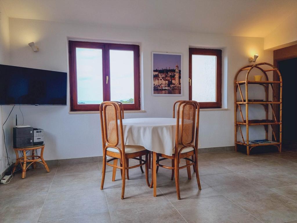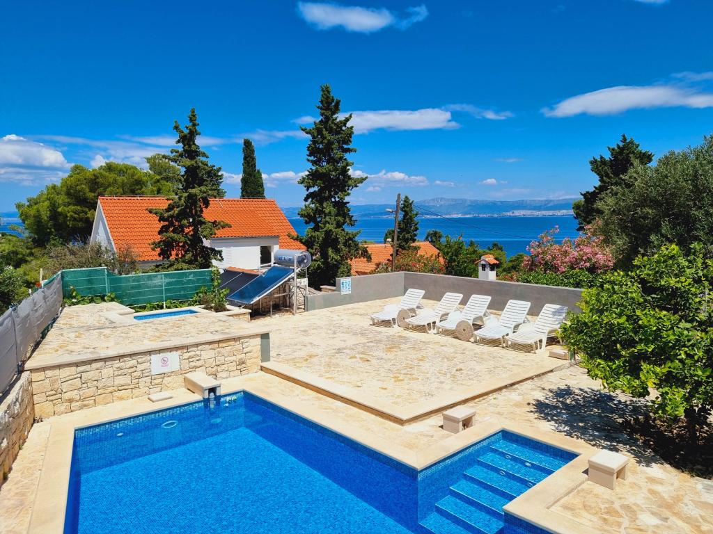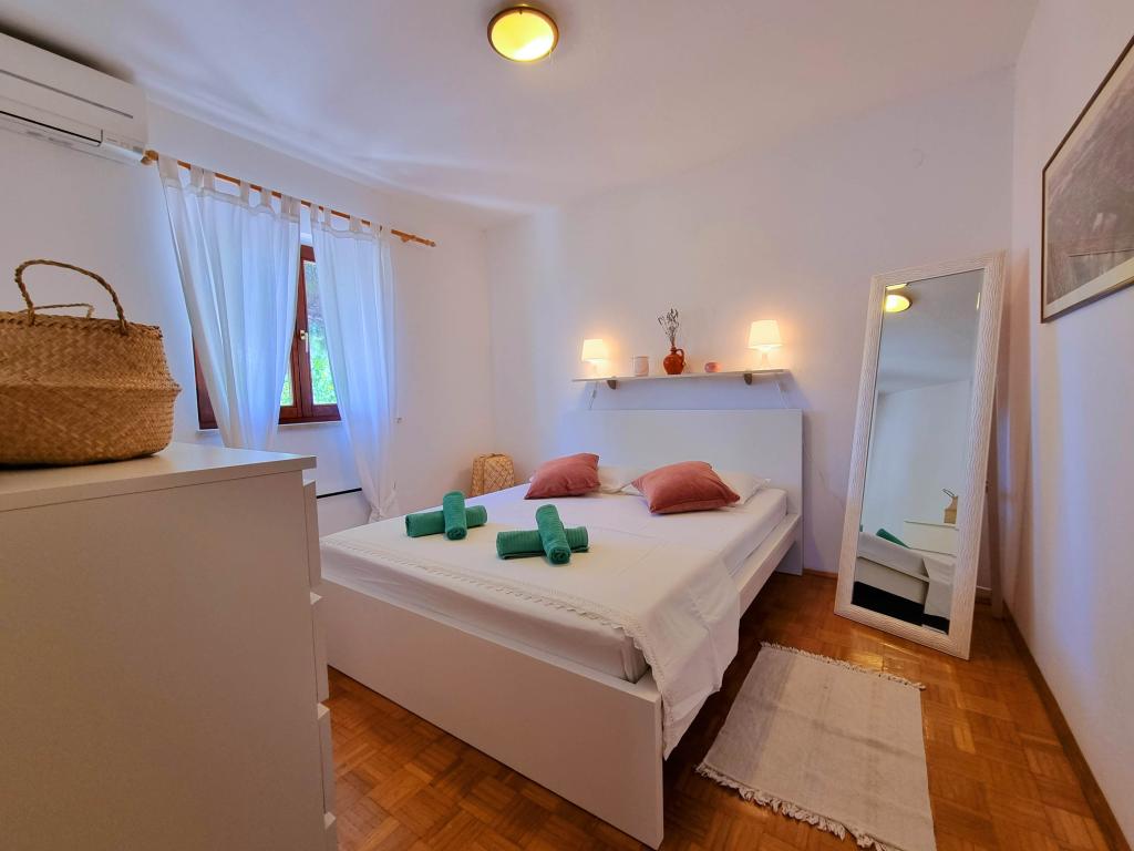 Villa Dvornik biedt volledige privacy in comfortabele accommodatie voor gezinnen met kinderen, studentengroepen en familiebijeenkomsten van meerdere generaties. Het heeft uitzicht op zee en ligt op slechts 300 meter van de zee en het strand. Woonoppervlak van 110 m2 + 25 m2 terras, grote tuin van 280 m2 bedekt met stenen platen, met 4 kamers (8 bedden) en twee zwembaden. Een groot zwembad met 4 massagejets van 24 m2 en een diepte van 1,5 m voor volwassenen en een kleiner bad bestemd voor kleine kinderen van 3,5 m2 en een diepte van 0,5 m. Beide baden worden verwarmd door middel van zonnecollectoren van 10 m2 waardoor de temperatuur van het zwembad van 21 °C in mei en oktober. De buitendouche en grill bevinden zich in de omgeving van het huis. Het huis is voorzien van airconditioning en heeft toegang tot draadloos internet. Er zijn drie parkeerplaatsen voorzien op het terrein rondom het huis. Huisdieren zijn welkom.